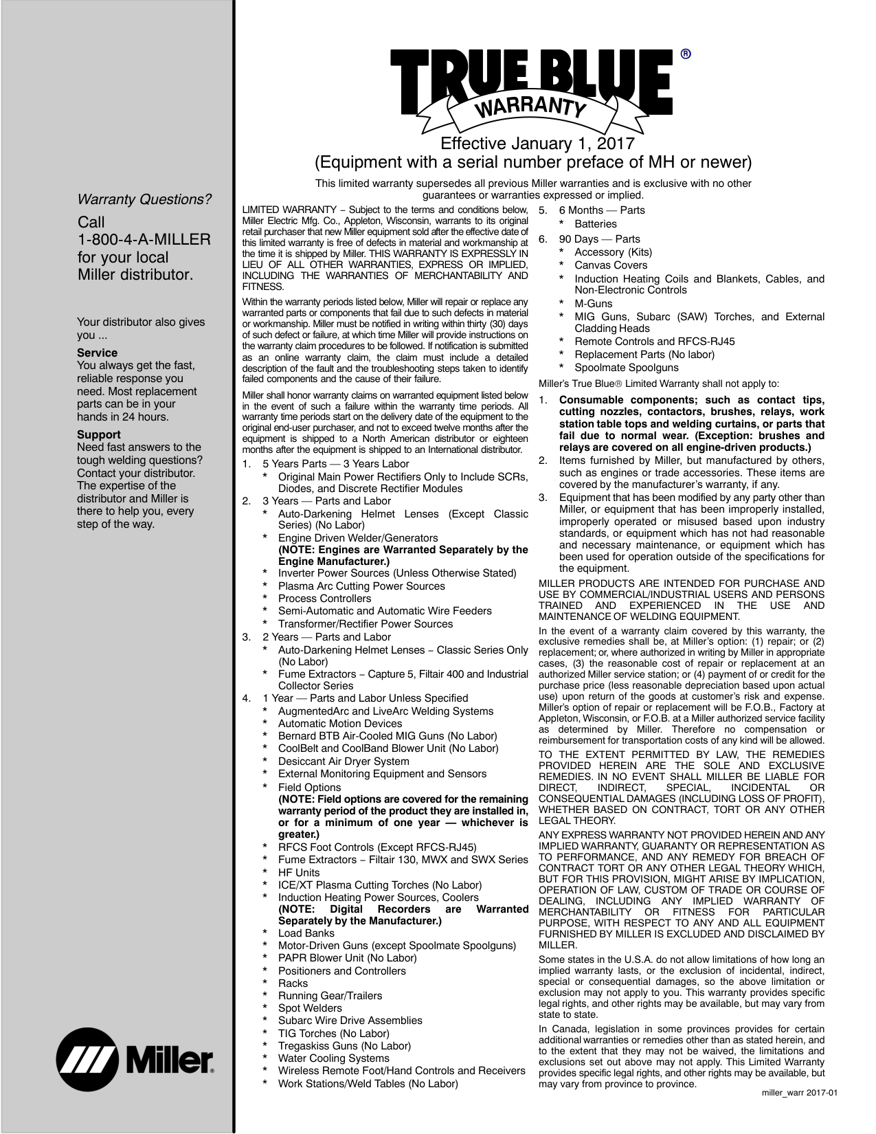 Effective January 1, 2017 (Equipment with a serial number preface of MH or newer) This limited warranty supersedes all previous Miller warranties and is exclusive with no other guarantees or warranties expressed or implied. LIMITED WARRANTY − Subject to the terms and conditions below, Miller Electric Mfg. Co., Appleton, Wisconsin, warrants to its original retail purchaser that new Miller equipment sold after the effective date of this limited warranty is free of defects in material and workmanship at the time it is shipped by Miller. THIS WARRANTY IS EXPRESSLY IN