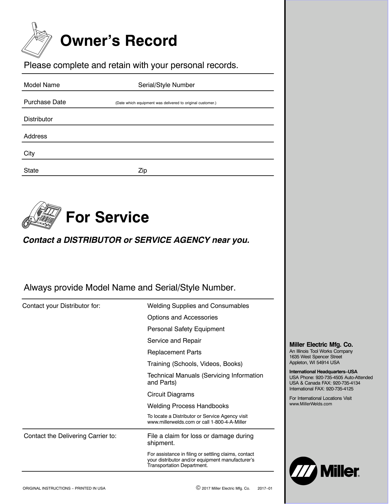 © 2017 Miller Electric Mfg. Co. 2017−01 Miller Electric Mfg. Co. An Illinois Tool Works Company 1635 West Spencer Street Appleton, WI 54914 USA International Headquarters−USA USA Phone: 920-735-4505 Auto-Attended USA & Canada FAX: 920-735-4134 International FAX: 920-735-4125 For International Locations Visit www.MillerWelds.com Model Name Serial/Style Number Purchase Date (Date which equipment was delivered to original customer.) Distributor Address City State Zip Please complete and retain with your personal records. Always provide Model Name and Serial/Style Number. Contact a DISTRIBUTOR or SERVICE AGENCY near you. Welding Supplies and Consumables Options and Accessories Personal Safety Equipment Service and Repair Replacement Parts Training (Schools, Videos, Books) Technical Manuals (Servicing Information and Parts) Circuit Diagrams Welding Process Handbooks Contact the Delivering Carrier to: For Service Owner’s Record File a claim for loss or damage during shipment. For assistance in filing or settling claims, contact your distributor and/or equipment manufacturer’s Transportation Department. Contact your Distributor for:To locate a Distributor or Service Agency visit www.millerwelds.com or call 1-800-4-A-Miller