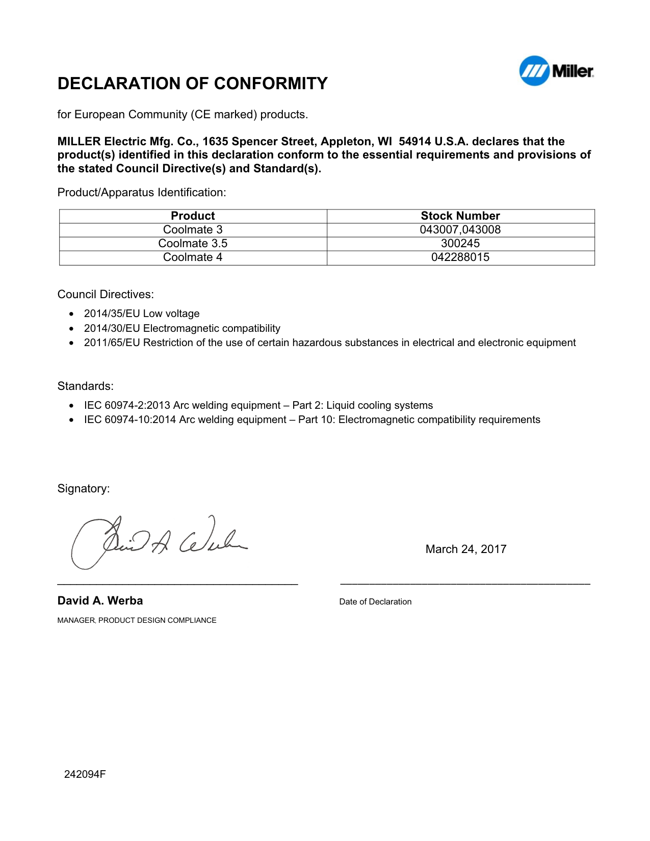 for European Community (CE marked) products. MILLER Electric Mfg. Co., 1635 Spencer Street, Appleton, WI 54914 U.S.A. declares that the product(s) identified in this declaration conform to the essential requirements and provisions of the stated Council Directive(s) and Standard(s). Product/Apparatus Identification: Product Stock Number Coolmate 3 043007,043008 Coolmate 3.5 300245 Coolmate 4 042288015 Council Directives: • 2014/35/EU Low voltage • 2014/30/EU Electromagnetic compatibility • 2011/65/EU Restriction of the use of certain hazardous substances in electrical and electronic equipment Standards: • IEC 60974-2:2013 Arc welding equipment – Part 2: Liquid cooling systems • IEC 60974-10:2014 Arc welding equipment – Part 10: Electromagnetic compatibility requirements Signatory: _____________________________________ ___________________________________________ David A. Werba Date of DeclarationManager, Product Design Compliance