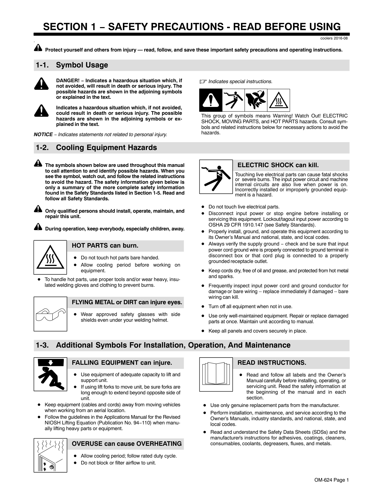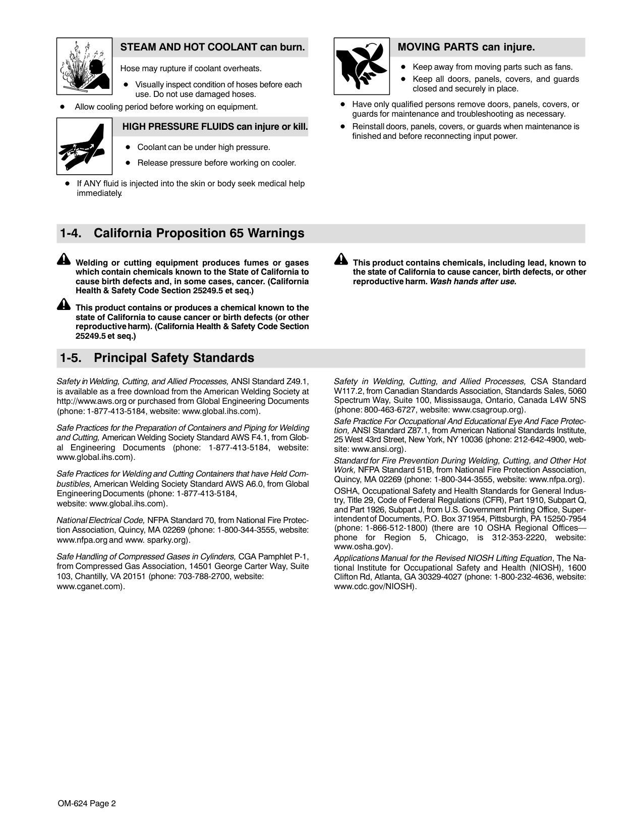Read and follow all labels and the Owner’s Manual carefully before installing, operating, or servicing unit. Read the safety information at the beginning of the manual and in each section. Use only genuine replacement parts from the manufacturer. Perform installation, maintenance, and service according to the Owner’s Manuals, industry standards, and national, state, and local codes. Read and understand the Safety Data Sheets (SDSs) and the manufacturer’s instructions for adhesives, coatings, cleaners, consumables, coolants, degreasers, fluxes, and metals.OM-624 Page 2 STEAM AND HOT COOLANT can burn. Hose may rupture if coolant overheats. Visually inspect condition of hoses before each use. Do not use damaged hoses. Allow cooling period before working on equipment. HIGH PRESSURE FLUIDS can injure or kill. Coolant can be under high pressure. Release pressure before working on cooler. If ANY fluid is injected into the skin or body seek medical help immediately. MOVING PARTS can injure. Keep away from moving parts such as fans. Keep all doors, panels, covers, and guards closed and securely in place. Have only qualified persons remove doors, panels, covers, or guards for maintenance and troubleshooting as necessary. Reinstall doors, panels, covers, or guards when maintenance is finished and before reconnecting input power. 1-4. California Proposition 65 Warnings Welding or cutting equipment produces fumes or gases which contain chemicals known to the State of California to cause birth defects and, in some cases, cancer. (California Health & Safety Code Section 25249.5 et seq.) This product contains or produces a chemical known to the state of California to cause cancer or birth defects (or other reproductive harm). (California Health & Safety Code Section 25249.5 et seq.) This product contains chemicals, including lead, known to the state of California to cause cancer, birth defects, or other reproductive harm. Wash hands after use. 1-5. Principal Safety Standards Safety in Welding, Cutting, and Allied Processes, ANSI Standard Z49.1, is available as a free download from the American Welding Society at http://www.aws.org or purchased from Global Engineering Documents (phone: 1-877-413-5184, website: www.global.ihs.com). Safe Practices for the Preparation of Containers and Piping for Welding and Cutting, American Welding Society Standard AWS F4.1, from Glob- al Engineering Documents (phone: 1-877-413-5184, website: www.global.ihs.com). Safe Practices for Welding and Cutting Containers that have Held Com- bustibles, American Welding Society Standard AWS A6.0, from Global Engineering Documents (phone: 1-877-413-5184, website: www.global.ihs.com). National Electrical Code, NFPA Standard 70, from National Fire Protec- tion Association, Quincy, MA 02269 (phone: 1-800-344-3555, website: www.nfpa.org and www. sparky.org). Safe Handling of Compressed Gases in Cylinders, CGA Pamphlet P-1, from Compressed Gas Association, 14501 George Carter Way, Suite 103, Chantilly, VA 20151 (phone: 703-788-2700, website: www.cganet.com). Safety in Welding, Cutting, and Allied Processes, CSA Standard W117.2, from Canadian Standards Association, Standards Sales, 5060 Spectrum Way, Suite 100, Mississauga, Ontario, Canada L4W 5NS (phone: 800-463-6727, website: www.csagroup.org). Safe Practice For Occupational And Educational Eye And Face Protec- tion, ANSI Standard Z87.1, from American National Standards Institute, 25 West 43rd Street, New York, NY 10036 (phone: 212-642-4900, web- site: www.ansi.org). Standard for Fire Prevention During Welding, Cutting, and Other Hot Work, NFPA Standard 51B, from National Fire Protection Association, Quincy, MA 02269 (phone: 1-800-344-3555, website: www.nfpa.org). OSHA, Occupational Safety and Health Standards for General Indus- try, Title 29, Code of Federal Regulations (CFR), Part 1910, Subpart Q, and Part 1926, Subpart J, from U.S. Government Printing Office, Super- intendent of Documents, P.O. Box 371954, Pittsburgh, PA 15250-7954 (phone: 1-866-512-1800) (there are 10 OSHA Regional Offices— phone for Region 5, Chicago, is 312-353-2220, website: www.osha.gov). Applications Manual for the Revised NIOSH Lifting Equation, The Na- tional Institute for Occupational Safety and Health (NIOSH), 1600 Clifton Rd, Atlanta, GA 30329-4027 (phone: 1-800-232-4636, website: www.cdc.gov/NIOSH).