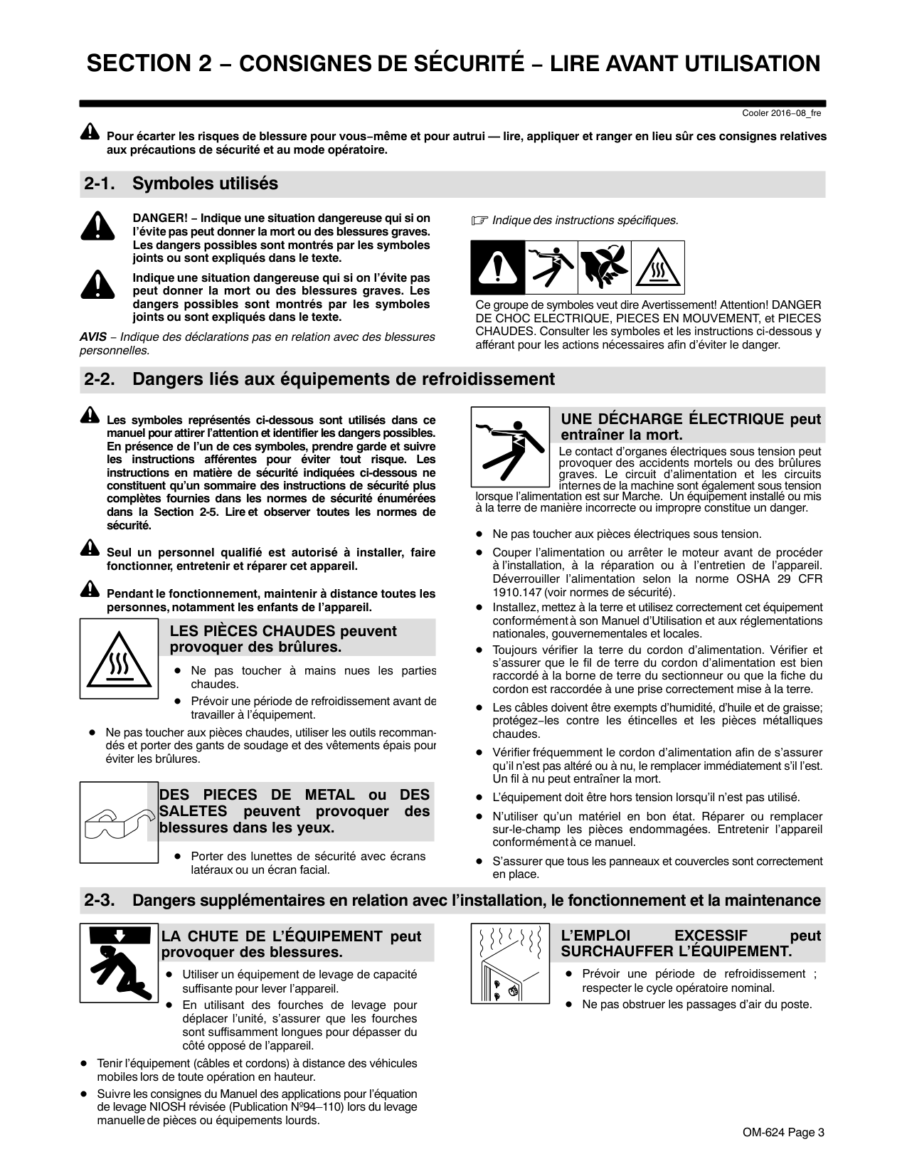 Cooler 2016−08_fre Pour écarter les risques de blessure pour vous−même et pour autrui — lire, appliquer et ranger en lieu sûr ces consignes relatives aux précautions de sécurité et au mode opératoire. 2-1. Symboles utilisés DANGER! − Indique une situation dangereuse qui si on l’évite pas peut donner la mort ou des blessures graves. Les dangers possibles sont montrés par les symboles joints ou sont expliqués dans le texte. Indique une situation dangereuse qui si on l’évite pas peut donner la mort ou des blessures graves. Les dangers possibles sont montrés par les symboles joints ou sont expliqués dans le texte. AVIS − Indique des déclarations pas en relation avec des blessures personnelles. Indique des instructions spécifiques. Ce groupe de symboles veut dire Avertissement! Attention! DANGER DE CHOC ELECTRIQUE, PIECES EN MOUVEMENT, et PIECES CHAUDES. Consulter les symboles et les instructions ci-dessous y afférant pour les actions nécessaires afin d’éviter le danger. 2-2. Dangers liés aux équipements de refroidissement Les symboles représentés ci-dessous sont utilisés dans ce manuel pour attirer l’attention et identifier les dangers possibles. En présence de l’un de ces symboles, prendre garde et suivre les instructions afférentes pour éviter tout risque. Les instructions en matière de sécurité indiquées ci-dessous ne constituent qu’un sommaire des instructions de sécurité plus complètes fournies dans les normes de sécurité énumérées dans la Section 2-5. Lire et observer toutes les normes de sécurité. Seul un personnel qualifié est autorisé à installer, faire fonctionner, entretenir et réparer cet appareil. Pendant le fonctionnement, maintenir à distance toutes les personnes, notamment les enfants de l’appareil. LES PIÈCES CHAUDES peuvent provoquer des brûlures. Ne pas toucher à mains nues les parties chaudes. Prévoir une période de refroidissement avant de travailler à l’équipement. Ne pas toucher aux pièces chaudes, utiliser les outils recomman- dés et porter des gants de soudage et des vêtements épais pour éviter les brûlures. DES PIECES DE METAL ou DES SALETES peuvent provoquer des blessures dans les yeux. Porter des lunettes de sécurité avec écrans latéraux ou un écran facial. Le contact d’organes électriques sous tension peut provoquer des accidents mortels ou des brûlures graves. Le circuit d’alimentation et les circuits internes de la machine sont également sous tension lorsque l’alimentation est sur Marche. Un équipement installé ou mis à la terre de manière incorrecte ou impropre constitue un danger. UNE DÉCHARGE ÉLECTRIQUE peut entraîner la mort. Ne pas toucher aux pièces électriques sous tension. Couper l’alimentation ou arrêter le moteur avant de procéder à l’installation, à la réparation ou à l’entretien de l’appareil. Déverrouiller l’alimentation selon la norme OSHA 29 CFR 1910.147 (voir normes de sécurité). Installez, mettez à la terre et utilisez correctement cet équipement conformément à son Manuel d’Utilisation et aux réglementations nationales, gouvernementales et locales. Toujours vérifier la terre du cordon d’alimentation. Vérifier et s’assurer que le fil de terre du cordon d’alimentation est bien raccordé à la borne de terre du sectionneur ou que la fiche du cordon est raccordée à une prise correctement mise à la terre. Les câbles doivent être exempts d’humidité, d’huile et de graisse; protégez−les contre les étincelles et les pièces métalliques chaudes. Vérifier fréquemment le cordon d’alimentation afin de s’assurer qu’il n’est pas altéré ou à nu, le remplacer immédiatement s’il l’est. Un fil à nu peut entraîner la mort. L’équipement doit être hors tension lorsqu’il n’est pas utilisé. N’utiliser qu’un matériel en bon état. Réparer ou remplacer sur-le-champ les pièces endommagées. Entretenir l’appareil conformément à ce manuel. S’assurer que tous les panneaux et couvercles sont correctement en place. 2-3. Dangers supplémentaires en relation avec l’installation, le fonctionnement et la maintenance LA CHUTE DE L’ÉQUIPEMENT peut provoquer des blessures. Utiliser un équipement de levage de capacité suffisante pour lever l’appareil. En utilisant des fourches de levage pour déplacer l’unité, s’assurer que les fourches sont suffisamment longues pour dépasser du côté opposé de l’appareil. Tenir l’équipement (câbles et cordons) à distance des véhicules mobiles lors de toute opération en hauteur. Suivre les consignes du Manuel des applications pour l’équation de levage NIOSH révisée (Publication Nº94–110) lors du levage manuelle de pièces ou équipements lourds.L’Emploi