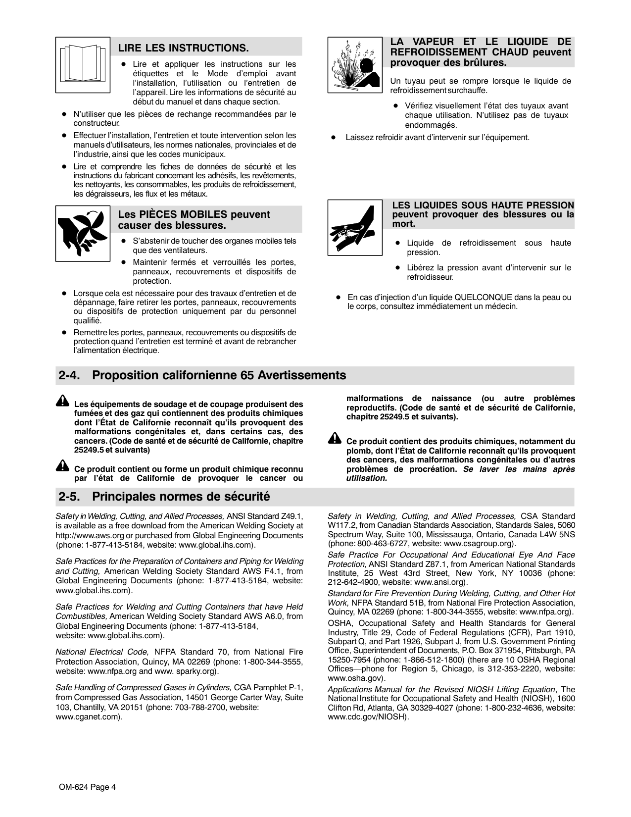 peuvent provoquer des blessures ou la mort. Liquide de refroidissement sous haute pression. Libérez la pression avant d’intervenir sur le refroidisseur. En cas d’injection d’un liquide QUELCONQUE dans la peau ou le corps, consultez immédiatement un médecin. 2-4. Proposition californienne 65 Avertissements Les équipements de soudage et de coupage produisent des fumées et des gaz qui contiennent des produits chimiques dont l’État de Californie reconnaît qu’ils provoquent des malformations congénitales et, dans certains cas, des cancers. (Code de santé et de sécurité de Californie, chapitre 25249.5 et suivants) Ce produit contient ou forme un produit chimique reconnu par l’état de Californie de provoquer le cancer ou malformations de naissance (ou autre problèmes reproductifs. (Code de santé et de sécurité de Californie, chapitre 25249.5 et suivants). Ce produit contient des produits chimiques, notamment du plomb, dont l’État de Californie reconnaît qu’ils provoquent des cancers, des malformations congénitales ou d’autres problèmes de procréation. Se laver les mains après utilisation. 2-5. Principales normes de sécurité Safety in Welding, Cutting, and Allied Processes, ANSI Standard Z49.1, is available as a free download from the American Welding Society at http://www.aws.org or purchased from Global Engineering Documents (phone: 1-877-413-5184, website: www.global.ihs.com). Safe Practices for the Preparation of Containers and Piping for Welding and Cutting, American Welding Society Standard AWS F4.1, from Global Engineering Documents (phone: 1-877-413-5184, website: www.global.ihs.com). Safe Practices for Welding and Cutting Containers that have Held Combustibles, American Welding Society Standard AWS A6.0, from Global Engineering Documents (phone: 1-877-413-5184, website: www.global.ihs.com). National Electrical Code, NFPA Standard 70, from National Fire Protection Association, Quincy, MA 02269 (phone: 1-800-344-3555, website: www.nfpa.org and www. sparky.org). Safe Handling of Compressed Gases in Cylinders, CGA Pamphlet P-1, from Compressed Gas Association, 14501 George Carter Way, Suite 103, Chantilly, VA 20151 (phone: 703-788-2700, website: www.cganet.com). Safety in Welding, Cutting, and Allied Processes, CSA Standard W117.2, from Canadian Standards Association, Standards Sales, 5060 Spectrum Way, Suite 100, Mississauga, Ontario, Canada L4W 5NS (phone: 800-463-6727, website: www.csagroup.org). Safe Practice For Occupational And Educational Eye And Face Protection, ANSI Standard Z87.1, from American National Standards Institute, 25 West 43rd Street, New York, NY 10036 (phone: 212-642-4900, website: www.ansi.org). Standard for Fire Prevention During Welding, Cutting, and Other Hot Work, NFPA Standard 51B, from National Fire Protection Association, Quincy, MA 02269 (phone: 1-800-344-3555, website: www.nfpa.org). OSHA, Occupational Safety and Health Standards for General Industry, Title 29, Code of Federal Regulations (CFR), Part 1910, Subpart Q, and Part 1926, Subpart J, from U.S. Government Printing Office, Superintendent of Documents, P.O. Box 371954, Pittsburgh, PA 15250-7954 (phone: 1-866-512-1800) (there are 10 OSHA Regional Offices—phone for Region 5, Chicago, is 312-353-2220, website: www.osha.gov). Applications Manual for the Revised NIOSH Lifting Equation, The National Institute for Occupational Safety and Health (NIOSH), 1600 Clifton Rd, Atlanta, GA 30329-4027 (phone: 1-800-232-4636, website: www.cdc.gov/NIOSH).A complete Parts List is available at www.MillerWelds.com OM-624 Page 5