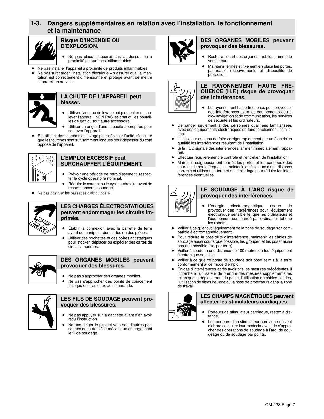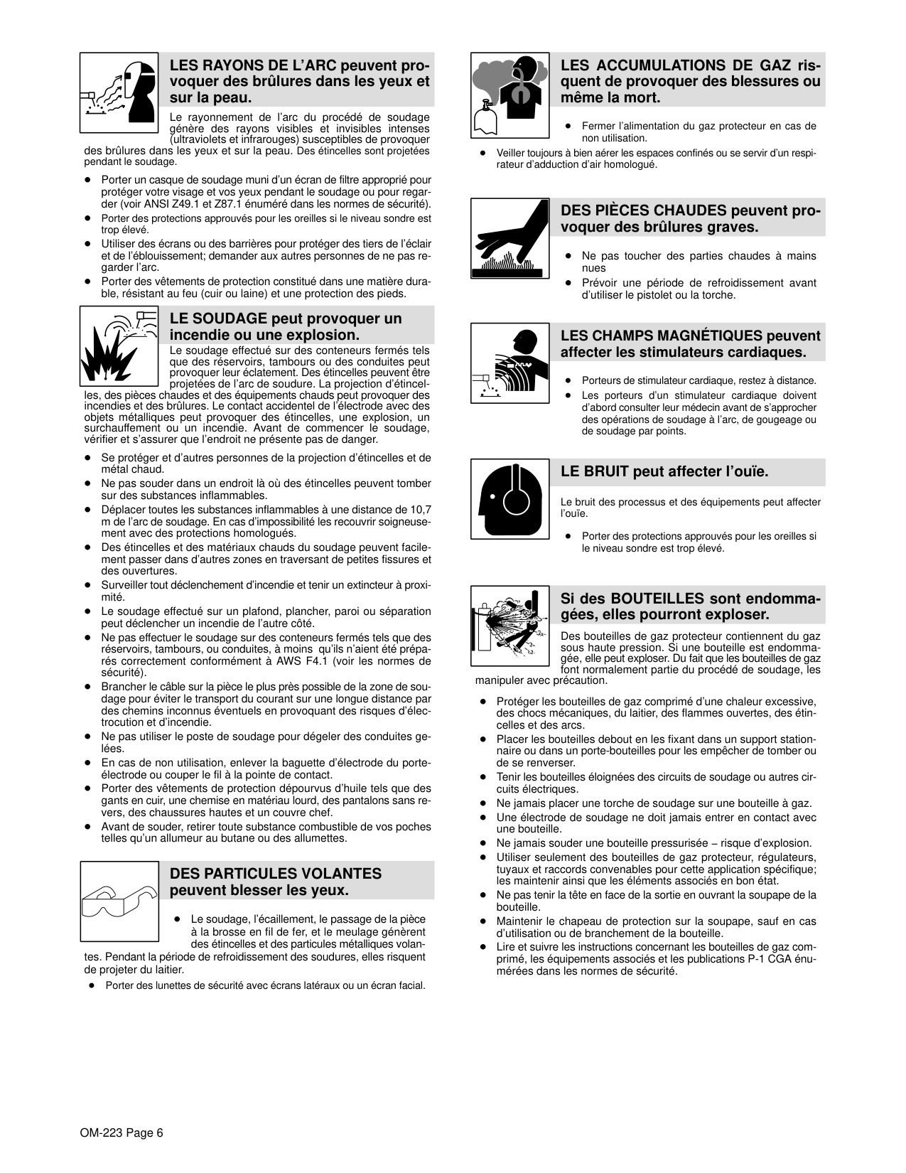 peuvent blesser les yeux. Le soudage, l’écaillement, le passage de la pièce à la brosse en fil de fer, et le meulage génèrent des étincelles et des particules métalliques volan- tes. Pendant la période de refroidissement des soudures, elles risquent de projeter du laitier. Porter des lunettes de sécurité avec écrans latéraux ou un écran facial. LES ACCUMULATIONS DE GAZ ris- quent de provoquer des blessures ou même la mort. Fermer l’alimentation du gaz protecteur en cas de non utilisation. Veiller toujours à bien aérer les espaces confinés ou se servir d’un respi- rateur d’adduction d’air homologué. DES PIÈCES CHAUDES peuvent pro- voquer des brûlures graves. Ne pas toucher des parties chaudes à mains nues Prévoir une période de refroidissement avant d’utiliser le pistolet ou la torche. LES CHAMPS MAGNÉTIQUES peuvent affecter les stimulateurs cardiaques. Porteurs de stimulateur cardiaque, restez à distance. Les porteurs d’un stimulateur cardiaque doivent d’abord consulter leur médecin avant de s’approcher des opérations de soudage à l’arc, de gougeage ou de soudage par points. LE BRUIT peut affecter l’ouïe. Le bruit des processus et des équipements peut affecter l’ouïe. Porter des protections approuvés pour les oreilles si le niveau sondre est trop élevé. Des bouteilles de gaz protecteur contiennent du gaz sous haute pression. Si une bouteille est endomma- gée, elle peut exploser. Du fait que les bouteilles de gaz font normalement partie du procédé de soudage, les manipuler avec précaution. Protéger les bouteilles de gaz comprimé d’une chaleur excessive, des chocs mécaniques, du laitier, des flammes ouvertes, des étin- celles et des arcs. Placer les bouteilles debout en les fixant dans un support station- naire ou dans un porte-bouteilles pour les empêcher de tomber ou de se renverser. Tenir les bouteilles éloignées des circuits de soudage ou autres cir- cuits électriques. Ne jamais placer une torche de soudage sur une bouteille à gaz. Une électrode de soudage ne doit jamais entrer en contact avec une bouteille. Ne jamais souder une bouteille pressurisée − risque d’explosion. Utiliser seulement des bouteilles de gaz protecteur, régulateurs, tuyaux et raccords convenables pour cette application spécifique; les maintenir ainsi que les éléments associés en bon état. Ne pas tenir la tête en face de la sortie en ouvrant la soupape de la bouteille. Maintenir le chapeau de protection sur la soupape, sauf en cas d’utilisation ou de branchement de la bouteille. Lire et suivre les instructions concernant les bouteilles de gaz com- primé, les équipements associés et les publications P-1 CGA énu- mérées dans les normes de sécurité. Si des BOUTEILLES sont endomma- gées, elles pourront exploser.OM-223 Page 7 1-3. Dangers supplémentaires en relation avec l’installation, le fonctionnement et la maintenance Risque D’INCENDIE OU