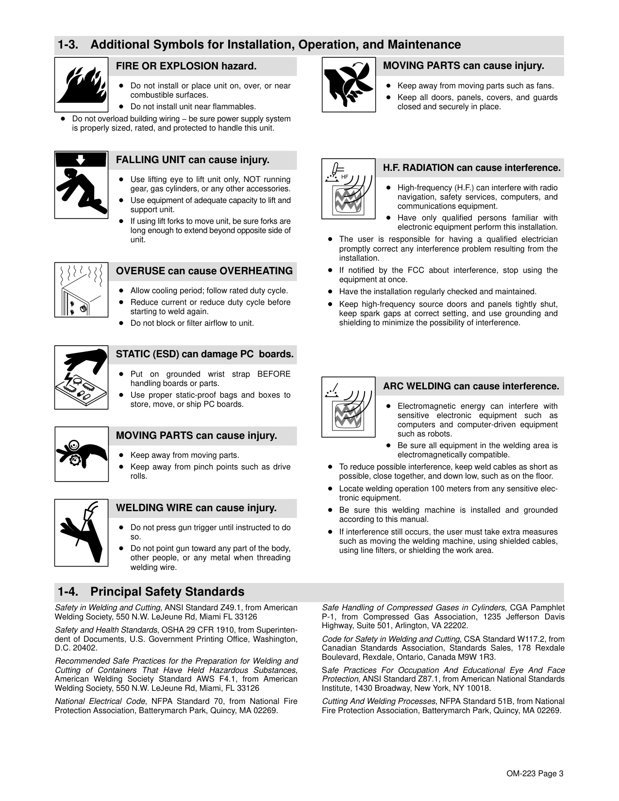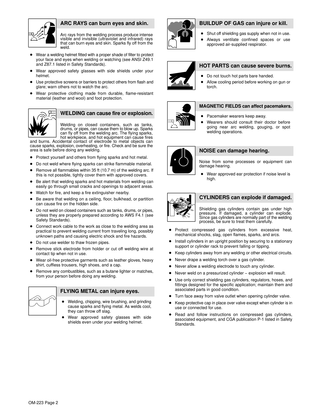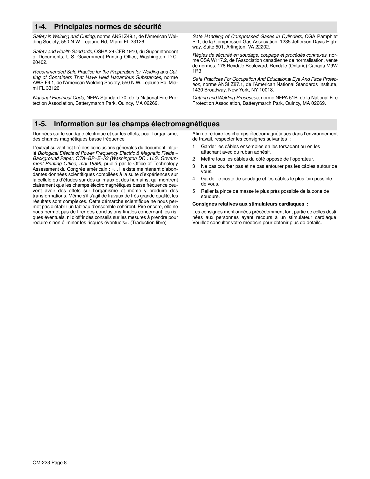 Recommended Safe Practices for the Preparation for Welding and Cutting of Containers That Have Held Hazardous Substances, American Welding Society Standard AWS F4.1, from American Welding Society, 550 N.W. LeJeune Rd, Miami, FL 33126 National Electrical Code, NFPA Standard 70, from National Fire Protection Association, Batterymarch Park, Quincy, MA 02269. Safe Handling of Compressed Gases in Cylinders, CGA Pamphlet P-1, from Compressed Gas Association, 1235 Jefferson Davis Highway, Suite 501, Arlington, VA 22202. Code for Safety in Welding and Cutting, CSA Standard W117.2, from Canadian Standards Association, Standards Sales, 178 Rexdale Boulevard, Rexdale, Ontario, Canada M9W 1R3. Safe Practices For Occupation And Educational Eye And Face Protection, ANSI Standard Z87.1, from American National Standards Institute, 1430 Broadway, New York, NY 10018. Cutting And Welding Processes, NFPA Standard 51B, from National Fire Protection Association, Batterymarch Park, Quincy, MA 02269.OM-223 Page 4 1-5. EMF Information Considerations About Welding And The Effects Of Low Frequency Electric And Magnetic Fields Welding current, as it flows through welding cables, will cause electro- magnetic fields. There has been and still is some concern about such fields. However, after examining more than 500 studies spanning 17 years of research, a special blue ribbon committee of the National Research Council concluded that: “The body of evidence, in the committee’s judgment, has not demonstrated that exposure to power- frequency electric and magnetic fields is a human-health hazard.” However, studies are still going forth and evidence continues to be examined. Until the final conclusions of the research are reached, you may wish to minimize your exposure to electromagnetic fields when welding or cutting. To reduce magnetic fields in the workplace, use the following procedures: