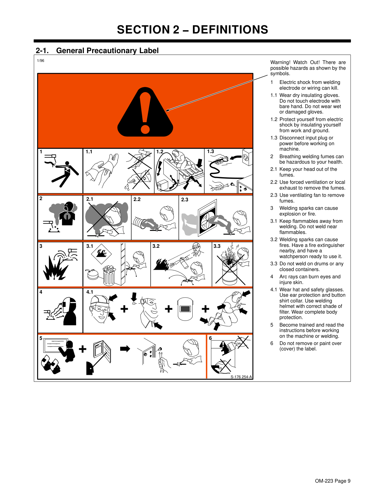 2-1. General Precautionary Label Warning! Watch Out! There are possible hazards as shown by the symbols. 1 Electric shock from welding electrode or wiring can kill. 1.1 Wear dry insulating gloves. Do not touch electrode with bare hand. Do not wear wet or damaged gloves. 1.2 Protect yourself from electric shock by insulating yourself from work and ground. 1.3 Disconnect input plug or power before working on machine. 2 Breathing welding fumes can be hazardous to your health. 2.1 Keep your head out of the fumes. 2.2 Use forced ventilation or local exhaust to remove the fumes. 2.3 Use ventilating fan to remove fumes. 3 Welding sparks can cause explosion or fire. 3.1 Keep flammables away from welding. Do not weld near flammables. 3.2 Welding sparks can cause fires. Have a fire extinguisher nearby, and have a watchperson ready to use it. 3.3 Do not weld on drums or any closed containers. 4 Arc rays can burn eyes and injure skin. 4.1 Wear hat and safety glasses. Use ear protection and button shirt collar. Use welding helmet with correct shade of filter. Wear complete body protection. 5 Become trained and read the instructions before working on the machine or welding. 6 Do not remove or paint over (cover) the label. 1/96S-176 254-A