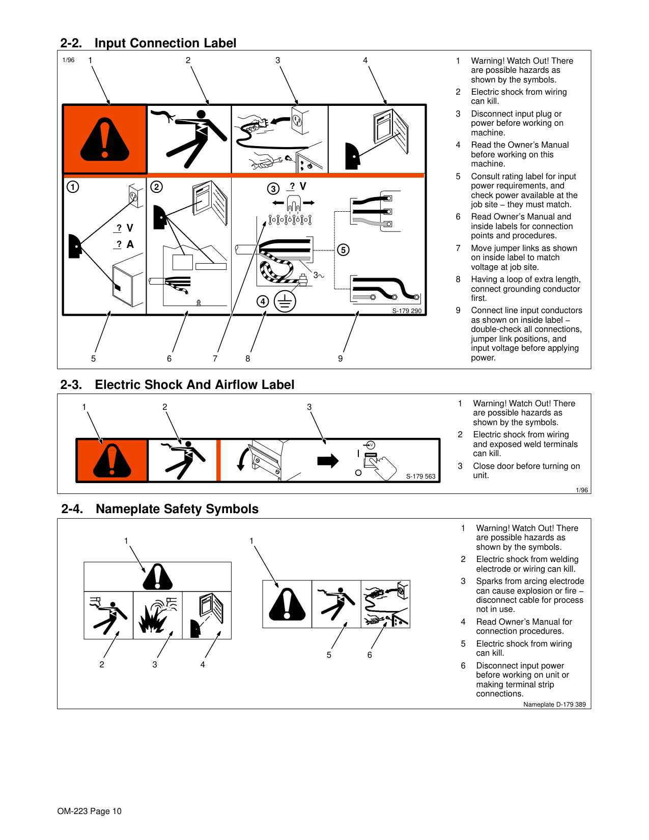 1 1.1 1.2 1.3 3 3.1 3.2 3.3 4 4.1 + 2 2.1 2.2 + + 5 6 + 2.3OM-223 Page 10 2-2. Input Connection Label 1 Warning! Watch Out! There are possible hazards as shown by the symbols. 2 Electric shock from wiring can kill. 3 Disconnect input plug or power before working on machine. 4 Read the Owner’s Manual before working on this machine. 5 Consult rating label for input power requirements, and check power available at the job site − they must match. 6 Read Owner’s Manual and inside labels for connection points and procedures. 7 Move jumper links as shown on inside label to match voltage at job site. 8 Having a loop of extra length, connect grounding conductor first. 9 Connect line input conductors as shown on inside label − double-check all connections, jumper link positions, and input voltage before applying power.