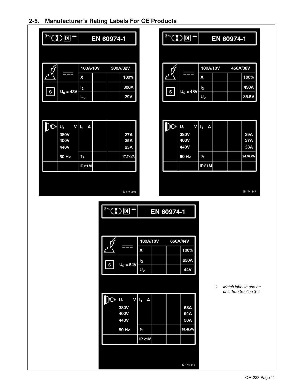 1 Warning! Watch Out! There are possible hazards as shown by the symbols. 2 Electric shock from wiring and exposed weld terminals can kill. 3 Close door before turning on unit. 1 2 3 1/96 2-4. Nameplate Safety Symbols 1 Warning! Watch Out! There are possible hazards as shown by the symbols. 2 Electric shock from welding electrode or wiring can kill. 3 Sparks from arcing electrode can cause explosion or fire − disconnect cable for process not in use. 4 Read Owner’s Manual for connection procedures. 5 Electric shock from wiring can kill. 6 Disconnect input power before working on unit or making terminal strip connections. Nameplate D-179 389 1 2 3 4 5 6 1OM-223 Page 11 2-5. Manufacturer’s Rating Labels For CE Products Match label to one on unit. See Section 3-4.