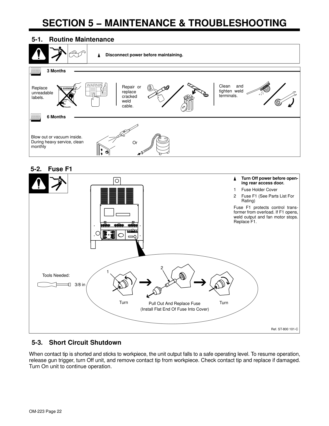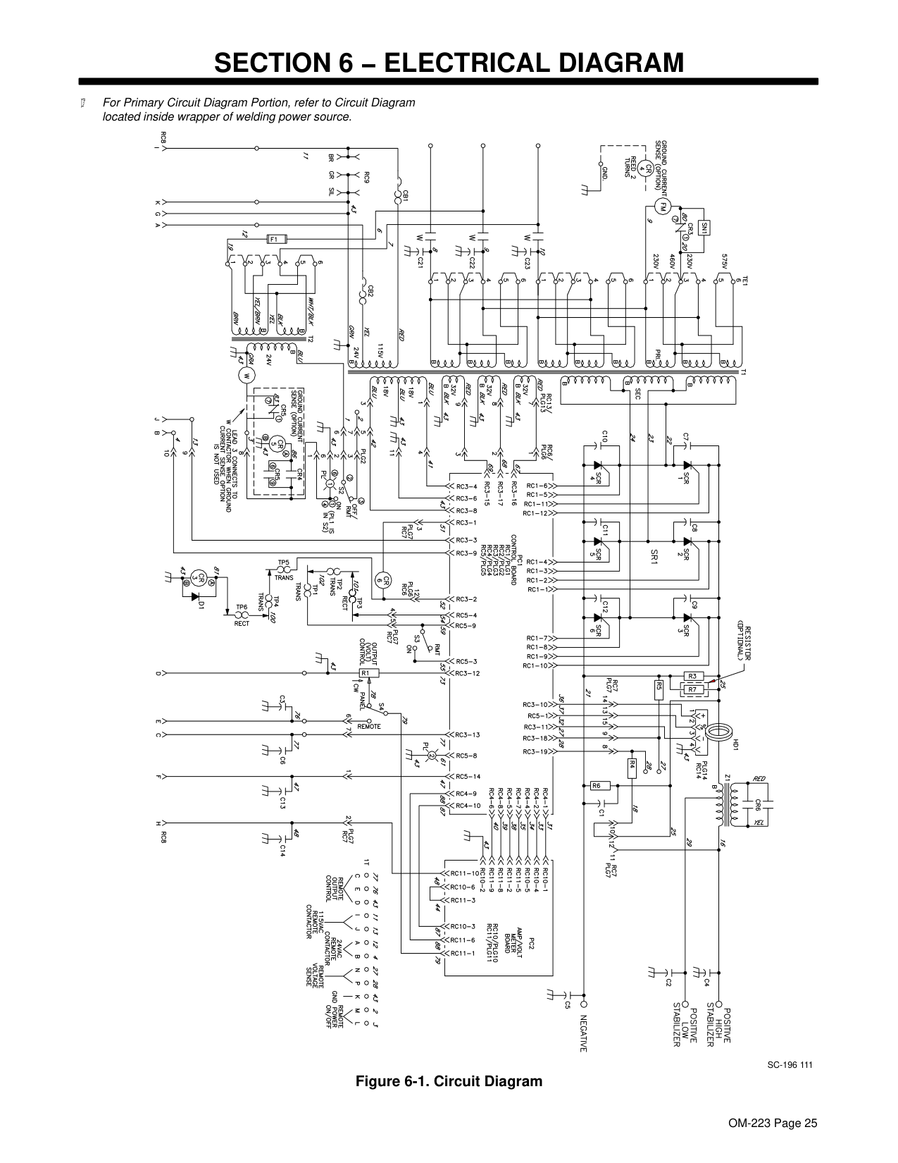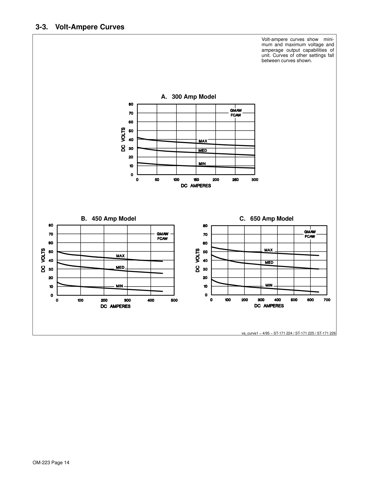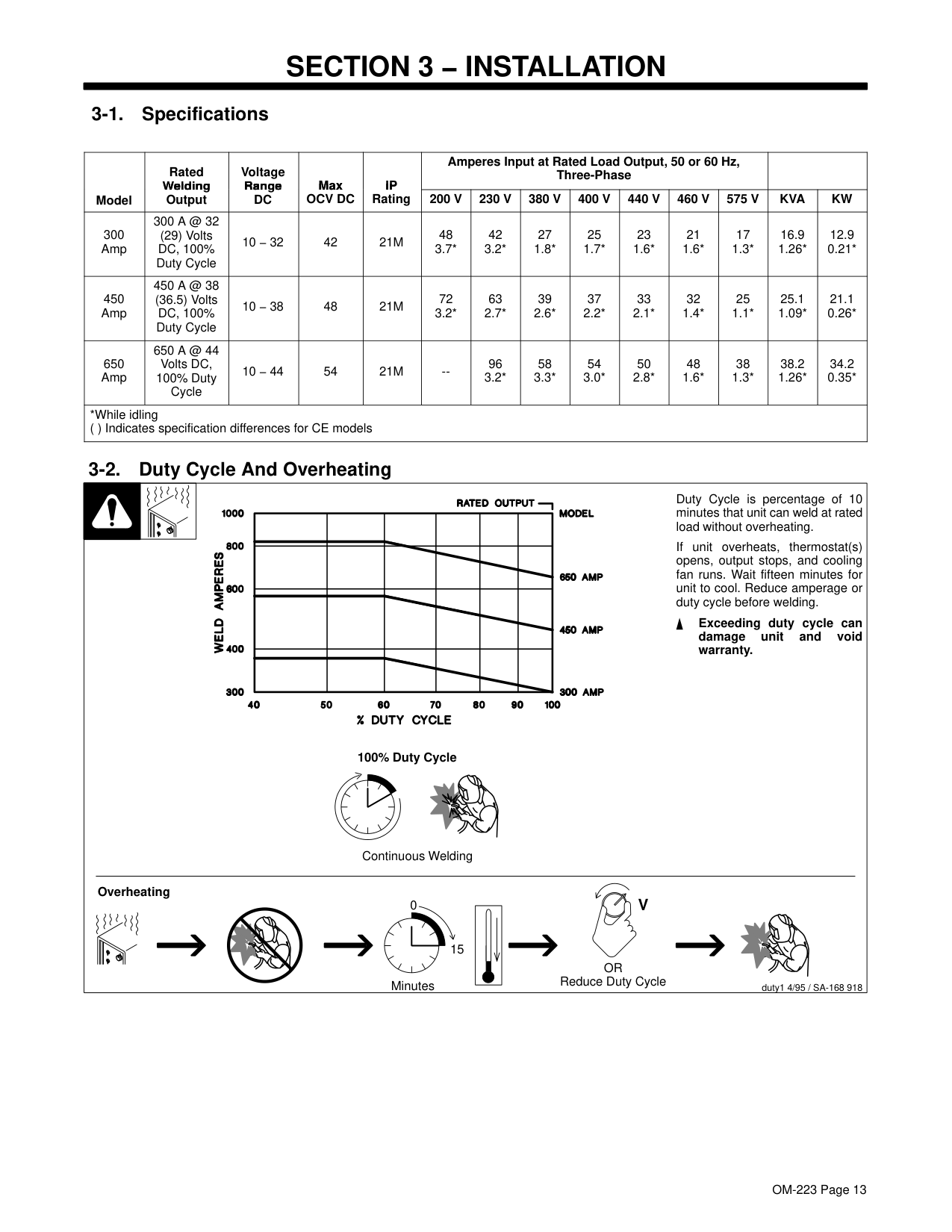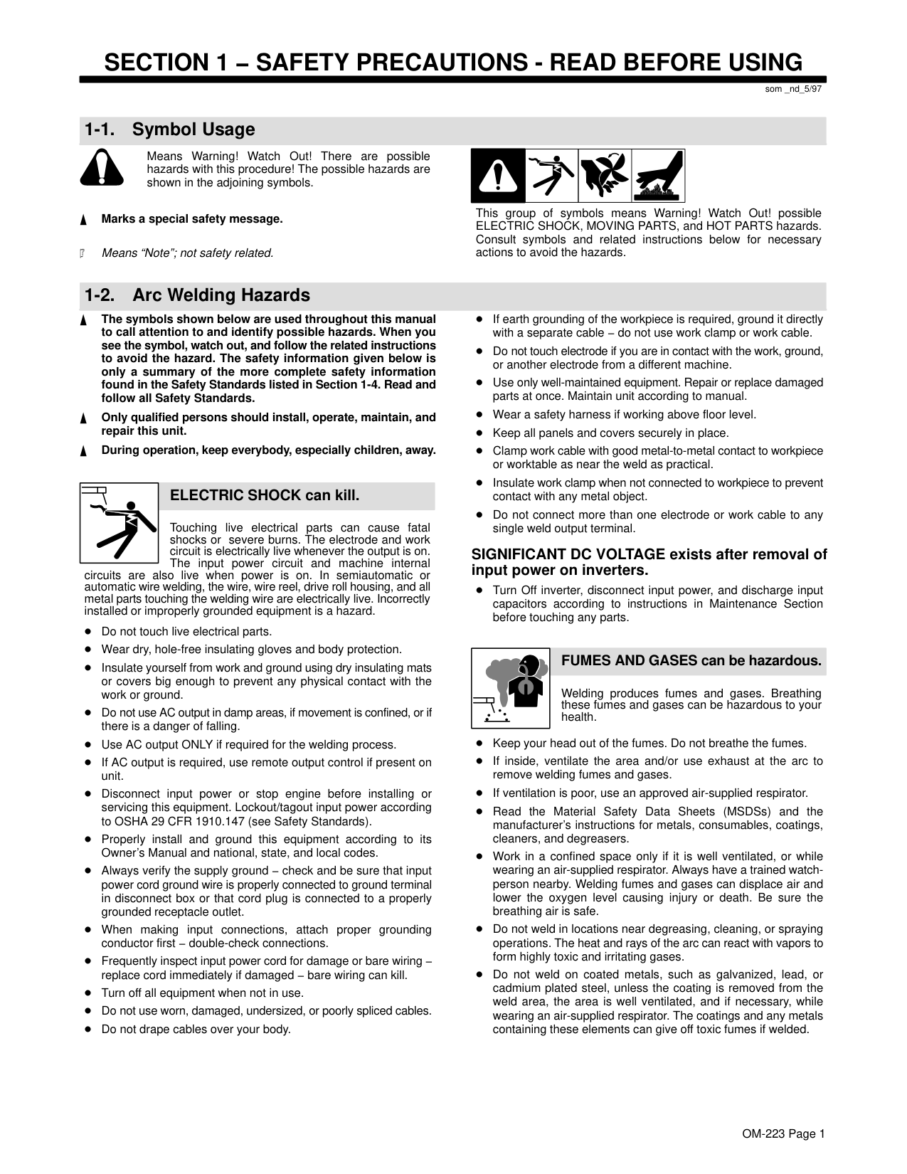 som _nd_5/97 1-1. Symbol Usage Means Warning! Watch Out! There are possible hazards with this procedure! The possible hazards are shown in the adjoining symbols. Marks a special safety message. Means “Note”; not safety related. This group of symbols means Warning! Watch Out! possible ELECTRIC SHOCK, MOVING PARTS, and HOT PARTS hazards. Consult symbols and related instructions below for necessary actions to avoid the hazards. 1-2. Arc Welding Hazards The symbols shown below are used throughout this manual to call attention to and identify possible hazards. When you see the symbol, watch out, and follow the related instructions to avoid the hazard. The safety information given below is only a summary of the more complete safety information found in the Safety Standards listed in Section 1-4. Read and follow all Safety Standards. Only qualified persons should install, operate, maintain, and repair this unit. During operation, keep everybody, especially children, away. ELECTRIC SHOCK can kill. Touching live electrical parts can cause fatal shocks or severe burns. The electrode and work circuit is electrically live whenever the output is on. The input power circuit and machine internal circuits are also live when power is on. In semiautomatic or automatic wire welding, the wire, wire reel, drive roll housing, and all metal parts touching the welding wire are electrically live. Incorrectly installed or improperly grounded equipment is a hazard. Do not touch live electrical parts. Wear dry, hole-free insulating gloves and body protection. Insulate yourself from work and ground using dry insulating mats or covers big enough to prevent any physical contact with the work or ground. Do not use AC output in damp areas, if movement is confined, or if there is a danger of falling. Use AC output ONLY if required for the welding process. If AC output is required, use remote output control if present on unit. Disconnect input power or stop engine before installing or servicing this equipment. Lockout/tagout input power according to OSHA 29 CFR 1910.147 (see Safety Standards). Properly install and ground this equipment according to its Owner’s Manual and national, state, and local codes. Always verify the supply ground − check and be sure that input power cord ground wire is properly connected to ground terminal in disconnect box or that cord plug is connected to a properly grounded receptacle outlet. When making input connections, attach proper grounding conductor first − double-check connections. Frequently inspect input power cord for damage or bare wiring − replace cord immediately if damaged − bare wiring can kill. Turn off all equipment when not in use. Do not use worn, damaged, undersized, or poorly spliced cables. Do not drape cables over your body. If earth grounding of the workpiece is required, ground it directly with a separate cable − do not use work clamp or work cable. Do not touch electrode if you are in contact with the work, ground, or another electrode from a different machine. Use only well-maintained equipment. Repair or replace damaged parts at once. Maintain unit according to manual. Wear a safety harness if working above floor level. Keep all panels and covers securely in place. Clamp work cable with good metal-to-metal contact to workpiece or worktable as near the weld as practical. Insulate work clamp when not connected to workpiece to prevent contact with any metal object. Do not connect more than one electrode or work cable to any single weld output terminal. SIGNIFICANT DC VOLTAGE exists after removal of input power on inverters. Turn Off inverter, disconnect input power, and discharge input capacitors according to instructions in Maintenance Section before touching any parts. Welding produces fumes and gases. Breathing these fumes and gases can be hazardous to your health. FUMES AND GASES can be hazardous. Keep your head out of the fumes. Do not breathe the fumes. If inside, ventilate the area and/or use exhaust at the arc to remove welding fumes and gases. If ventilation is poor, use an approved air-supplied respirator. Read the Material Safety Data Sheets (MSDSs) and the manufacturer’s instructions for metals, consumables, coatings, cleaners, and degreasers. Work in a confined space only if it is well ventilated, or while wearing an air-supplied respirator. Always have a trained watch- person nearby. Welding fumes and gases can displace air and lower the oxygen level causing injury or death. Be sure the breathing air is safe. Do not weld in locations near degreasing, cleaning, or spraying operations. The heat and rays of the arc can react with vapors to form highly toxic and irritating gases. Do not weld on coated metals, such as galvanized, lead, or cadmium plated steel, unless the coating is removed from the weld area, the area is well ventilated, and if necessary, while wearing an air-supplied respirator. The coatings and any metals containing these elements can give off toxic fumes if welded.OM-223 Page 2 Arc rays from the welding process produce intense visible and invisible (ultraviolet and infrared) rays that can burn eyes and skin. Sparks fly off from the weld. ARC RAYS can burn eyes and skin. Wear a welding helmet fitted with a proper shade of filter to protect your face and eyes when welding or watching (see ANSI Z49.1 and Z87.1 listed in Safety Standards). Wear approved safety glasses with side shields under your helmet. Use protective screens or barriers to protect others from flash and glare; warn others not to watch the arc. Wear protective clothing made from durable, flame-resistant material (leather and wool) and foot protection. Welding on closed containers, such as tanks, drums, or pipes, can cause them to blow up. Sparks can fly off from the welding arc. The flying sparks, hot workpiece, and hot equipment can cause fires and burns. Accidental contact of electrode to metal objects can cause sparks, explosion, overheating, or fire. Check a