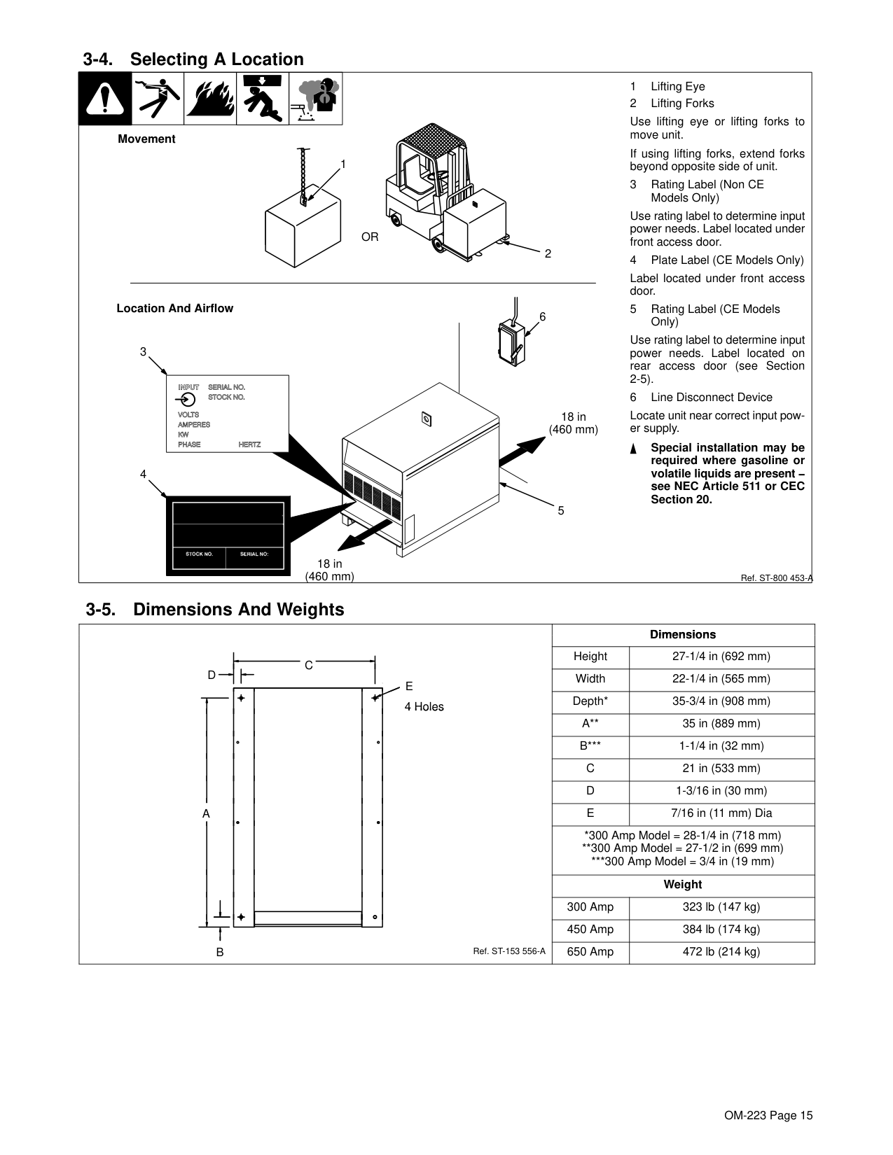 9 . . . . . . . . . . . . . . . . . . . . . . . . . . . . . . . . . . . . . . . . . . . . . . . . . . . . . . . . . . . . 2-1. General Precautionary Label 9 . . . . . . . . . . . . . . . . . . . . . . . . . . . . . . . . . . . . . . . . . . . . . . . . . . . . . 2-2. Input Connection Label 10 . . . . . . . . . . . . . . . . . . . . . . . . . . . . . . . . . . . . . . . . . . . . . . . . . . . . . . . . . 2-3. Electric Shock and Airflow Label 10 . . . . . . . . . . . . . . . . . . . . . . . . . . . . . . . . . . . . . . . . . . . . . . . . . . 2-4. Nameplate Safety Symbols 10 . . . . . . . . . . . . . . . . . . . . . . . . . . . . . . . . . . . . . . . . . . . . . . . . . . . . . .Section 3 − Installation