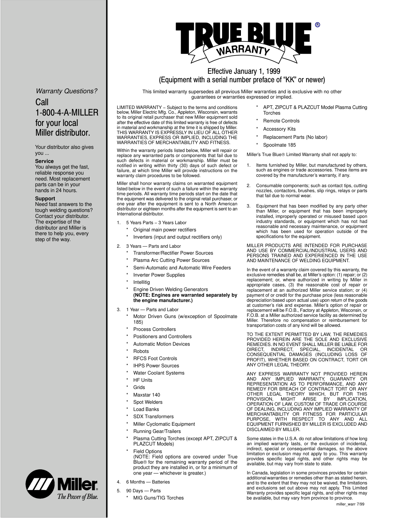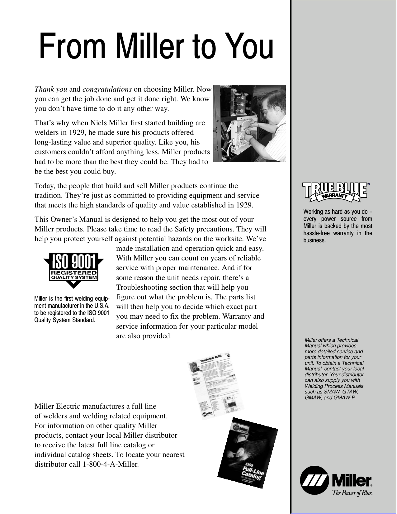 August 1999 Processes Description Gas Metal Arc (MIG) Welding Gas Metal Arc-Pulsed Welding Flux Cored Arc Welding Submerged Arc Welding (452/652 Only) Arc Welding Power Source Deltaweld Series 302, 452, 652 (60 Hz), 402, 602, 852 (50/60 Hz) Air Carbon Arc Cutting and Gouging (452/652 Only) Visit our website at www.MillerWelds.comMiller Electric manufactures a full line of welders and welding related equipment. For information on other quality Miller products, contact your local Miller distributor to receive the latest full line catalog or individual catalog sheets. To locate your nearest distributor call 1-800-4-A-Miller. Thank you and congratulations on choosing Miller. Now you can get the job done and get it done right. We know you don’t have time to do it any other way. That’s why when Niels Miller first started building arc welders in 1929, he made sure his products offered long-lasting value and superior quality. Like you, his customers couldn’t afford anything less. Miller products had to be more than the best they could be. They had to be the best you could buy. Today, the people that build and sell Miller products continue the tradition. They’re just as committed to providing equipment and service that meets the high standards of quality and value established in 1929. This Owner’s Manual is designed to help you get the most out of your Miller products. Please take time to read the Safety precautions. They will help you protect yourself against potential hazards on the worksite. We’ve made installation and operation quick and easy. With Miller you can count on years of reliable service with proper maintenance. And if for some reason the unit needs repair, there’s a Troubleshooting section that will help you figure out what the problem is. The parts list will then help you to decide which exact part you may need to fix the problem. Warranty and service information for your particular model are also provided. Miller is the first welding equip- ment manufacturer in the U.S.A. to be registered to the ISO 9001 Quality System Standard. Working as hard as you do − every power source from Miller is backed by the most hassle-free warranty in the business. From Miller to You Miller offers a Technical Manual which provides more detailed service and parts information for your unit. To obtain a Technical Manual, contact your local distributor. Your distributor can also supply you with Welding Process Manuals such as SMAW, GTAW, GMAW, and GMAW-P.