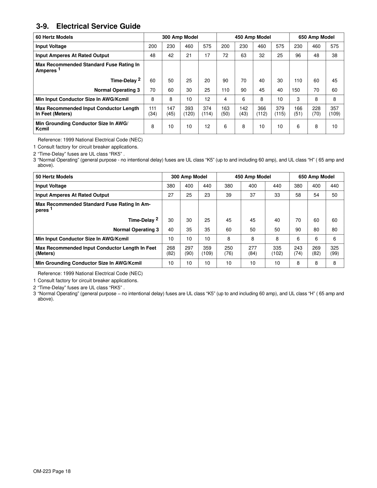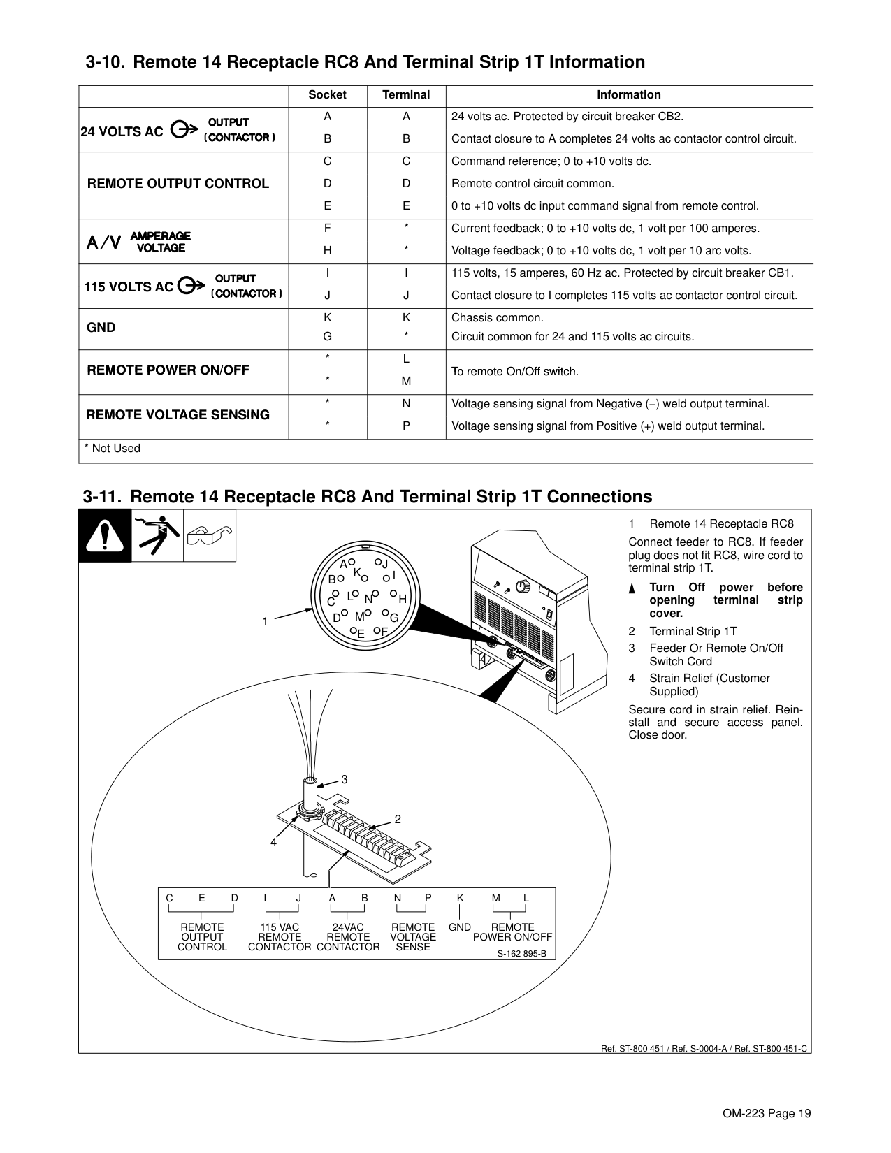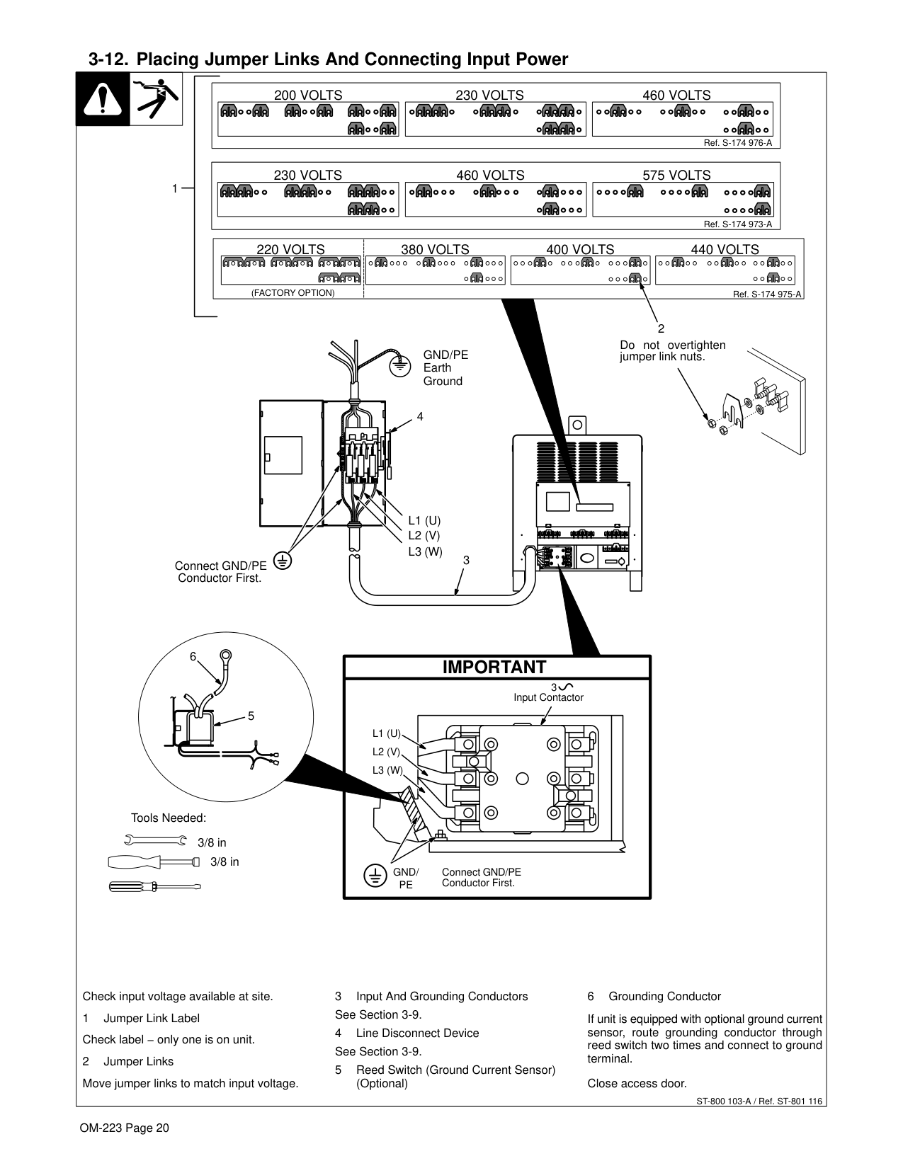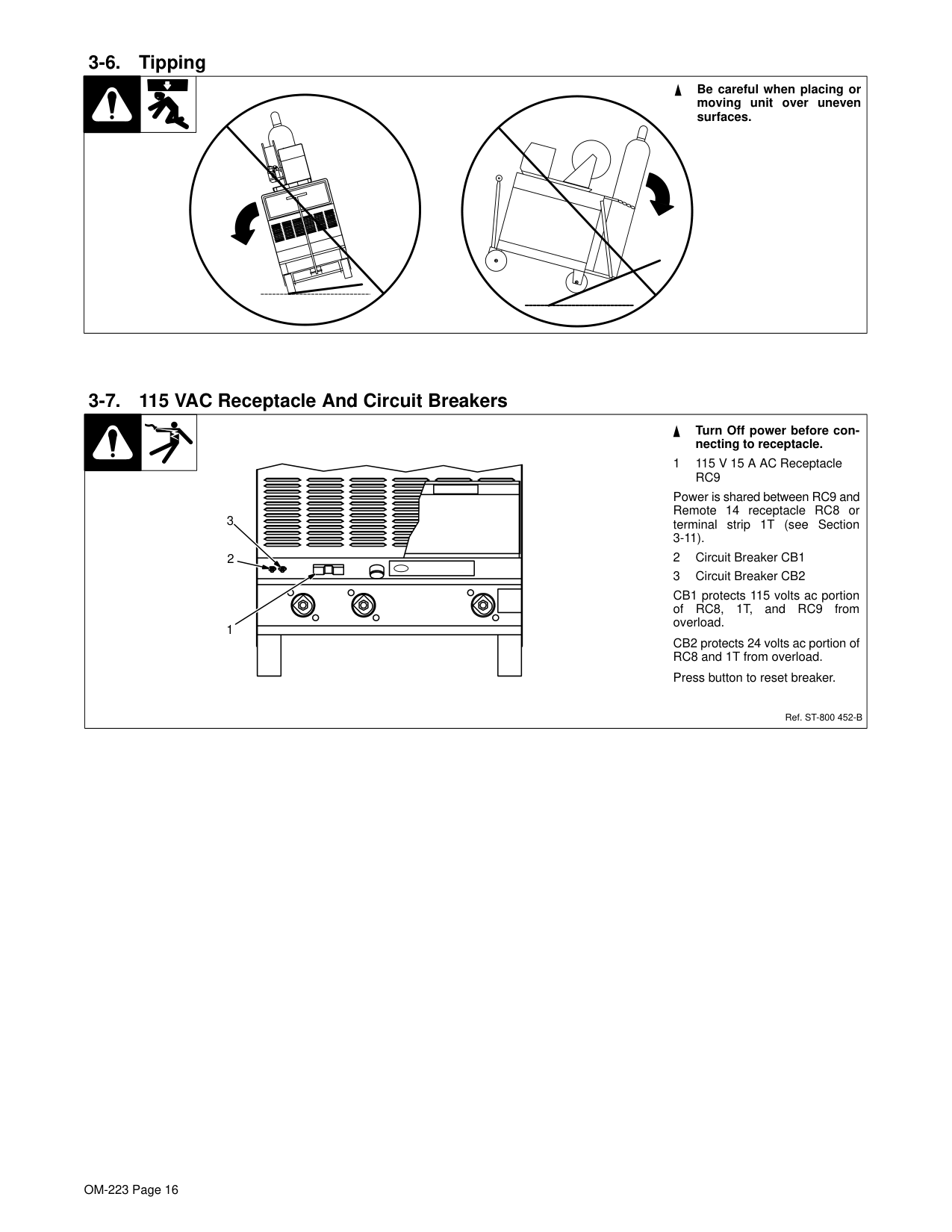13 . . . . . . . . . . . . . . . . . . . . . . . . . . . . . . . . . . . . . . . . . . . . . . . . . . . . . . . . . . . 3-1. Specifications 13 . . . . . . . . . . . . . . . . . . . . . . . . . . . . . . . . . . . . . . . . . . . . . . . . . . . . . . . . . . . . . . . . . 3-2. Duty Cycle and Overheating 13 . . . . . . . . . . . . . . . . . . . . . . . . . . . . . . . . . . . . . . . . . . . . . . . . . . . . . 3-4. Selecting a Location 15 . . . . . . . . . . . . . . . . . . . . . . . . . . . . . . . . . . . . . . . . . . . . . . . . . . . . . . . . . . . . 3-6. Tipping 16 . . . . . . . . . . . . . . . . . . . . . . . . . . . . . . . . . . . . . . . . . . . . . . . . . . . . . . . . . . . . . . . . . . . . . . . 3-7. 115 VAC Receptacle and Circuit Breakers 16 . . . . . . . . . . . . . . . . . . . . . . . . . . . . . . . . . . . . . . . . . 3-11.Remote 14 Receptacle RC8 and Terminal Strip 1T Connections 18 . . . . . . . . . . . . . . . . . . . . . . . 3-12.Placing Jumper Links and Connecting Input Power 19 . . . . . . . . . . . . . . . . . . . . . . . . . . . . . . . . . .Section 4 − Operation