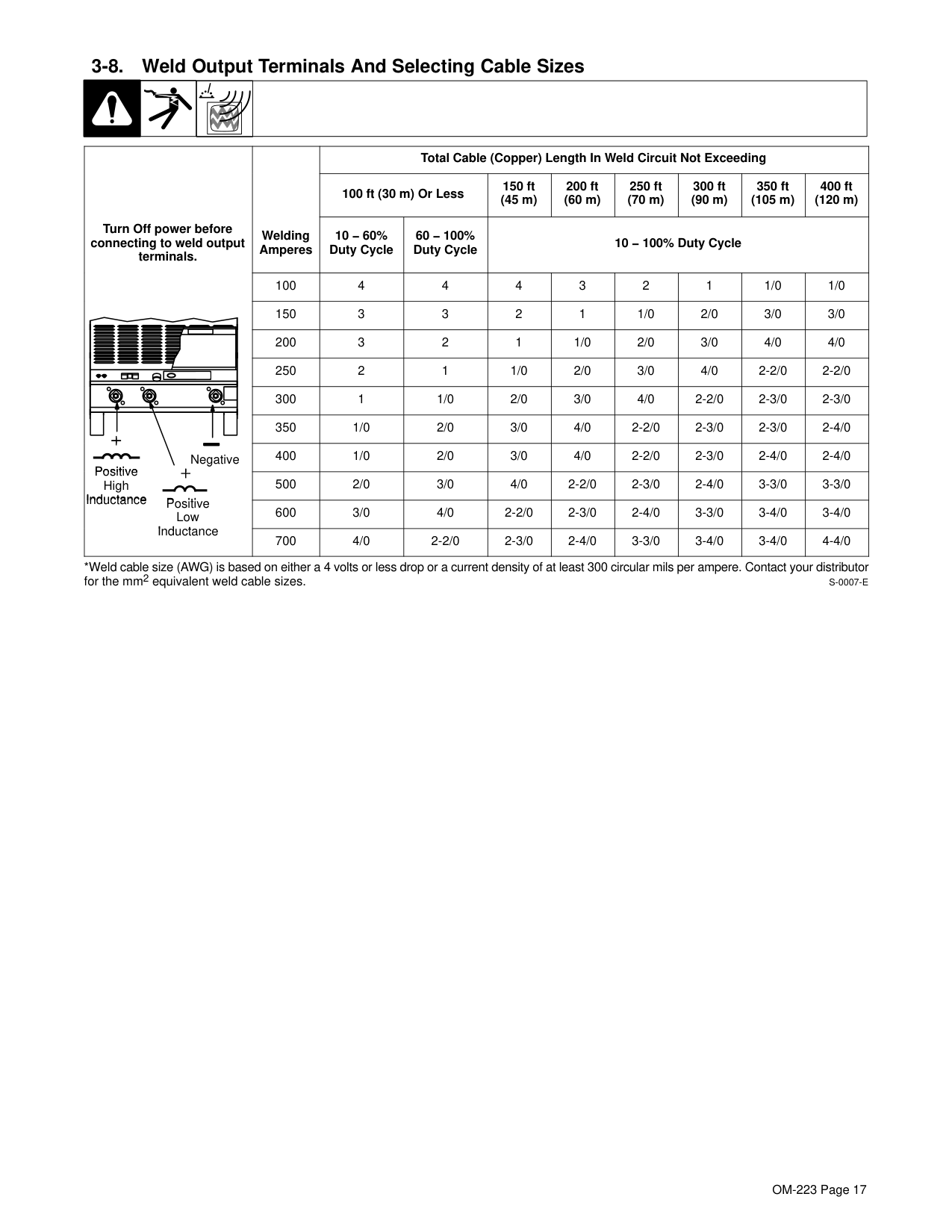 Weld cable size depends on amperage and circuit length. For example, at 300 amps with 100-150 ft cable length at 60-100% duty cycle, use 2/0 AWG cable. At 450 amps with 100-150 ft length at the same duty cycle, use 3/0 AWG cable. Cable size is based on either a 4 volts or less drop or a current density of at least 300 circular mils per ampere. Refer to the cable sizing chart in Section 3-8 for your specific amperage and circuit length. (Page 17)