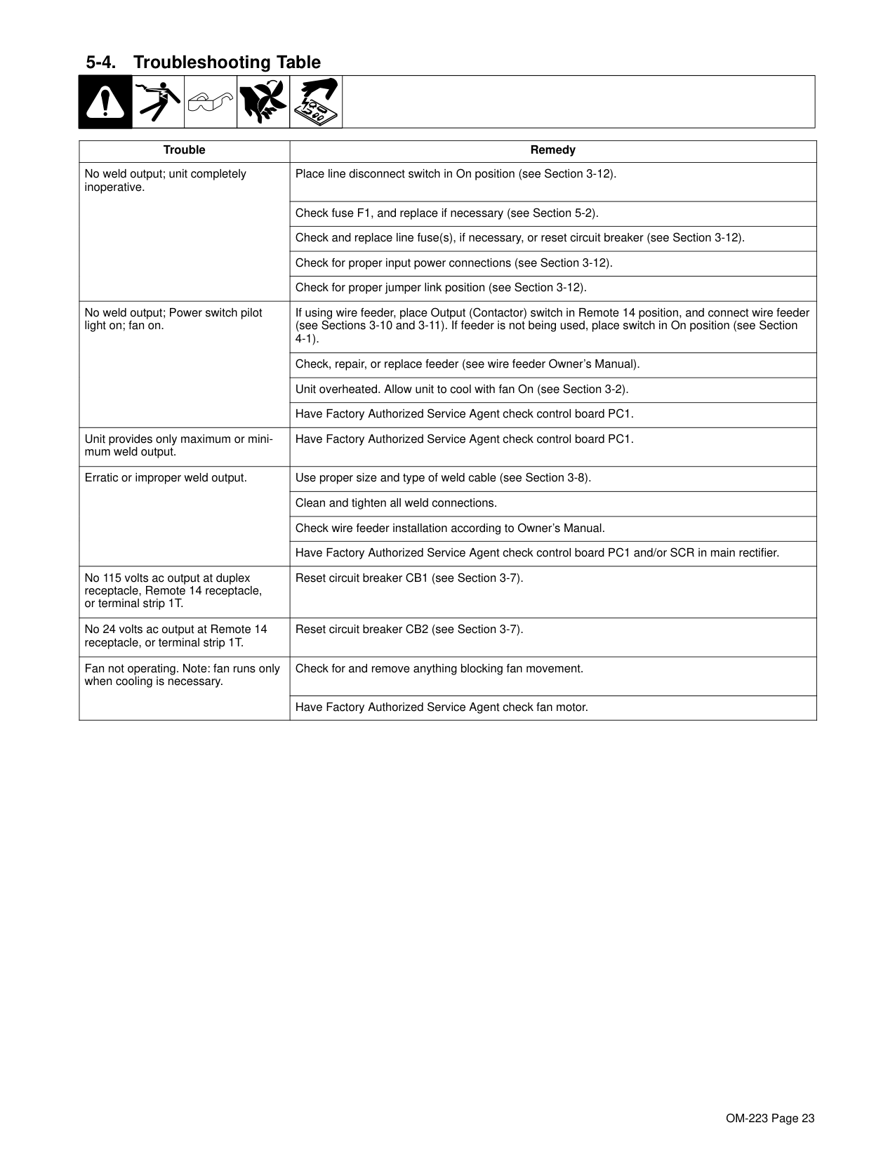 Check the following: Place the line disconnect switch in the On position, check and replace fuse F1 if necessary, check and reset any line fuses or circuit breakers, verify proper input power connections, and confirm the jumper link position matches your input voltage. If the power switch pilot light is on and the fan is running, place the Output (Contactor) switch in the appropriate position and check if your wire feeder is properly connected. (Page 23)