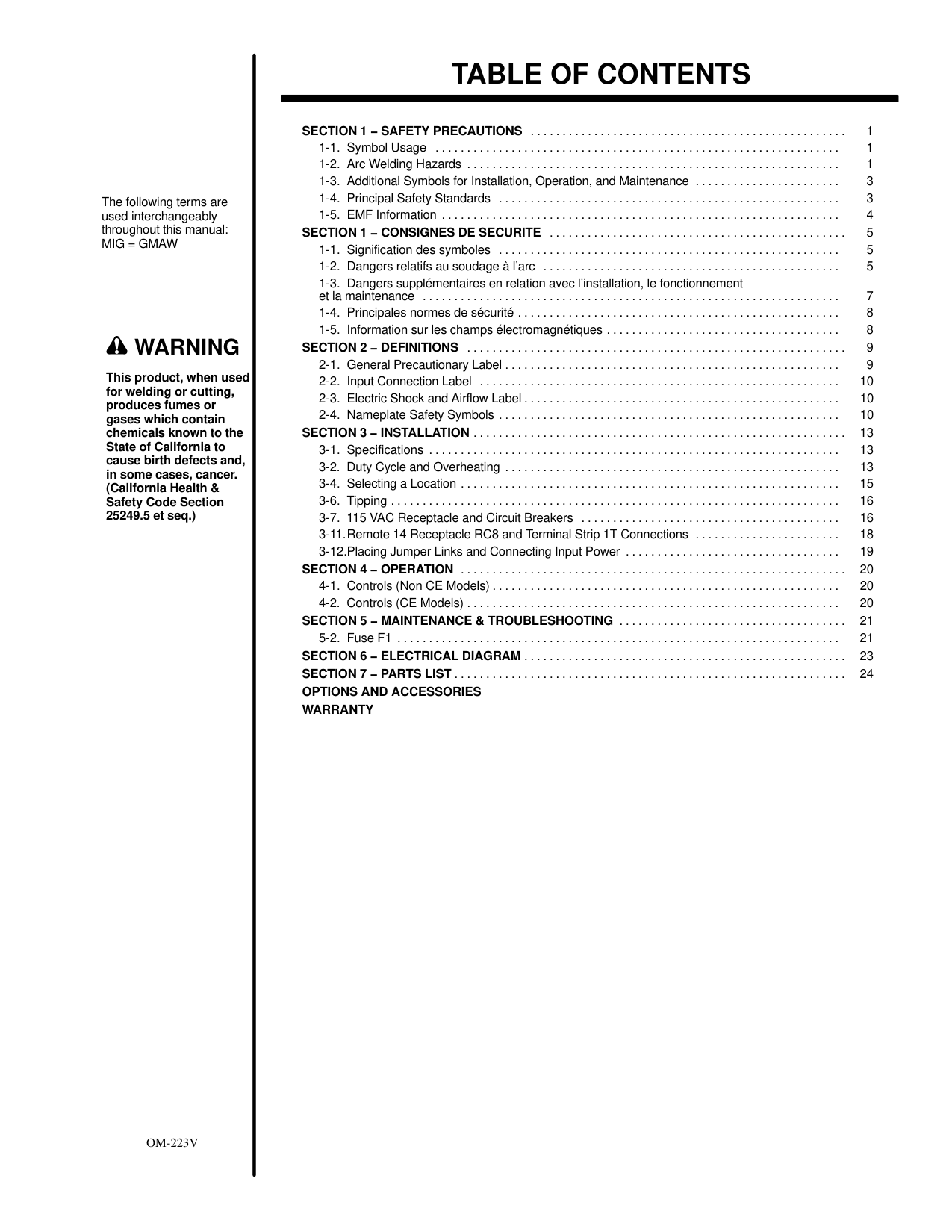 5 . . . . . . . . . . . . . . . . . . . . . . . . . . . . . . . . . . . . . . . . . . . . . . . 1-1. Signification des symboles 5 . . . . . . . . . . . . . . . . . . . . . . . . . . . . . . . . . . . . . . . . . . . . . . . . . . . . . . 1-2. Dangers relatifs au soudage à l’arc 5 . . . . . . . . . . . . . . . . . . . . . . . . . . . . . . . . . . . . . . . . . . . . . . . 1-3. Dangers supplémentaires en relation avec l’installation, le fonctionnement et la maintenance 7 . . . . . . . . . . . . . . . . . . . . . . . . . . . . . . . . . . . . . . . . . . . . . . . . . . . . . . . . . . . . . . . . . . 1-4. Principales normes de sécurité 8 . . . . . . . . . . . . . . . . . . . . . . . . . . . . . . . . . . . . . . . . . . . . . . . . . . . 1-5. Information sur les champs électromagnétiques 8 . . . . . . . . . . . . . . . . . . . . . . . . . . . . . . . . . . . . .Section 2 − Definitions