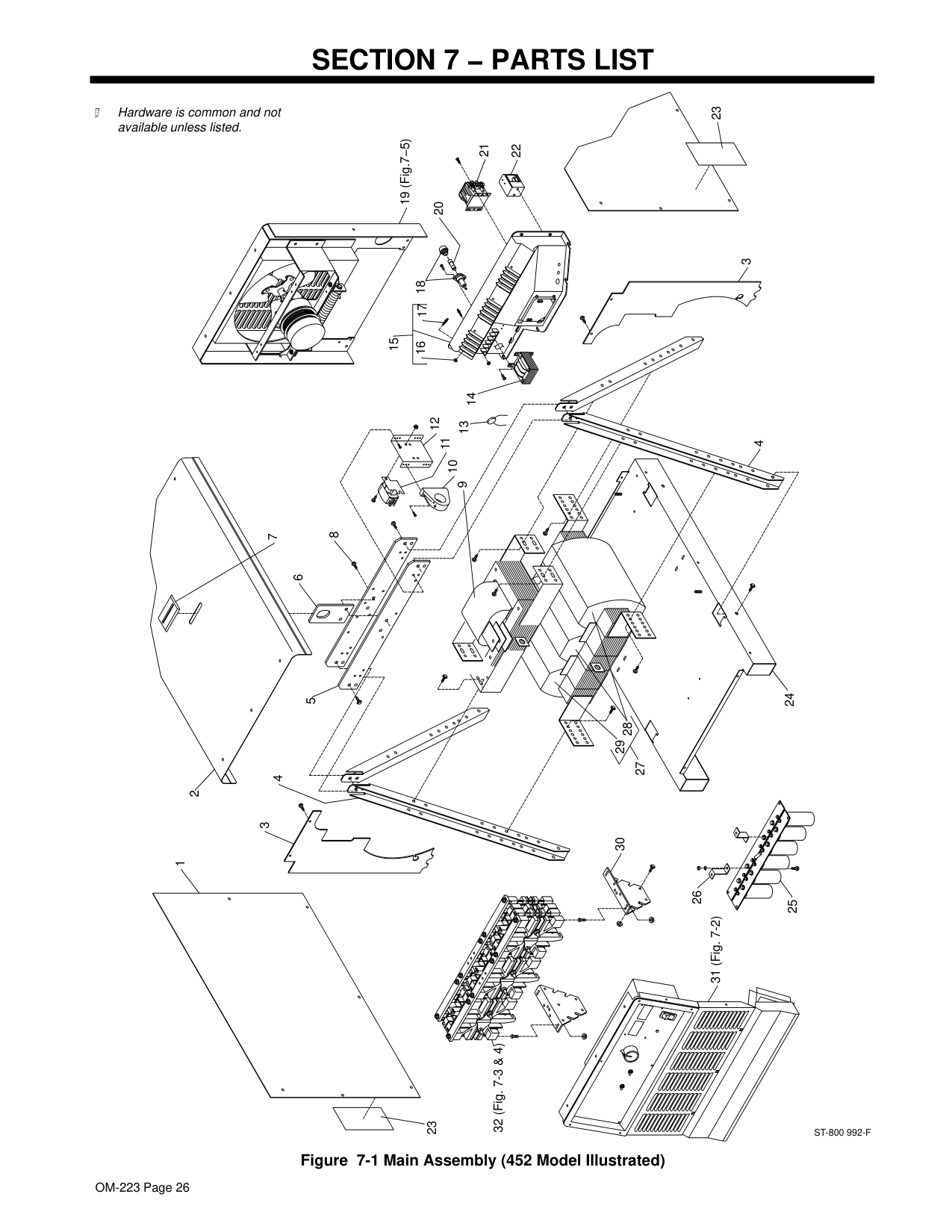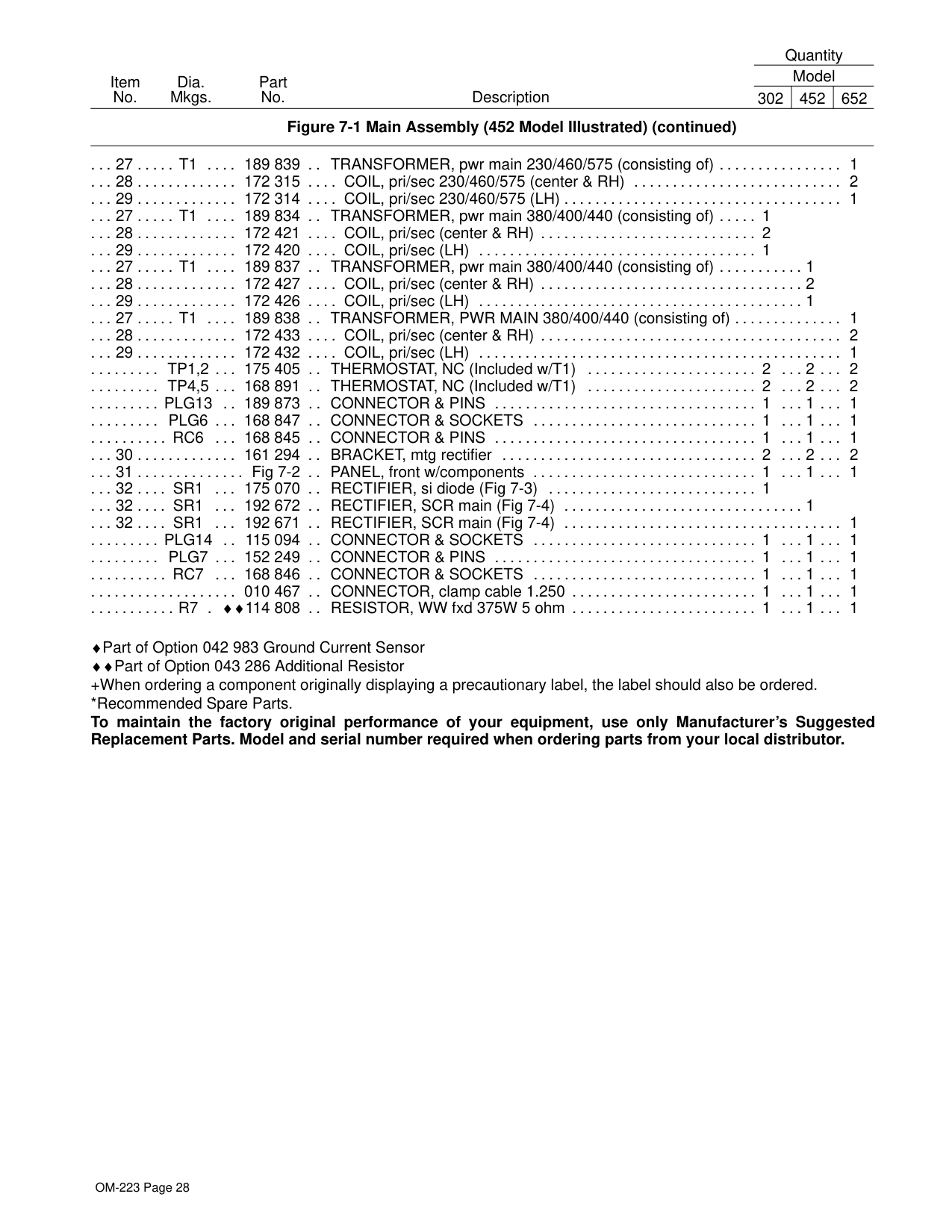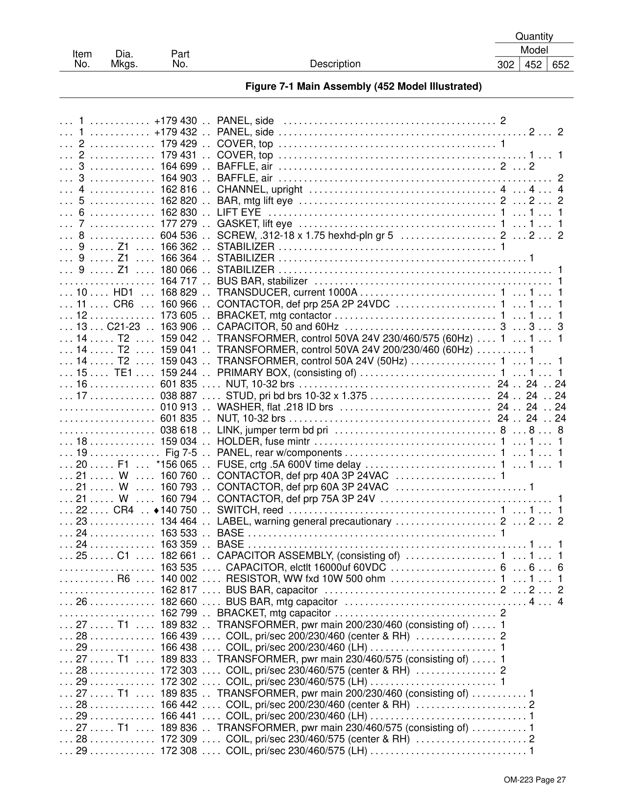 189 836 TRANSFORMER, pwr main 230/460/575 (consisting of) 1 . . . . . . . . . . . . . . . . . . . . . . . . . 28 172 309 COIL, pri/sec 230/460/575 (center & RH) 2 . . . . . . . . . . . . . . . . . . . . . . . . . . . . . . . . . . . . . . . . . . 29 172 308 COIL, pri/sec 230/460/575 (LH) 1 . . . . . . . . . . . . . . . . . . . . . . . . . . . . . . . . . . . . . . . . . . . . . . . . . . .OM-223 Page 28 Figure 7-1 Main Assembly (452 Model Illustrated) (continued) Description Part No. Dia. Mkgs. Item No. Quantity Model 302 452 652 27