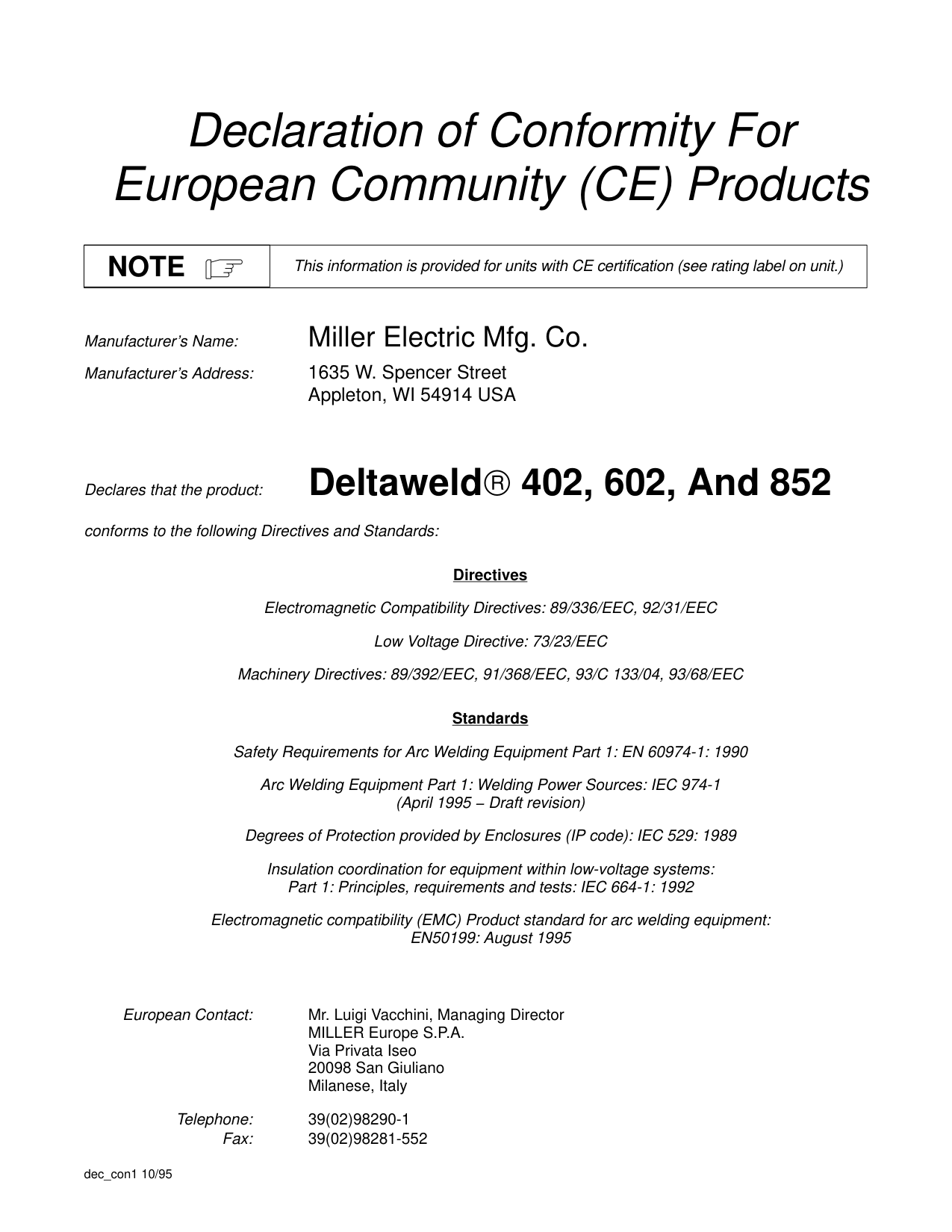Manufacturer’s Name: Miller Electric Mfg. Co. Manufacturer’s Address: 1635 W. Spencer Street Appleton, WI 54914 USA Declares that the product: Deltaweld402, 602, And 852 conforms to the following Directives and Standards: Directives Electromagnetic Compatibility Directives: 89/336/EEC, 92/31/EEC Low Voltage Directive: 73/23/EEC Machinery Directives: 89/392/EEC, 91/368/EEC, 93/C 133/04, 93/68/EEC Standards Safety Requirements for Arc Welding Equipment Part 1: EN 60974-1: 1990 Arc Welding Equipment Part 1: Welding Power Sources: IEC 974-1 (April 1995 − Draft revision) Degrees of Protection provided by Enclosures (IP code): IEC 529: 1989 Insulation coordination for equipment within low-voltage systems: Part 1: Principles, requirements and tests: IEC 664-1: 1992 Electromagnetic compatibility (EMC) Product standard for arc welding equipment: EN50199: August 1995 European Contact: Mr. Luigi Vacchini, Managing Director MILLER Europe S.P.A. Via Privata Iseo 20098 San Giuliano Milanese, Italy Telephone: 39(02)98290-1 Fax: 39(02)98281-552OM-223 Page 1