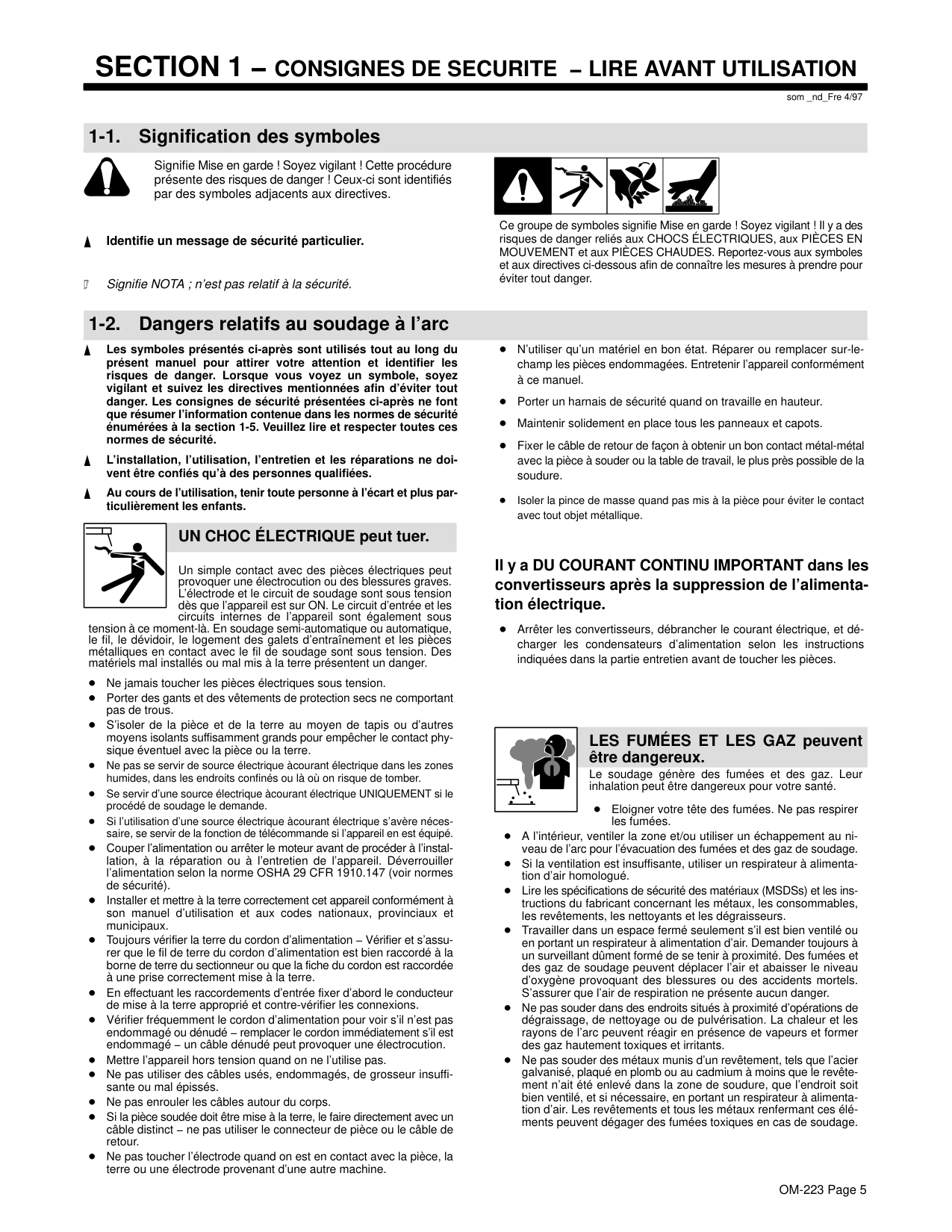 som _nd_Fre 4/97 1-1. Signification des symboles Signifie Mise en garde ! Soyez vigilant ! Cette procédure présente des risques de danger ! Ceux-ci sont identifiés par des symboles adjacents aux directives. Identifie un message de sécurité particulier. Signifie NOTA ; n’est pas relatif à la sécurité. Ce groupe de symboles signifie Mise en garde ! Soyez vigilant ! Il y a des risques de danger reliés aux CHOCS ÉLECTRIQUES, aux PIÈCES EN MOUVEMENT et aux PIÈCES CHAUDES. Reportez-vous aux symboles et aux directives ci-dessous afin de connaître les mesures à prendre pour éviter tout danger. 1-2. Dangers relatifs au soudage à l’arc Les symboles présentés ci-après sont utilisés tout au long du présent manuel pour attirer votre attention et identifier les risques de danger. Lorsque vous voyez un symbole, soyez vigilant et suivez les directives mentionnées afin d’éviter tout danger. Les consignes de sécurité présentées ci-après ne font que résumer l’information contenue dans les normes de sécurité énumérées à la section 1-5. Veuillez lire et respecter toutes ces normes de sécurité. L’installation, l’utilisation, l’entretien et les réparations ne doi- vent être confiés qu’à des personnes qualifiées. Au cours de l’utilisation, tenir toute personne à l’écart et plus par- ticulièrement les enfants. UN CHOC ÉLECTRIQUE peut tuer. Un simple contact avec des pièces électriques peut provoquer une électrocution ou des blessures graves. L’électrode et le circuit de soudage sont sous tension dès que l’appareil est sur ON. Le circuit d’entrée et les circuits internes de l’appareil sont également sous tension à ce moment-là. En soudage semi-automatique ou automatique, le fil, le dévidoir, le logement des galets d’entraînement et les pièces métalliques en contact avec le fil de soudage sont sous tension. Des matériels mal installés ou mal mis à la terre présentent un danger. Ne jamais toucher les pièces électriques sous tension. Porter des gants et des vêtements de protection secs ne comportant pas de trous. S’isoler de la pièce et de la terre au moyen de tapis ou d’autres moyens isolants suffisamment grands pour empêcher le contact phy- sique éventuel avec la pièce ou la terre. Ne pas se servir de source électrique àcourant électrique dans les zones humides, dans les endroits confinés ou là où on risque de tomber. Se servir d’une source électrique àcourant électrique UNIQUEMENT si le procédé de soudage le demande. Si l’utilisation d’une source électrique àcourant électrique s’avère néces- saire, se servir de la fonction de télécommande si l’appareil en est équipé. Couper l’alimentation ou arrêter le moteur avant de procéder à l’instal- lation, à la réparation ou à l’entretien de l’appareil. Déverrouiller l’alimentation selon la norme OSHA 29 CFR 1910.147 (voir normes de sécurité). Installer et mettre à la terre correctement cet appareil conformément à son manuel d’utilisation et aux codes nationaux, provinciaux et municipaux. Toujours vérifier la terre du cordon d’alimentation − Vérifier et s’assu- rer que le fil de terre du cordon d’alimentation est bien raccordé à la borne de terre du sectionneur ou que la fiche du cordon est raccordée à une prise correctement mise à la terre. En effectuant les raccordements d’entrée fixer d’abord le conducteur de mise à la terre approprié et contre-vérifier les connexions. Vérifier fréquemment le cordon d’alimentation pour voir s’il n’est pas endommagé ou dénudé − remplacer le cordon immédiatement s’il est endommagé − un câble dénudé peut provoquer une électrocution. Mettre l’appareil hors tension quand on ne l’utilise pas. Ne pas utiliser des câbles usés, endommagés, de grosseur insuffi- sante ou mal épissés. Ne pas enrouler les câbles autour du corps. Si la pièce soudée doit être mise à la terre, le faire directement avec un câble distinct − ne pas utiliser le connecteur de pièce ou le câble de retour. Ne pas toucher l’électrode quand on est en contact avec la pièce, la terre ou une électrode provenant d’une autre machine. N’utiliser qu’un matériel en bon état. Réparer ou remplacer sur-le- champ les pièces endommagées. Entretenir l’appareil conformément à ce manuel. Porter un harnais de sécurité quand on travaille en hauteur. Maintenir solidement en place tous les panneaux et capots. Fixer le câble de retour de façon à obtenir un bon contact métal-métal avec la pièce à souder ou la table de travail, le plus près possible de la soudure. Isoler la pince de masse quand pas mis à la pièce pour éviter le contact avec tout objet métallique. Il y a DU COURANT CONTINU IMPORTANT dans les convertisseurs après la suppression de l’alimenta- tion électrique. Arrêter les convertisseurs, débrancher le courant électrique, et dé- charger les condensateurs d’alimentation selon les instructions indiquées dans la partie entretien avant de toucher les pièces. Le soudage génère des fumées et des gaz. Leur inhalation peut être dangereux pour votre santé. Eloigner votre tête des fumées. Ne pas respirer les fumées. A l’intérieur, ventiler la zone et/ou utiliser un échappement au ni- veau de l’arc pour l’évacuation des fumées et des gaz de soudage. Si la ventilation est insuffisante, utiliser un respirateur à alimenta- tion d’air homologué. Lire les spécifications de sécurité des matériaux (MSDSs) et les ins- tructions du fabricant concernant les métaux, les consommables, les revêtements, les nettoyants et les dégraisseurs. Travailler dans un espace fermé seulement s’il est bien ventilé ou en portant un respirateur à alimentation d’air. Demander toujours à un surveillant dûment formé de se tenir à proximité. Des fumées et des gaz de soudage peuvent déplacer l’air et abaisser le niveau d’