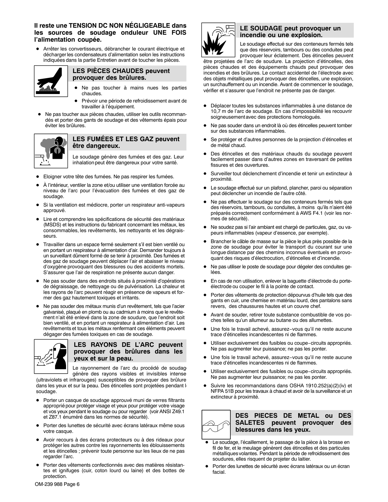 QUES peuvent endommager les cir- cuits imprimés. Établir la connexion avec la barrette de terre avant de manipuler des cartes ou des pièces. Utiliser des pochettes et des boîtes antista- tiques pour stocker, déplacer ou expédier des cartes de circuits imprimes.OM-239 988 Page 8 Les PIÈCES MOBILES peuvent causer des blessures. Ne pas s’approcher des organes mobiles. Ne pas s’approcher des points de coincement tels que des rouleaux de commande. LES FILS DE SOUDAGE peuvent provoquer des blessures. Ne pas appuyer sur la gâchette avant d’en avoir reçu l’instruction. Ne pas diriger le pistolet vers soi, d’autres personnes ou toute pièce mécanique en engageant le fil de soudage. Les PIÈCES MOBILES peuvent causer des blessures. S’abstenir de toucher des organes mobiles tels que des ventilateurs. Maintenir fermés et verrouillés les portes, panneaux, recouvrements et dispositifs de protection. Lorsque cela est nécessaire pour des travaux d’entretien et de dépannage, faire retirer les portes, panneaux, recouvrements ou dispositifs de protection uniquement par du personnel qua- lifié. Remettre les portes, panneaux, recouvrements ou dispositifs de protection quand l’entretien est terminé et avant de rebrancher l’alimentation électrique.