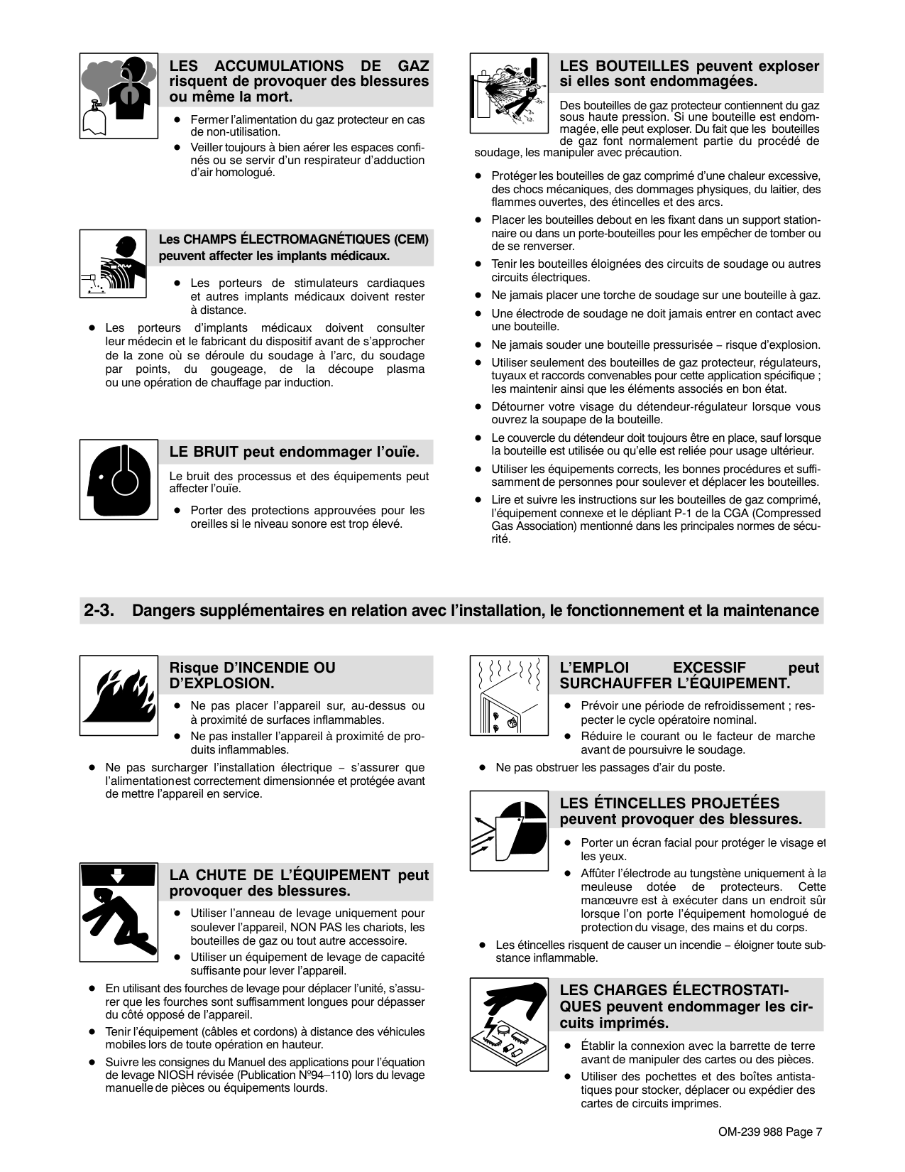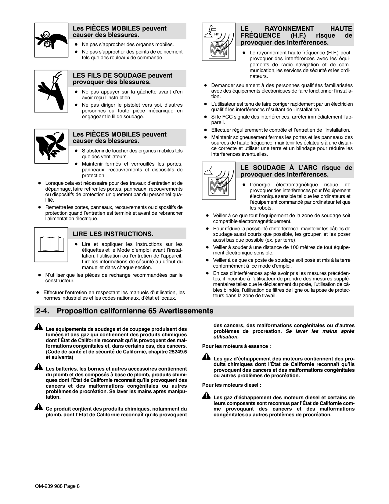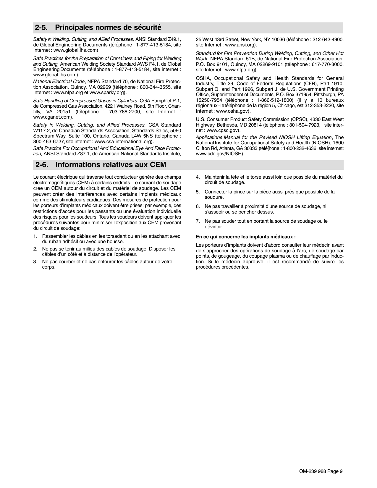 risque de provoquer des interférences. Le rayonnement haute fréquence (H.F.) peut provoquer des interférences avec les équi- pements de radio−navigation et de com- munication, les services de sécurité et les ordi- nateurs. Demander seulement à des personnes qualifiées familiarisées avec des équipements électroniques de faire fonctionner l’installa- tion. L’utilisateur est tenu de faire corriger rapidement par un électricien qualifié les interférences résultant de l’installation. Si le FCC signale des interférences, arrêter immédiatement l’ap- pareil. Effectuer régulièrement le contrôle et l’entretien de l’installation. Maintenir soigneusement fermés les portes et les panneaux des sources de haute fréquence, maintenir les éclateurs à une distan- ce correcte et utiliser une terre et un blindage pour réduire les interférences éventuelles. LE SOUDAGE À L’ARC risque de provoquer des interférences. L’énergie électromagnétique risque de provoquer des interférences pour l’équipement électronique sensible tel que les ordinateurs et l’équipement commandé par ordinateur tel que les robots. Veiller à ce que tout l’équipement de la zone de soudage soit compatible électromagnétiquement. Pour réduire la possibilité d’interférence, maintenir les câbles de soudage aussi courts que possible, les grouper, et les poser aussi bas que possible (ex. par terre). Veiller à souder à une distance de 100 mètres de tout équipe- ment électronique sensible. Veiller à ce que ce poste de soudage soit posé et mis à la terre conformément à ce mode d’emploi. En cas d’interférences après avoir pris les mesures précéden- tes, il incombe à l’utilisateur de prendre des mesures supplé- mentaires telles que le déplacement du poste, l’utilisation de câ- bles blindés, l’utilisation de filtres de ligne ou la pose de protec- teurs dans la zone de travail. 2-4. Proposition californienne 65 Avertissements Les équipements de soudage et de coupage produisent des fumées et des gaz qui contiennent des produits chimiques dont l’État de Californie reconnaît qu’ils provoquent des mal- formations congénitales et, dans certains cas, des cancers. (Code de santé et de sécurité de Californie, chapitre 25249.5 et suivants) Les batteries, les bornes et autres accessoires contiennent du plomb et des composés à base de plomb, produits chimi- ques dont l’État de Californie reconnaît qu’ils provoquent des cancers et des malformations congénitales ou autres problèmes de procréation. Se laver les mains après manipu- lation. Ce produit contient des produits chimiques, notamment du plomb, dont l’État de Californie reconnaît qu’ils provoquent des cancers, des malformations congénitales ou d’autres problèmes de procréation. Se laver les mains après utilisation. Pour les moteurs à essence : Les gaz d’échappement des moteurs contiennent des pro- duits chimiques dont l’État de Californie reconnaît qu’ils provoquent des cancers et des malformations congénitales ou autres problèmes de procréation. Pour les moteurs diesel : Les gaz d’échappement des moteurs diesel et certains de leurs composants sont reconnus par l’État de Californie com- me provoquant des cancers et des malformations congénitales ou autres problèmes de procréation.OM-239 988 Page 9 2-5. Principales normes de sécurité Safety in Welding, Cutting, and Allied Processes, ANSI Standard Z49.1, de Global Engineering Documents (téléphone : 1-877-413-5184, site Internet : www.global.ihs.com). Safe Practices for the Preparation of Containers and Piping for Welding and Cutting, American Welding Society Standard AWS F4.1, de Global Engineering Documents (téléphone : 1-877-413-5184, site internet : www.global.ihs.com). National Electrical Code, NFPA Standard 70, de National Fire Protec- tion Association, Quincy, MA 02269 (téléphone : 800-344-3555, site Internet : www.nfpa.org et www.sparky.org). Safe Handling of Compressed Gases in Cylinders, CGA Pamphlet P-1, de Compressed Gas Association, 4221 Walney Road, 5th Floor, Chan- tilly, VA 20151 (téléphone : 703-788-2700, site Internet : www.cganet.com). Safety in Welding, Cutting, and Allied Processes, CSA Standard W117.2, de Canadian Standards Association, Standards Sales, 5060 Spectrum Way, Suite 100, Ontario, Canada L4W 5NS (téléphone : 800-463-6727, site internet : www.csa-international.org). Safe Practice For Occupational And Educational Eye And Face Protec- tion, ANSI Standard Z87.1, de American National Standards Institute, 25 West 43rd Street, New York, NY 10036 (téléphone : 212-642-4900, site Internet : www.ansi.org). Standard for Fire Prevention During Welding, Cutting, and Other Hot Work, NFPA Standard 51B, de National Fire Protection Association, P.O. Box 9101, Quincy, MA 02269-9101 (téléphone : 617-770-3000, site Internet : www.nfpa.org). OSHA, Occupational Safety and Health Standards for General Industry, Title 29, Code of Federal Regulations (CFR), Part 1910, Subpart Q, and Part 1926, Subpart J, de U.S. Government Printing Office, Superintendent of Documents, P.O. Box 371954, Pittsburgh, PA 15250-7954 (téléphone : 1-866-512-1800) (il y a 10 bureaux régionaux−le téléphone de la région 5, Chicago, est 312-353-2220, site Internet : www.osha.gov). U.S. Consumer Product Safety Commission (CPSC), 4330 East West Highway, Bethesda, MD 20814 (téléphone : 301-504-7923, site inter- net : www.cpsc.gov). Applications Manual for the Revised NIOSH Lifting Equation, The National Institute for Occupational Safety and Health (NIOSH), 1600 Clifton Rd, Atlanta, GA 30333 (télé[hone : 1-800-232-4636, site internet: www.cdc.gov/NIOSH). 2-6. Informations relatives aux CEM Le courant électrique qui traverse tout conducteur génère des champs électromagnétiques (CEM) à certains endroits. Le courant de soudage crée un CEM autour du circuit et du matériel de soudage. Les CEM peuvent cr