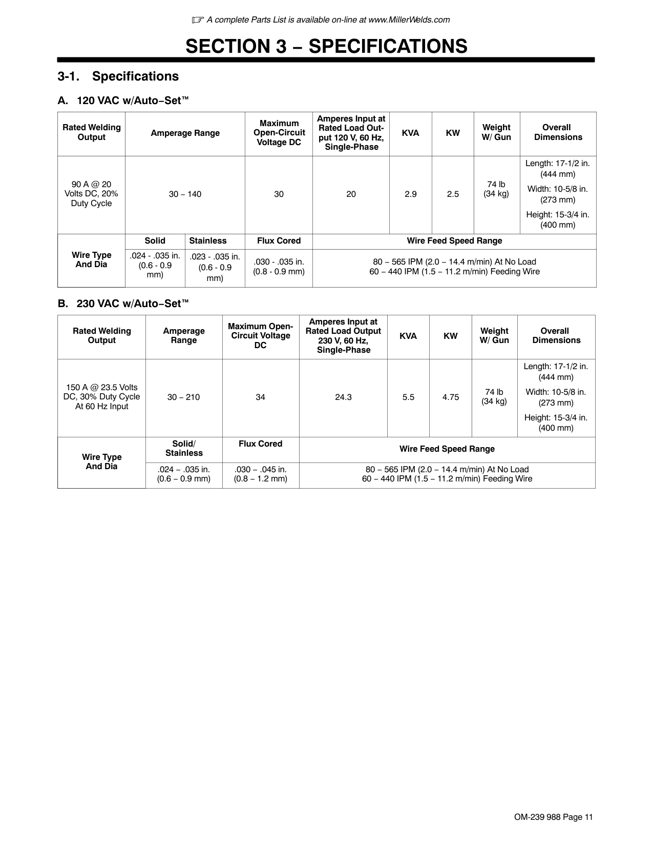 Volts DC, 20% Duty Cycle 30 − 140 30 20 2.9 2.5 74 lb (34 kg) Length: 17-1/2 in. (444 mm) Width: 10-5/8 in. (273 mm) Height: 15-3/4 in. (400 mm) Wire Type And Dia Solid Stainless Flux Cored Wire Feed Speed Range .024 - .035 in. (0.6 - 0.9 mm) .023 - .035 in. (0.6 - 0.9 mm) .030 - .035 in. (0.8 - 0.9 mm) 80 − 565 IPM (2.0 − 14.4 m/min) At No Load 60 − 440 IPM (1.5 − 11.2 m/min) Feeding WireB.