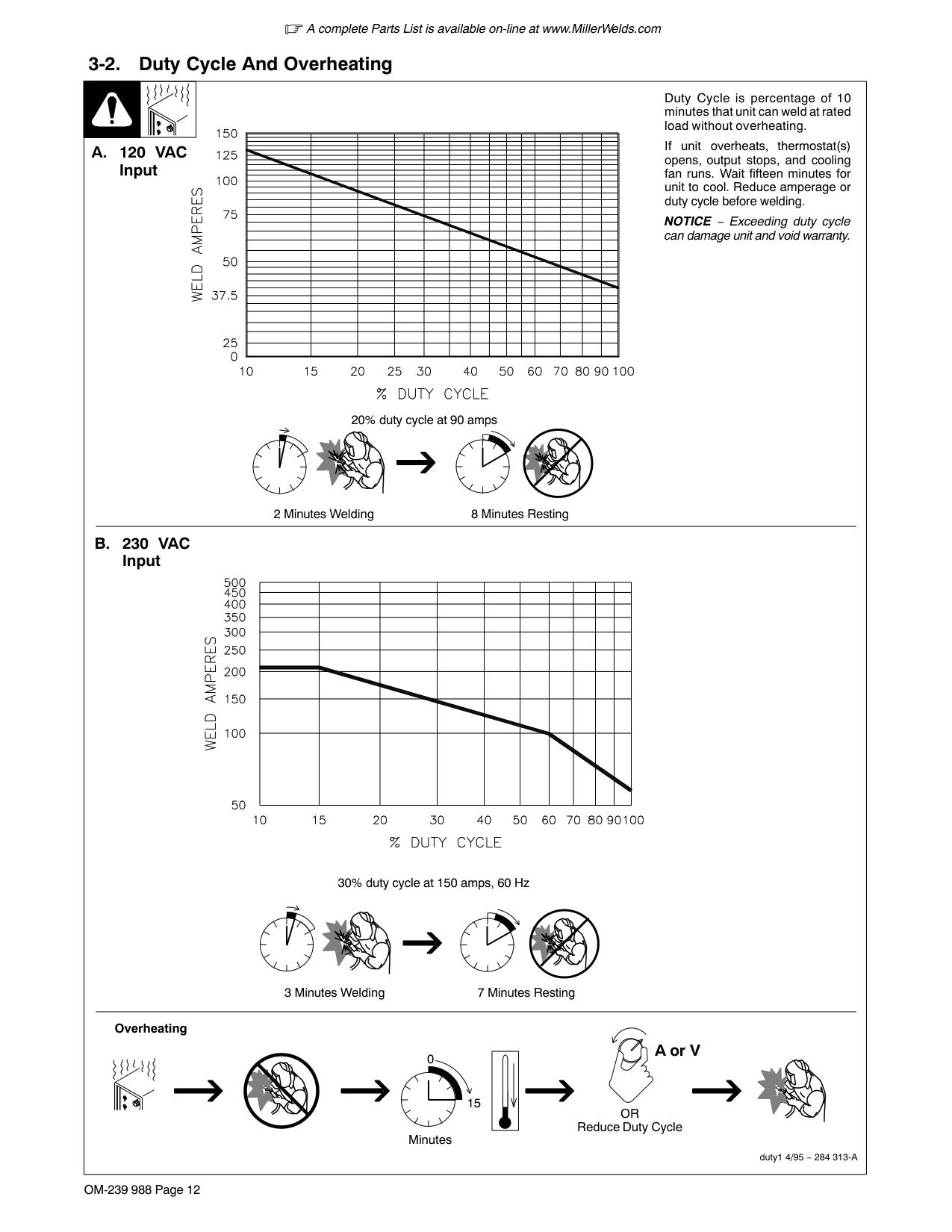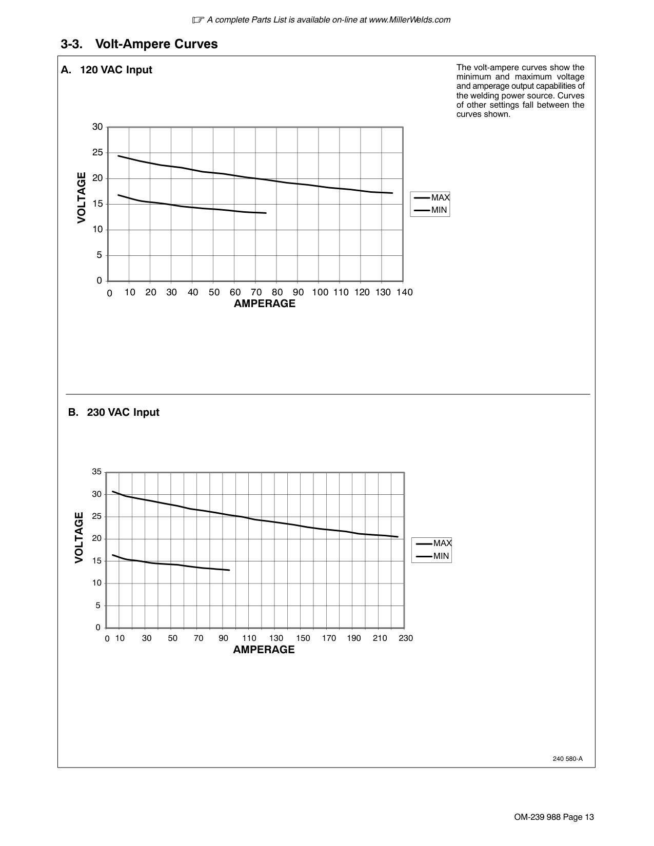 Input 3 Minutes Welding 7 Minutes Resting 20% duty cycle at 90 amps 30% duty cycle at 150 amps, 60 Hz 2 Minutes Welding 8 Minutes RestingA complete Parts List is available on-line at www.MillerWelds.com OM-239 988 Page 13 3-3. Volt-Ampere Curves The volt-ampere curves show the minimum and maximum voltage and amperage output capabilities of the welding power source. Curves of other settings fall between the curves shown.