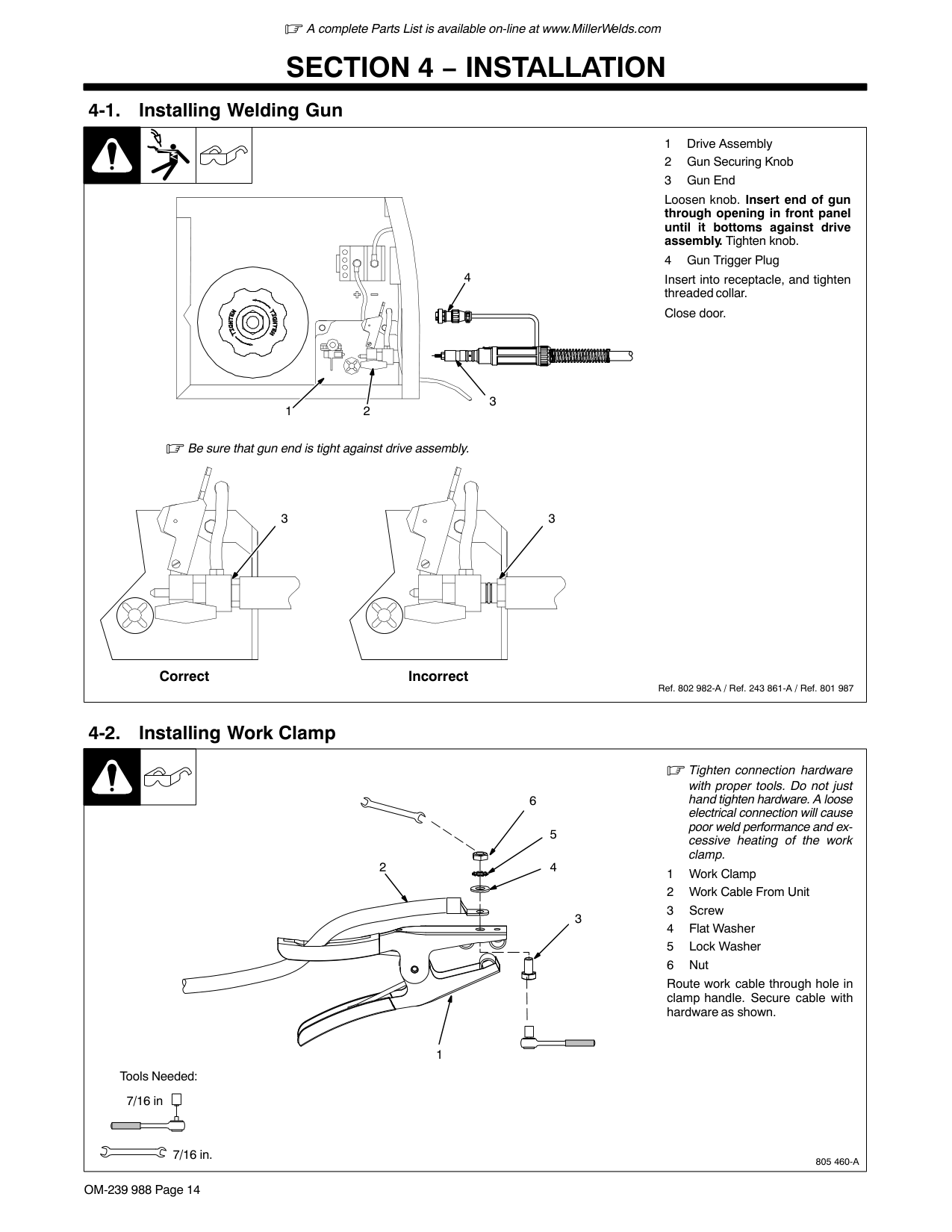 4-1. Installing Welding Gun Ref. 802 982-A / Ref. 243 861-A / Ref. 801 987 1 Drive Assembly 2 Gun Securing Knob 3 Gun End Loosen knob. Insert end of gun through opening in front panel until it bottoms against drive assembly. Tighten knob. 4 Gun Trigger Plug Insert into receptacle, and tighten threaded collar. Close door. Correct Incorrect Be sure that gun end is tight against drive assembly. 3 3 2 1 4 3 4-2. Installing Work Clamp Tighten connection hardware with proper tools. Do not just hand tighten hardware. A loose electrical connection will cause poor weld performance and ex- cessive heating of the work clamp. 1 Work Clamp 2 Work Cable From Unit 3 Screw 4 Flat Washer 5 Lock Washer 6 Nut Route work cable through hole in clamp handle. Secure cable with hardware as shown.805 460-A
