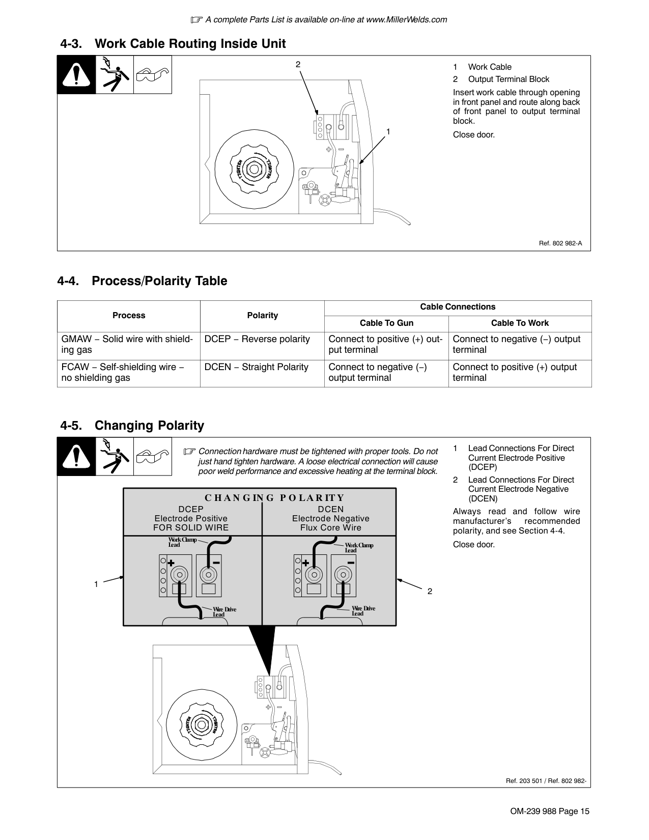 2 6 1 Tools Needed: 7/16 in. 7/16 in 3 4 5A complete Parts List is available on-line at www.MillerWelds.com OM-239 988 Page 15 4-3. Work Cable Routing Inside Unit Ref. 802 982-A 1 Work Cable 2 Output Terminal Block Insert work cable through opening in front panel and route along back of front panel to output terminal block. Close door. 2 1 4-4. Process/Polarity Table Process Polarity Cable Connections Cable To Gun Cable To Work GMAW − Solid wire with shield- ing gas DCEP − Reverse polarity Connect to positive (+) out- put terminal Connect to negative (−) output terminal FCAW − Self-shielding wire − no shielding gas DCEN − Straight Polarity Connect to negative (−) output terminal Connect to positive (+) output terminal 4-5. Changing Polarity 1 Lead Connections For Direct Current Electrode Positive