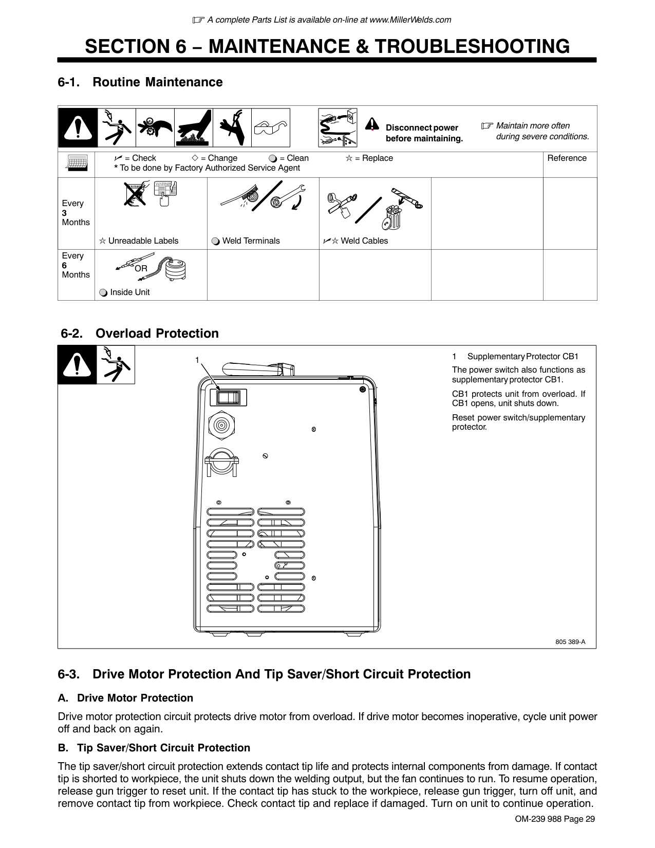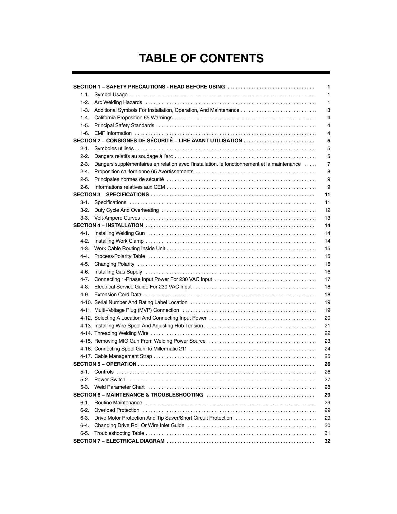 29 . . . . . . . . . . . . . . . . . . . . . . . . . . . . . . . . . . . . . . . . . 6-1. Routine Maintenance 29 . . . . . . . . . . . . . . . . . . . . . . . . . . . . . . . . . . . . . . . . . . . . . . . . . . . . . . . . . . . . . . . . . 6-2. Overload Protection 29 . . . . . . . . . . . . . . . . . . . . . . . . . . . . . . . . . . . . . . . . . . . . . . . . . . . . . . . . . . . . . . . . . . 6-3. Drive Motor Protection And Tip Saver/Short Circuit Protection 29 . . . . . . . . . . . . . . . . . . . . . . . . . . . . . . . 6-4. Changing Drive Roll Or Wire Inlet Guide 30 . . . . . . . . . . . . . . . . . . . . . . . . . . . . . . . . . . . . . . . . . . . . . . . . . 6-5. Troubleshooting Table 31 . . . . . . . . . . . . . . . . . . . . . . . . . . . . . . . . . . . . . . . . . . . . . . . . . . . . . . . . . . . . . . . . .Section 7 − Electrical Diagram