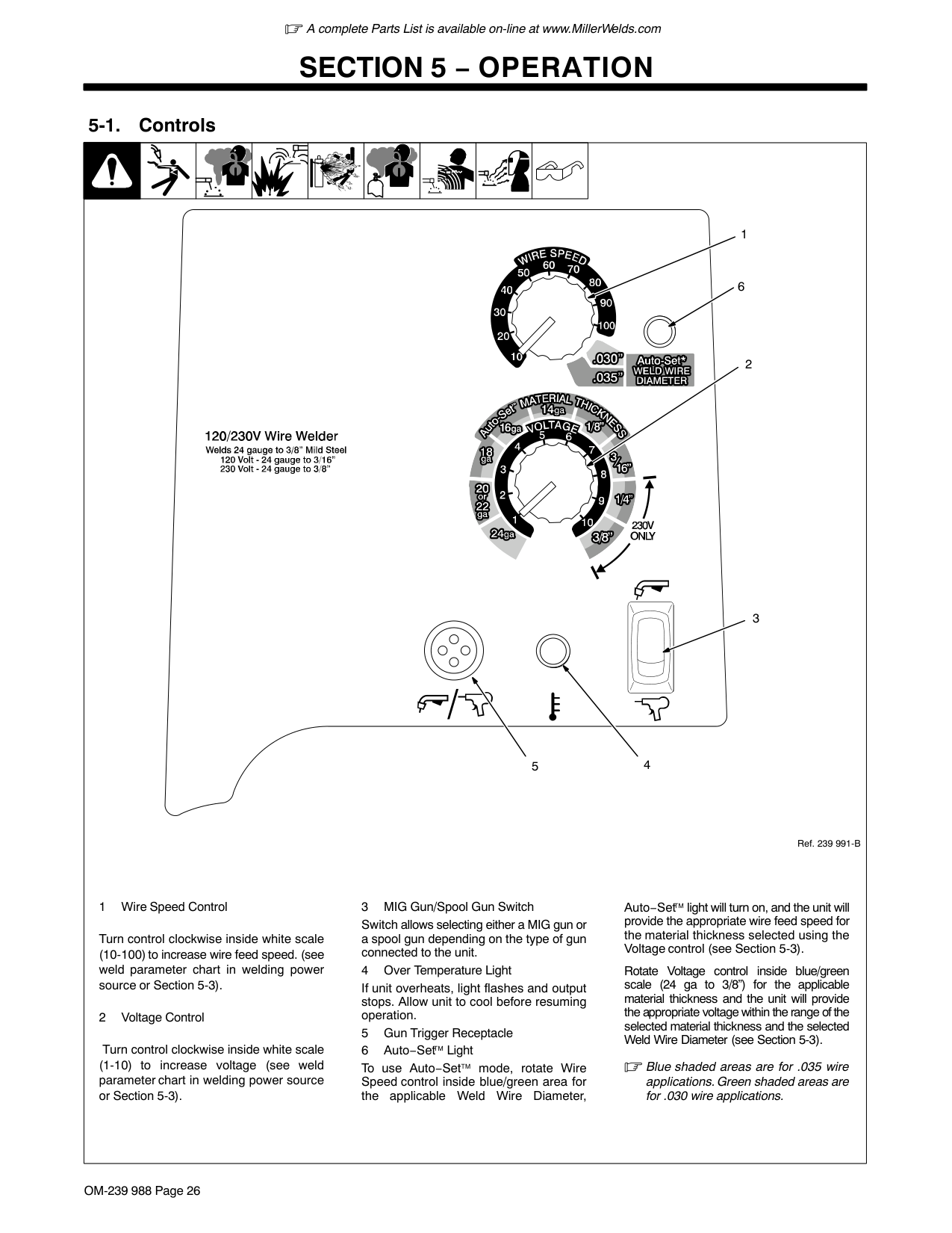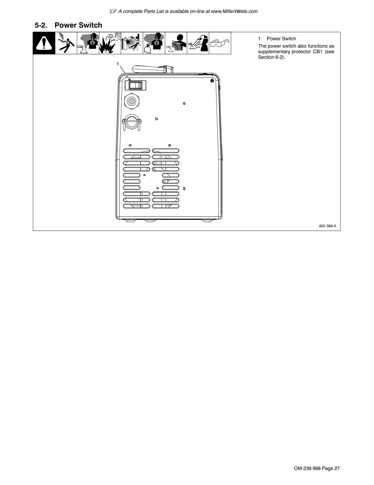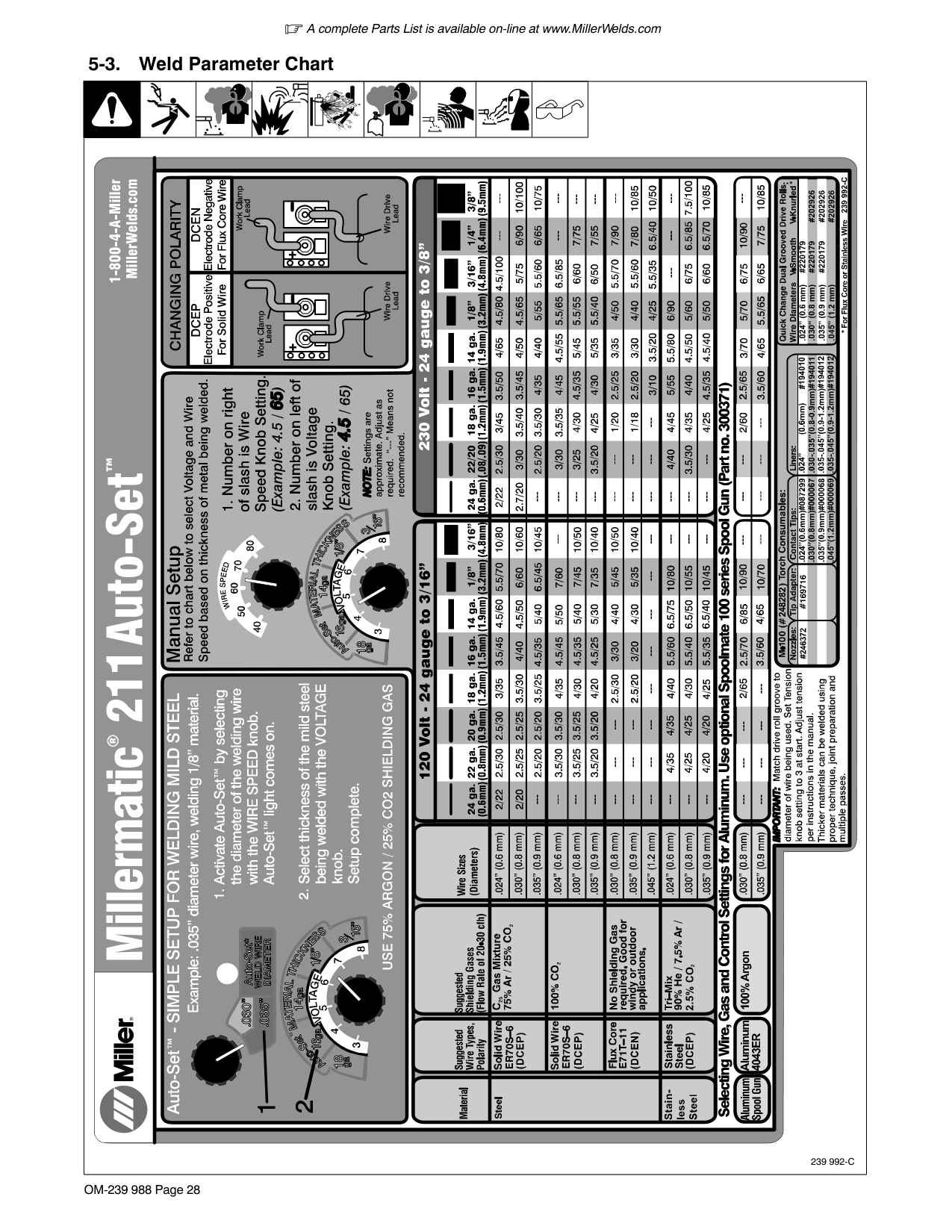 1 Power Switch The power switch also functions as supplementary protector CB1 (see Section 6-2). 1A complete Parts List is available on-line at www.MillerWelds.com OM-239 988 Page 28 5-3. Weld Parameter Chart