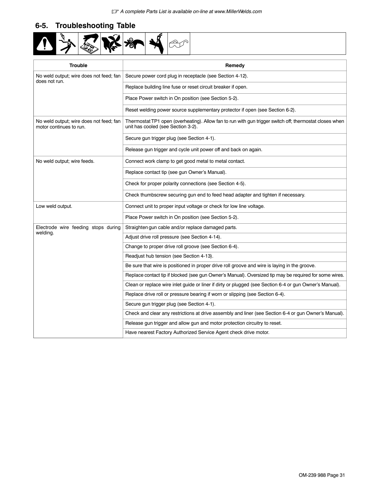 A complete Parts List is available on-line at www.MillerWelds.com OM-239 988 Page 31 6-5. Troubleshooting Table Trouble Remedy No weld output; wire does not feed; fan does not run. Secure power cord plug in receptacle (see Section 4-12). Replace building line fuse or reset circuit breaker if open. Place Power switch in On position (see Section 5-2). Reset welding power source supplementary protector if open (see Section 6-2). No weld output; wire does not feed; fan motor continues to run. Thermostat TP1 open (overheating). Allow fan to run with gun trigger switch off; thermostat closes when unit has cooled (see Section 3-2). Secure gun trigger plug (see Section 4-1). Release gun trigger and cycle unit power off and back on again. No weld output; wire feeds. Connect work clamp to get good metal to metal contact. Replace contact tip (see gun Owner’s Manual). Check for proper polarity connections (see Section 4-5). Check thumbscrew securing gun end to feed head adapter and tighten if necessary. Low weld output. Connect unit to proper input voltage or check for low line voltage. Place Power switch in On position (see Section 5-2). Electrode wire feeding stops during welding. Straighten gun cable and/or replace damaged parts. Adjust drive roll pressure (see Section 4-14). Change to proper drive roll groove (see Section 6-4). Readjust hub tension (see Section 4-13). Be sure that wire is positioned in proper drive roll groove and wire is laying in the groove. Replace contact tip if blocked (see gun Owner’s Manual). Oversized tip may be required for some wires. Clean or replace wire inlet guide or liner if dirty or plugged (see Section 6-4 or gun Owner’s Manual). Replace drive roll or pressure bearing if worn or slipping (see Section 6-4). Secure gun trigger plug (see Section 4-1). Check and clear any restrictions at drive assembly and liner (see Section 6-4 or gun Owner’s Manual). Release gun trigger and allow gun and motor protection circuitry to reset. Have nearest Factory Authorized Service Agent check drive motor.
