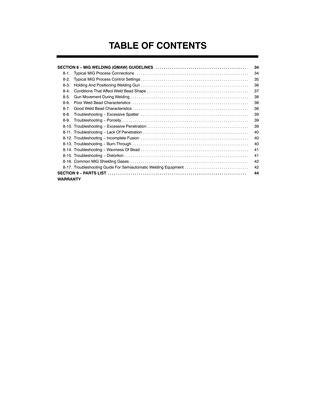 34 . . . . . . . . . . . . . . . . . . . . . . . . . . . . . . . . . . . . . . . . . . . . 8-1. Typical MIG Process Connections 34 . . . . . . . . . . . . . . . . . . . . . . . . . . . . . . . . . . . . . . . . . . . . . . . . . . . . . . 8-2. Typical MIG Process Control Settings 35 . . . . . . . . . . . . . . . . . . . . . . . . . . . . . . . . . . . . . . . . . . . . . . . . . . . . 8-3. Holding And Positioning Welding Gun 36 . . . . . . . . . . . . . . . . . . . . . . . . . . . . . . . . . . . . . . . . . . . . . . . . . . . . 8-4. Conditions That Affect Weld Bead Shape 37 . . . . . . . . . . . . . . . . . . . . . . . . . . . . . . . . . . . . . . . . . . . . . . . . . 8-5. Gun Movement During Welding 38 . . . . . . . . . . . . . . . . . . . . . . . . . . . . . . . . . . . . . . . . . . . . . . . . . . . . . . . . . 8-6. Poor Weld Bead Characteristics 38 . . . . . . . . . . . . . . . . . . . . . . . . . . . . . . . . . . . . . . . . . . . . . . . . . . . . . . . . 8-7. Good Weld Bead Characteristics 38 . . . . . . . . . . . . . . . . . . . . . . . . . . . . . . . . . . . . . . . . . . . . . . . . . . . . . . . . 8-8. Troubleshooting − Excessive Spatter 39 . . . . . . . . . . . . . . . . . . . . . . . . . . . . . . . . . . . . . . . . . . . . . . . . . . . . 8-9. Troubleshooting − Porosity 39 . . . . . . . . . . . . . . . . . . . . . . . . . . . . . . . . . . . . . . . . . . . . . . . . . . . . . . . . . . . . . 8-10. Troubleshooting − Excessive Penetration 39 . . . . . . . . . . . . . . . . . . . . . . . . . . . . . . . . . . . . . . . . . . . . . . . . . 8-11. Troubleshooting − Lack Of Penetration 40 . . . . . . . . . . . . . . . . . . . . . . . . . . . . . . . . . . . . . . . . . . . . . . . . . . . 8-12. Troubleshooting − Incomplete Fusion 40 . . . . . . . . . . . . . . . . . . . . . . . . . . . . . . . . . . . . . . . . . . . . . . . . . . . . 8-13. Troubleshooting − Burn-Through 40 . . . . . . . . . . . . . . . . . . . . . . . . . . . . . . . . . . . . . . . . . . . . . . . . . . . . . . . . 8-14. Troubleshooting − Waviness Of Bead 41 . . . . . . . . . . . . . . . . . . . . . . . . . . . . . . . . . . . . . . . . . . . . . . . . . . . . 8-15. Troubleshooting − Distortion 41 . . . . . . . . . . . . . . . . . . . . . . . . . . . . . . . . . . . . . . . . . . . . . . . . . . . . . . . . . . . . 8-16. Common MIG Shielding Gases 42 . . . . . . . . . . . . . . . . . . . . . . . . . . . . . . . . . . . . . . . . . . . . . . . . . . . . . . . . . 8-17. Troubleshooting Guide For Semiautomatic Welding Equipment 42 . . . . . . . . . . . . . . . . . . . . . . . . . . . . . . .Section 9 − Parts List