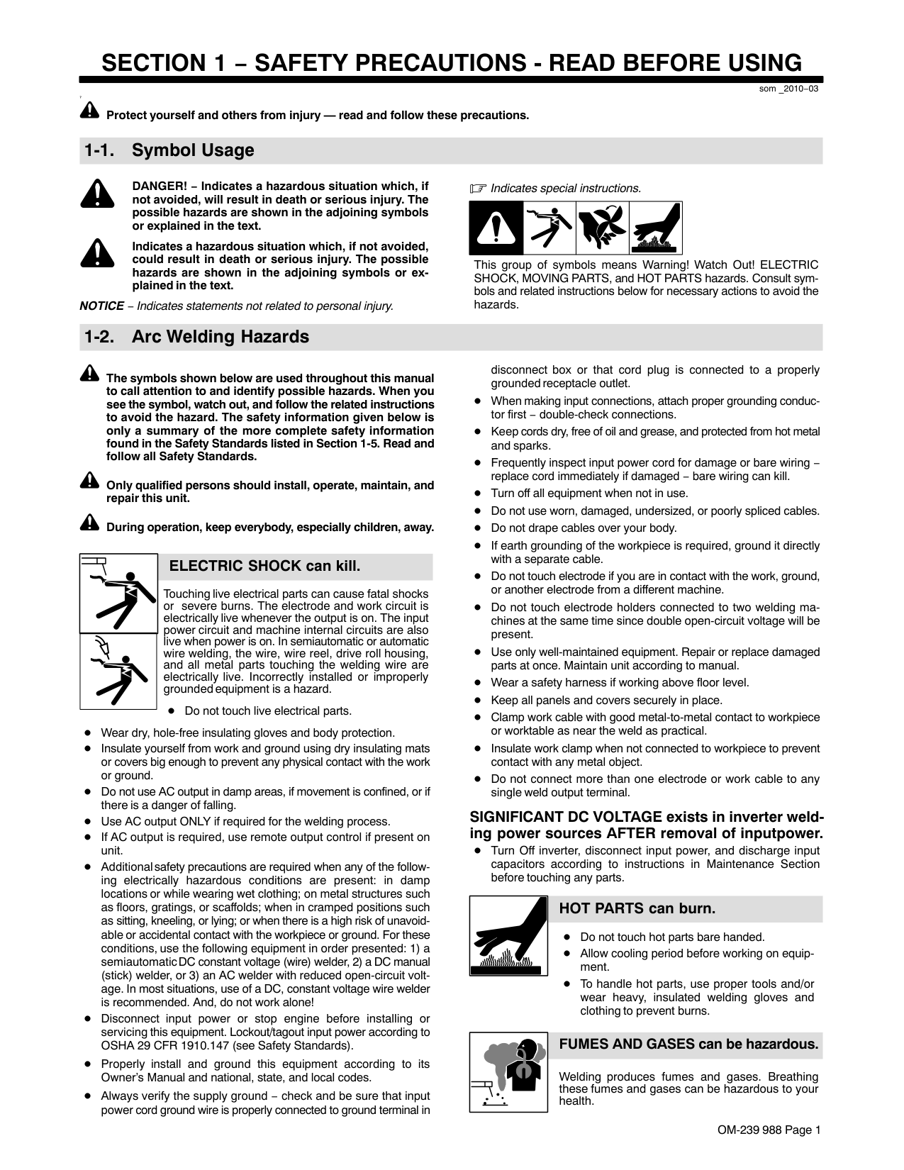 som _2010−03 7 Protect yourself and others from injury — read and follow these precautions. 1-1. Symbol Usage DANGER! − Indicates a hazardous situation which, if not avoided, will result in death or serious injury. The possible hazards are shown in the adjoining symbols or explained in the text. Indicates a hazardous situation which, if not avoided, could result in death or serious injury. The possible hazards are shown in the adjoining symbols or ex- plained in the text. NOTICE − Indicates statements not related to personal injury. Indicates special instructions. This group of symbols means Warning! Watch Out! ELECTRIC SHOCK, MOVING PARTS, and HOT PARTS hazards. Consult sym- bols and related instructions below for necessary actions to avoid the hazards. 1-2. Arc Welding Hazards The symbols shown below are used throughout this manual to call attention to and identify possible hazards. When you see the symbol, watch out, and follow the related instructions to avoid the hazard. The safety information given below is only a summary of the more complete safety information found in the Safety Standards listed in Section 1-5. Read and follow all Safety Standards. Only qualified persons should install, operate, maintain, and repair this unit. During operation, keep everybody, especially children, away. ELECTRIC SHOCK can kill. Touching live electrical parts can cause fatal shocks or severe burns. The electrode and work circuit is electrically live whenever the output is on. The input power circuit and machine internal circuits are also live when power is on. In semiautomatic or automatic wire welding, the wire, wire reel, drive roll housing, and all metal parts touching the welding wire are electrically live. Incorrectly installed or improperly grounded equipment is a hazard. Do not touch live electrical parts. Wear dry, hole-free insulating gloves and body protection. Insulate yourself from work and ground using dry insulating mats or covers big enough to prevent any physical contact with the work or ground. Do not use AC output in damp areas, if movement is confined, or if there is a danger of falling. Use AC output ONLY if required for the welding process. If AC output is required, use remote output control if present on unit. Additional safety precautions are required when any of the follow- ing electrically hazardous conditions are present: in damp locations or while wearing wet clothing; on metal structures such as floors, gratings, or scaffolds; when in cramped positions such as sitting, kneeling, or lying; or when there is a high risk of unavoid- able or accidental contact with the workpiece or ground. For these conditions, use the following equipment in order presented: 1) a semiautomatic DC constant voltage (wire) welder, 2) a DC manual (stick) welder, or 3) an AC welder with reduced open-circuit volt- age. In most situations, use of a DC, constant voltage wire welder is recommended. And, do not work alone! Disconnect input power or stop engine before installing or servicing this equipment. Lockout/tagout input power according to OSHA 29 CFR 1910.147 (see Safety Standards). Properly install and ground this equipment according to its Owner’s Manual and national, state, and local codes. Always verify the supply ground − check and be sure that input power cord ground wire is properly connected to ground terminal in disconnect box or that cord plug is connected to a properly grounded receptacle outlet. When making input connections, attach proper grounding conduc- tor first − double-check connections. Keep cords dry, free of oil and grease, and protected from hot metal and sparks. Frequently inspect input power cord for damage or bare wiring − replace cord immediately if damaged − bare wiring can kill. Turn off all equipment when not in use. Do not use worn, damaged, undersized, or poorly spliced cables. Do not drape cables over your body. If earth grounding of the workpiece is required, ground it directly with a separate cable. Do not touch electrode if you are in contact with the work, ground, or another electrode from a different machine. Do not touch electrode holders connected to two welding ma- chines at the same time since double open-circuit voltage will be present. Use only well-maintained equipment. Repair or replace damaged parts at once. Maintain unit according to manual. Wear a safety harness if working above floor level. Keep all panels and covers securely in place. Clamp work cable with good metal-to-metal contact to workpiece or worktable as near the weld as practical. Insulate work clamp when not connected to workpiece to prevent contact with any metal object. Do not connect more than one electrode or work cable to any single weld output terminal. SIGNIFICANT DC VOLTAGE exists in inverter weld- ing power sources AFTER removal of inputpower. Turn Off inverter, disconnect input power, and discharge input capacitors according to instructions in Maintenance Section before touching any parts. HOT PARTS can burn. Do not touch hot parts bare handed. Allow cooling period before working on equip- ment. To handle hot parts, use proper tools and/or wear heavy, insulated welding gloves and clothing to prevent burns. Welding produces fumes and gases. Breathing these fumes and gases can be hazardous to your health. FUMES AND GASES can be hazardous.OM-239 988 Page 2 Keep your head out of the fumes. Do not breathe the fumes. If inside, ventilate the area and/or use local forced ventilation at the arc to remove welding fumes and gases. If ventilation is poor, wear an approved air-supplied respirator. Read and understand the Material Safety Data Sheets (MSDSs) and the manufacturer’s instructions for metals, consumables, coatings, cleaners, and degreasers. Work in a confined space only if it is well ventilated, or while wearing an air-supplied respirator. Always have a trained watch- person nearby. Welding fumes and gases can displace air and lower the oxygen level causin