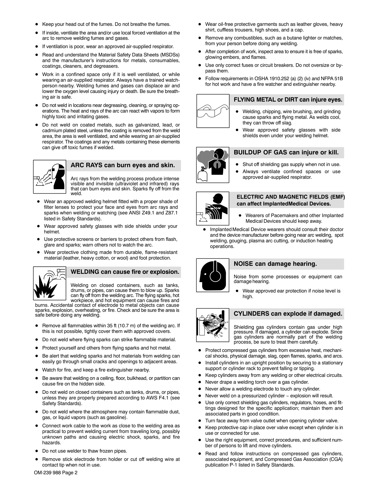 Read and follow all labels and the Owner’s Manual carefully before installing, operating, or servicing unit. Read the safety information at the beginning of the manual and in each section. Use only genuine replacement parts from the manufacturer. Perform maintenance and service according to the Owner’s Manuals, industry standards, and national, state, and local codes. H.F. RADIATION can cause interference. High-frequency (H.F.) can interfere with radio navigation, safety services, computers, and communications equipment. Have only qualified persons familiar with electronic equipment perform this installation. The user is responsible for having a qualified electrician prompt- ly correct any interference problem resulting from the installa- tion. If notified by the FCC about interference, stop using the equipment at once. Have the installation regularly checked and maintained. Keep high-frequency source doors and panels tightly shut, keep spark gaps at correct setting, and use grounding and shielding to minimize the possibility of interference. ARC WELDING can cause interference. Electromagnetic energy can interfere with sensitive electronic equipment such as computers and computer-driven equipment such as robots. Be sure all equipment in the welding area is electromagnetically compatible. To reduce possible interference, keep weld cables as short as possible, close together, and down low, such as on the floor. Locate welding operation 100 meters from any sensitive elec- tronic equipment. Be sure this welding machine is installed and grounded according to this manual. If interference still occurs, the user must take extra measures such as moving the welding machine, using shielded cables, using line filters, or shielding the work area.OM-239 988 Page 4 1-4. California Proposition 65 Warnings Welding or cutting equipment produces fumes or gases which contain chemicals known to the State of California to cause birth defects and, in some cases, cancer. (California Health & Safety Code Section 25249.5 et seq.) Battery posts, terminals and related accessories contain lead and lead compounds, chemicals known to the State of California to cause cancer and birth defects or other reproductive harm. Wash hands after handling. This product contains chemicals, including lead, known to the state of California to cause cancer, birth defects, or other reproductive harm. Wash hands after use. For Gasoline Engines: Engine exhaust contains chemicals known to the State of California to cause cancer, birth defects, or other reproduc- tive harm. For Diesel Engines: Diesel engine exhaust and some of its constituents are known to the State of California to cause cancer, birth defects, and other reproductive harm. 1-5. Principal Safety Standards Safety in Welding, Cutting, and Allied Processes, ANSI Standard Z49.1, from Global Engineering Documents (phone: 1-877-413-5184, website: www.global.ihs.com). Safe Practices for the Preparation of Containers and Piping for Welding and Cutting, American Welding Society Standard AWS F4.1, from Glob- al Engineering Documents (phone: 1-877-413-5184, website: www.global.ihs.com). National Electrical Code, NFPA Standard 70, from National Fire Protec- tion Association, Quincy, MA 02269 (phone: 1-800-344-3555, website: www.nfpa.org and www. sparky.org). Safe Handling of Compressed Gases in Cylinders, CGA Pamphlet P-1, from Compressed Gas Association, 4221 Walney Road, 5th Floor, Chantilly, VA 20151 (phone: 703-788-2700, website:www.cganet.com). Safety in Welding, Cutting, and Allied Processes, CSA Standard W117.2, from Canadian Standards Association, Standards Sales, 5060 Spectrum Way, Suite 100, Ontario, Canada L4W 5NS (phone: 800-463-6727, website: www.csa-international.org). Safe Practice For Occupational And Educational Eye And Face Protec- tion, ANSI Standard Z87.1, from American National Standards Institute, 25 West 43rd Street, New York, NY 10036 (phone: 212-642-4900, web- site: www.ansi.org). Standard for Fire Prevention During Welding, Cutting, and Other Hot Work, NFPA Standard 51B, from National Fire Protection Association, Quincy, MA 02269 (phone: 1-800-344-3555, website: www.nfpa.org. OSHA, Occupational Safety and Health Standards for General Indus- try, Title 29, Code of Federal Regulations (CFR), Part 1910, Subpart Q, and Part 1926, Subpart J, from U.S. Government Printing Office, Super- intendent of Documents, P.O. Box 371954, Pittsburgh, PA 15250-7954 (phone: 1-866-512-1800) (there are 10 OSHA Regional Offices— phone for Region 5, Chicago, is 312-353-2220, website: www.osha.gov). U.S. Consumer Product Safety Commission (CPSC), 4330 East West Highway, Bethesda, MD 20814 (phone: 301-504-7923, website: www.cpsc.gov). Applications Manual for the Revised NIOSH Lifting Equation, The Na- tional Institute for Occupational Safety and Health (NIOSH), 1600 Clifton Rd, Atlanta, GA 30333 (phone: 1-800-232-4636, website: www.cdc.gov/NIOSH). 1-6. EMF Information Electric current flowing through any conductor causes localized electric and magnetic fields (EMF). Welding current creates an EMF field around the welding circuit and welding equipment. EMF fields may inter- fere with some medical implants, e.g. pacemakers. Protective measures for persons wearing medical implants have to be taken. For example, access restrictions for passers−by or individual risk assess- ment for welders. All welders should use the following procedures in order to minimize exposure to EMF fields from the welding circuit: