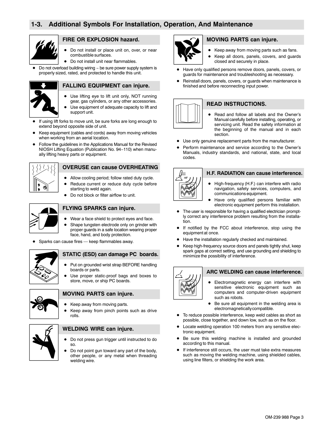 can affect ImplantedMedical Devices. Wearers of Pacemakers and other Implanted Medical Devices should keep away. Implanted Medical Device wearers should consult their doctor and the device manufacturer before going near arc welding, spot welding, gouging, plasma arc cutting, or induction heating operations. NOISE can damage hearing. Noise from some processes or equipment can damage hearing. Wear approved ear protection if noise level is high. Shielding gas cylinders contain gas under high pressure. If damaged, a cylinder can explode. Since gas cylinders are normally part of the welding process, be sure to treat them carefully. CYLINDERS can explode if damaged. Protect compressed gas cylinders from excessive heat, mechani- cal shocks, physical damage, slag, open flames, sparks, and arcs. Install cylinders in an upright position by securing to a stationary support or cylinder rack to prevent falling or tipping. Keep cylinders away from any welding or other electrical circuits. Never drape a welding torch over a gas cylinder. Never allow a welding electrode to touch any cylinder. Never weld on a pressurized cylinder − explosion will result. Use only correct shielding gas cylinders, regulators, hoses, and fit- tings designed for the specific application; maintain them and associated parts in good condition. Turn face away from valve outlet when opening cylinder valve. Keep protective cap in place over valve except when cylinder is in use or connected for use. Use the right equipment, correct procedures, and sufficient num- ber of persons to lift and move cylinders. Read and follow instructions on compressed gas cylinders, associated equipment, and Compressed Gas Association (CGA) publication P-1 listed in Safety Standards.OM-239 988 Page 3 1-3. Additional Symbols For Installation, Operation, And Maintenance FIRE OR EXPLOSION hazard. Do not install or place unit on, over, or near combustible surfaces. Do not install unit near flammables. Do not overload building wiring − be sure power supply system is properly sized, rated, and protected to handle this unit. FALLING EQUIPMENT can injure. Use lifting eye to lift unit only, NOT running gear, gas cylinders, or any other accessories. Use equipment of adequate capacity to lift and support unit. If using lift forks to move unit, be sure forks are long enough to extend beyond opposite side of unit. Keep equipment (cables and cords) away from moving vehicles when working from an aerial location. Follow the guidelines in the Applications Manual for the Revised NIOSH Lifting Equation (Publication No. 94−110) when manu- ally lifting heavy parts or equipment. OVERUSE can cause OVERHEATING Allow cooling period; follow rated duty cycle. Reduce current or reduce duty cycle before starting to weld again. Do not block or filter airflow to unit. FLYING SPARKS can injure. Wear a face shield to protect eyes and face. Shape tungsten electrode only on grinder with proper guards in a safe location wearing proper face, hand, and body protection. Sparks can cause fires — keep flammables away. STATIC (ESD) can damage PC boards. Put on grounded wrist strap BEFORE handling boards or parts. Use proper static-proof bags and boxes to store, move, or ship PC boards. MOVING PARTS can injure. Keep away from moving parts. Keep away from pinch points such as drive rolls. WELDING WIRE can injure. Do not press gun trigger until instructed to do so. Do not point gun toward any part of the body, other people, or any metal when threading welding wire. MOVING PARTS can injure. Keep away from moving parts such as fans. Keep all doors, panels, covers, and guards closed and securely in place. Have only qualified persons remove doors, panels, covers, or guards for maintenance and troubleshooting as necessary. Reinstall doors, panels, covers, or guards when maintenance is finished and before reconnecting input power.