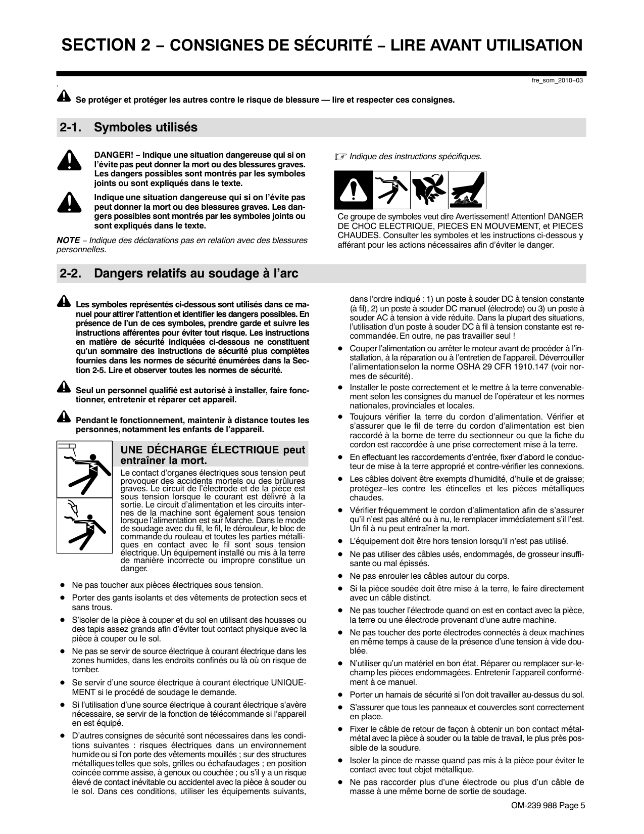 fre_som_2010−03 7 Se protéger et protéger les autres contre le risque de blessure — lire et respecter ces consignes. 2-1. Symboles utilisés DANGER! − Indique une situation dangereuse qui si on l’évite pas peut donner la mort ou des blessures graves. Les dangers possibles sont montrés par les symboles joints ou sont expliqués dans le texte. Indique une situation dangereuse qui si on l’évite pas peut donner la mort ou des blessures graves. Les dan- gers possibles sont montrés par les symboles joints ou sont expliqués dans le texte. NOTE − Indique des déclarations pas en relation avec des blessures personnelles. Indique des instructions spécifiques. Ce groupe de symboles veut dire Avertissement! Attention! DANGER DE CHOC ELECTRIQUE, PIECES EN MOUVEMENT, et PIECES CHAUDES. Consulter les symboles et les instructions ci-dessous y afférant pour les actions nécessaires afin d’éviter le danger. 2-2. Dangers relatifs au soudage à l’arc Les symboles représentés ci-dessous sont utilisés dans ce ma- nuel pour attirer l’attention et identifier les dangers possibles. En présence de l’un de ces symboles, prendre garde et suivre les instructions afférentes pour éviter tout risque. Les instructions en matière de sécurité indiquées ci-dessous ne constituent qu’un sommaire des instructions de sécurité plus complètes fournies dans les normes de sécurité énumérées dans la Sec- tion 2-5. Lire et observer toutes les normes de sécurité. Seul un personnel qualifié est autorisé à installer, faire fonc- tionner, entretenir et réparer cet appareil. Pendant le fonctionnement, maintenir à distance toutes les personnes, notamment les enfants de l’appareil. UNE DÉCHARGE ÉLECTRIQUE peut entraîner la mort. Le contact d’organes électriques sous tension peut provoquer des accidents mortels ou des brûlures graves. Le circuit de l’électrode et de la pièce est sous tension lorsque le courant est délivré à la sortie. Le circuit d’alimentation et les circuits inter- nes de la machine sont également sous tension lorsque l’alimentation est sur Marche. Dans le mode de soudage avec du fil, le fil, le dérouleur, le bloc de commande du rouleau et toutes les parties métalli- ques en contact avec le fil sont sous tension électrique. Un équipement installé ou mis à la terre de manière incorrecte ou impropre constitue un danger. Ne pas toucher aux pièces électriques sous tension. Porter des gants isolants et des vêtements de protection secs et sans trous. S’isoler de la pièce à couper et du sol en utilisant des housses ou des tapis assez grands afin d’éviter tout contact physique avec la pièce à couper ou le sol. Ne pas se servir de source électrique à courant électrique dans les zones humides, dans les endroits confinés ou là où on risque de tomber. Se servir d’une source électrique à courant électrique UNIQUE- MENT si le procédé de soudage le demande. Si l’utilisation d’une source électrique à courant électrique s’avère nécessaire, se servir de la fonction de télécommande si l’appareil en est équipé. D’autres consignes de sécurité sont nécessaires dans les condi- tions suivantes : risques électriques dans un environnement humide ou si l’on porte des vêtements mouillés ; sur des structures métalliques telles que sols, grilles ou échafaudages ; en position coincée comme assise, à genoux ou couchée ; ou s’il y a un risque élevé de contact inévitable ou accidentel avec la pièce à souder ou le sol. Dans ces conditions, utiliser les équipements suivants, dans l’ordre indiqué : 1) un poste à souder DC à tension constante (à fil), 2) un poste à souder DC manuel (électrode) ou 3) un poste à souder AC à tension à vide réduite. Dans la plupart des situations, l’utilisation d’un poste à souder DC à fil à tension constante est re- commandée. En outre, ne pas travailler seul ! Couper l’alimentation ou arrêter le moteur avant de procéder à l’in- stallation, à la réparation ou à l’entretien de l’appareil. Déverrouiller l’alimentation selon la norme OSHA 29 CFR 1910.147 (voir nor- mes de sécurité). Installer le poste correctement et le mettre à la terre convenable- ment selon les consignes du manuel de l’opérateur et les normes nationales, provinciales et locales. Toujours vérifier la terre du cordon d’alimentation. Vérifier et s’assurer que le fil de terre du cordon d’alimentation est bien raccordé à la borne de terre du sectionneur ou que la fiche du cordon est raccordée à une prise correctement mise à la terre. En effectuant les raccordements d’entrée, fixer d’abord le conduc- teur de mise à la terre approprié et contre-vérifier les connexions. Les câbles doivent être exempts d’humidité, d’huile et de graisse; protégez−les contre les étincelles et les pièces métalliques chaudes. Vérifier fréquemment le cordon d’alimentation afin de s’assurer qu’il n’est pas altéré ou à nu, le remplacer immédiatement s’il l’est. Un fil à nu peut entraîner la mort. L’équipement doit être hors tension lorsqu’il n’est pas utilisé. Ne pas utiliser des câbles usés, endommagés, de grosseur insuffi- sante ou mal épissés. Ne pas enrouler les câbles autour du corps. Si la pièce soudée doit être mise à la terre, le faire directement avec un câble distinct. Ne pas toucher l’électrode quand on est en contact avec la pièce, la terre ou une électrode provenant d’une autre machine. Ne pas toucher des porte électrodes connectés à deux machines en même temps à cause de la présence d’une tension à vide dou- blée. N’utiliser qu’un matériel en bon état. Réparer ou remplacer sur-le- champ les pièces endommagées. Entretenir l’appareil conformé- ment à ce manuel. Porter un harnais de sécurité si l’on doit travailler au-dessus du sol. S’assurer que tous les panneaux et couvercles sont corr