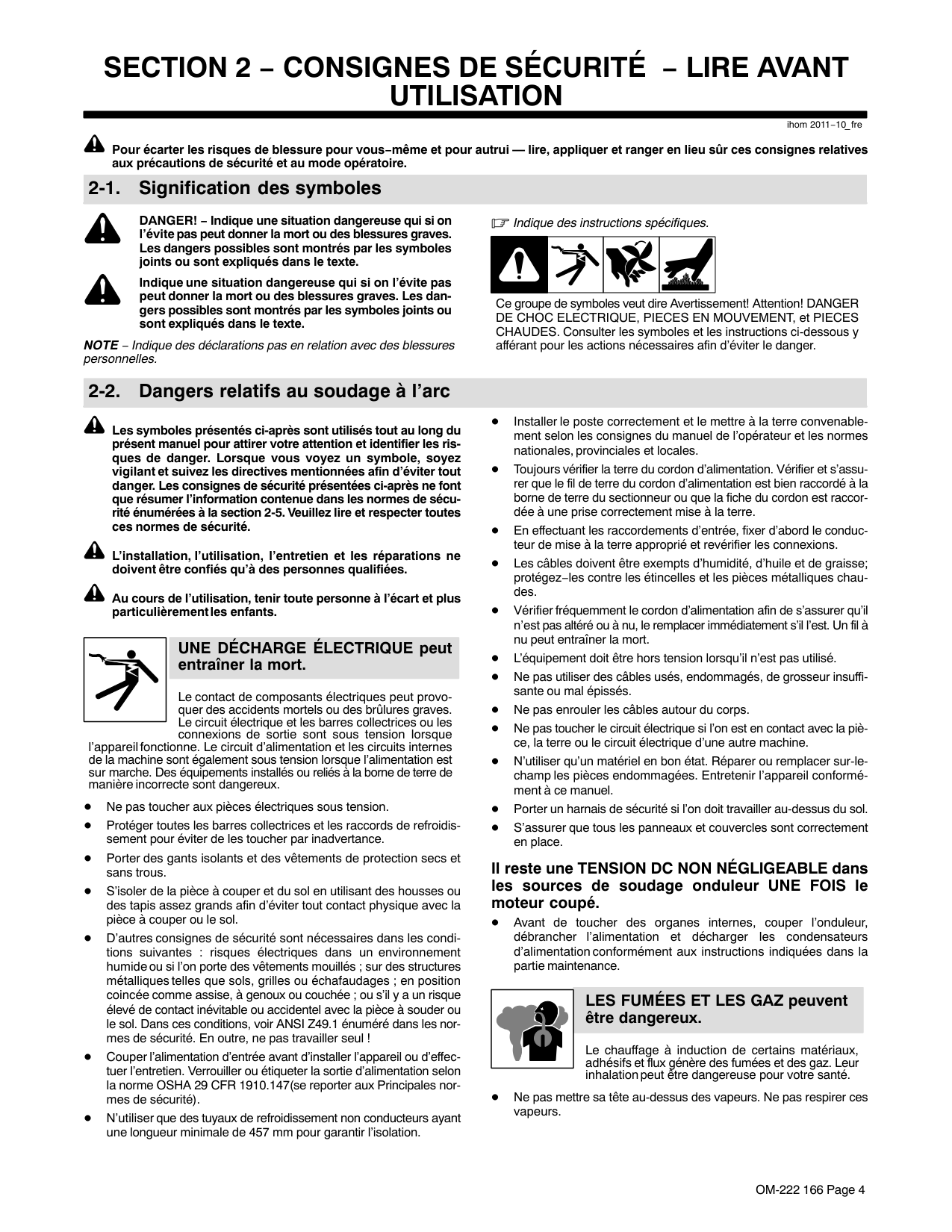 ihom 2011−10_fre Pour écarter les risques de blessure pour vous−même et pour autrui — lire, appliquer et ranger en lieu sûr ces consignes relatives aux précautions de sécurité et au mode opératoire. 2-1. Signification des symboles DANGER! − Indique une situation dangereuse qui si on l’évite pas peut donner la mort ou des blessures graves. Les dangers possibles sont montrés par les symboles joints ou sont expliqués dans le texte. Indique une situation dangereuse qui si on l’évite pas peut donner la mort ou des blessures graves. Les dan- gers possibles sont montrés par les symboles joints ou sont expliqués dans le texte. NOTE − Indique des déclarations pas en relation avec des blessures personnelles. Indique des instructions spécifiques. Ce groupe de symboles veut dire Avertissement! Attention! DANGER DE CHOC ELECTRIQUE, PIECES EN MOUVEMENT, et PIECES CHAUDES. Consulter les symboles et les instructions ci-dessous y afférant pour les actions nécessaires afin d’éviter le danger. 2-2. Dangers relatifs au soudage à l’arc Les symboles présentés ci-après sont utilisés tout au long du présent manuel pour attirer votre attention et identifier les ris- ques de danger. Lorsque vous voyez un symbole, soyez vigilant et suivez les directives mentionnées afin d’éviter tout danger. Les consignes de sécurité présentées ci-après ne font que résumer l’information contenue dans les normes de sécu- rité énumérées à la section 2-5. Veuillez lire et respecter toutes ces normes de sécurité. L’installation, l’utilisation, l’entretien et les réparations ne doivent être confiés qu’à des personnes qualifiées. Au cours de l’utilisation, tenir toute personne à l’écart et plus particulièrement les enfants. UNE DÉCHARGE ÉLECTRIQUE peut entraîner la mort. Le contact de composants électriques peut provo- quer des accidents mortels ou des brûlures graves. Le circuit électrique et les barres collectrices ou les connexions de sortie sont sous tension lorsque l’appareil fonctionne. Le circuit d’alimentation et les circuits internes de la machine sont également sous tension lorsque l’alimentation est sur marche. Des équipements installés ou reliés à la borne de terre de manière incorrecte sont dangereux. Ne pas toucher aux pièces électriques sous tension. Protéger toutes les barres collectrices et les raccords de refroidis- sement pour éviter de les toucher par inadvertance. Porter des gants isolants et des vêtements de protection secs et sans trous. S’isoler de la pièce à couper et du sol en utilisant des housses ou des tapis assez grands afin d’éviter tout contact physique avec la pièce à couper ou le sol. D’autres consignes de sécurité sont nécessaires dans les condi- tions suivantes : risques électriques dans un environnement humide ou si l’on porte des vêtements mouillés ; sur des structures métalliques telles que sols, grilles ou échafaudages ; en position coincée comme assise, à genoux ou couchée ; ou s’il y a un risque élevé de contact inévitable ou accidentel avec la pièce à souder ou le sol. Dans ces conditions, voir ANSI Z49.1 énuméré dans les nor- mes de sécurité. En outre, ne pas travailler seul ! Couper l’alimentation d’entrée avant d’installer l’appareil ou d’effec- tuer l’entretien. Verrouiller ou étiqueter la sortie d’alimentation selon la norme OSHA 29 CFR 1910.147(se reporter aux Principales nor- mes de sécurité). N’utiliser que des tuyaux de refroidissement non conducteurs ayant une longueur minimale de 457 mm pour garantir l’isolation. Installer le poste correctement et le mettre à la terre convenable- ment selon les consignes du manuel de l’opérateur et les normes nationales, provinciales et locales. Toujours vérifier la terre du cordon d’alimentation. Vérifier et s’assu- rer que le fil de terre du cordon d’alimentation est bien raccordé à la borne de terre du sectionneur ou que la fiche du cordon est raccor- dée à une prise correctement mise à la terre. En effectuant les raccordements d’entrée, fixer d’abord le conduc- teur de mise à la terre approprié et revérifier les connexions. Les câbles doivent être exempts d’humidité, d’huile et de graisse; protégez−les contre les étincelles et les pièces métalliques chau- des. Vérifier fréquemment le cordon d’alimentation afin de s’assurer qu’il n’est pas altéré ou à nu, le remplacer immédiatement s’il l’est. Un fil à nu peut entraîner la mort. L’équipement doit être hors tension lorsqu’il n’est pas utilisé. Ne pas utiliser des câbles usés, endommagés, de grosseur insuffi- sante ou mal épissés. Ne pas enrouler les câbles autour du corps. Ne pas toucher le circuit électrique si l’on est en contact avec la piè- ce, la terre ou le circuit électrique d’une autre machine. N’utiliser qu’un matériel en bon état. Réparer ou remplacer sur-le- champ les pièces endommagées. Entretenir l’appareil conformé- ment à ce manuel. Porter un harnais de sécurité si l’on doit travailler au-dessus du sol. S’assurer que tous les panneaux et couvercles sont correctement en place. Il reste une TENSION DC NON NÉGLIGEABLE dans les sources de soudage onduleur UNE FOIS le moteur coupé. Avant de toucher des organes internes, couper l’onduleur, débrancher l’alimentation et décharger les condensateurs d’alimentation conformément aux instructions indiquées dans la partie maintenance. LES FUMÉES ET LES GAZ peuvent être dangereux. Le chauffage à induction de certains matériaux, adhésifs et flux génère des fumées et des gaz. Leur inhalation peut être dangereuse pour votre santé. Ne pas mettre sa tête au-dessus des vapeurs. Ne pas respirer ces vapeurs.OM-222 166 Page 5 À l’intérieur, ventiler la zone et/ou utiliser une ventilation forcée au niveau de l’arc pour l’évacuation des fumées et des gaz. Si la ventila
