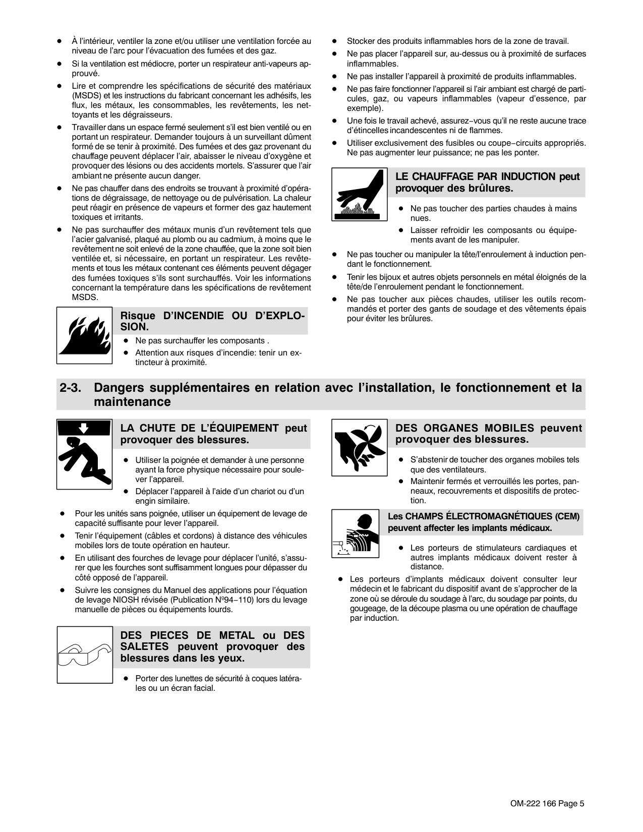 Ne pas surchauffer les composants . Attention aux risques d’incendie: tenir un ex- tincteur à proximité. Stocker des produits inflammables hors de la zone de travail. Ne pas placer l’appareil sur, au-dessus ou à proximité de surfaces inflammables. Ne pas installer l’appareil à proximité de produits inflammables. Ne pas faire fonctionner l’appareil si l’air ambiant est chargé de parti- cules, gaz, ou vapeurs inflammables (vapeur d’essence, par exemple). Une fois le travail achevé, assurez−vous qu’il ne reste aucune trace d’étincelles incandescentes ni de flammes. Utiliser exclusivement des fusibles ou coupe−circuits appropriés. Ne pas augmenter leur puissance; ne pas les ponter. LE CHAUFFAGE PAR INDUCTION peut provoquer des brûlures. Ne pas toucher des parties chaudes à mains nues. Laisser refroidir les composants ou équipe- ments avant de les manipuler. Ne pas toucher ou manipuler la tête/l’enroulement à induction pen- dant le fonctionnement. Tenir les bijoux et autres objets personnels en métal éloignés de la tête/de l’enroulement pendant le fonctionnement. Ne pas toucher aux pièces chaudes, utiliser les outils recom- mandés et porter des gants de soudage et des vêtements épais pour éviter les brûlures. 2-3. Dangers supplémentaires en relation avec l’installation, le fonctionnement et la maintenance LA CHUTE DE L’ÉQUIPEMENT peut provoquer des blessures. Utiliser la poignée et demander à une personne ayant la force physique nécessaire pour soule- ver l’appareil. Déplacer l’appareil à l’aide d’un chariot ou d’un engin similaire. Pour les unités sans poignée, utiliser un équipement de levage de capacité suffisante pour lever l’appareil. Tenir l’équipement (câbles et cordons) à distance des véhicules mobiles lors de toute opération en hauteur. En utilisant des fourches de levage pour déplacer l’unité, s’assu- rer que les fourches sont suffisamment longues pour dépasser du côté opposé de l’appareil. Suivre les consignes du Manuel des applications pour l’équation de levage NIOSH révisée (Publication Nº94−110) lors du levage manuelle de pièces ou équipements lourds. DES PIECES DE METAL ou DES SALETES peuvent provoquer des blessures dans les yeux. Porter des lunettes de sécurité à coques latéra- les ou un écran facial. DES ORGANES MOBILES peuvent provoquer des blessures. S’abstenir de toucher des organes mobiles tels que des ventilateurs. Maintenir fermés et verrouillés les portes, pan- neaux, recouvrements et dispositifs de protec- tion. Les CHAMPS ÉLECTROMAGNÉTIQUES (CEM) peuvent affecter les implants médicaux. Les porteurs de stimulateurs cardiaques et autres implants médicaux doivent rester à distance. Les porteurs d’implants médicaux doivent consulter leur médecin et le fabricant du dispositif avant de s’approcher de la zone où se déroule du soudage à l’arc, du soudage par points, du gougeage, de la découpe plasma ou une opération de chauffage par induction.OM-222 166 Page 6