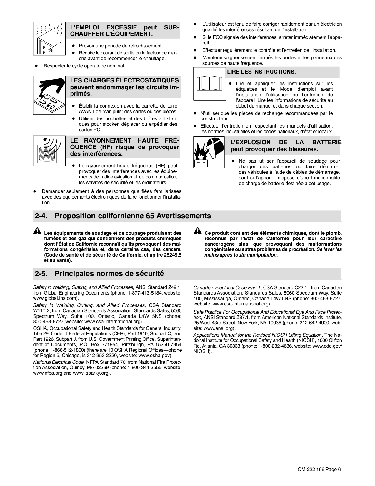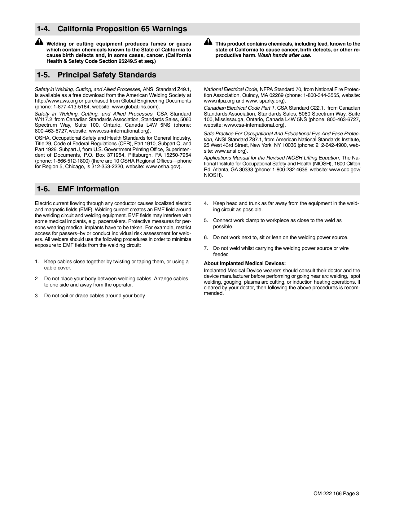 Read and follow all labels and the Owner’s Manual carefully before installing, operating, or servicing unit. Read the safety information at the beginning of the manual and in each section. Use only genuine replacement parts from the manufacturer. Perform maintenance and service according to the Owner’s Manuals, industry standards, and national, state, and local codes. BATTERY EXPLOSION can injure. Do not use induction equipment to charge bat- teries or jump start vehicles unless it has a bat- tery charging feature designed for this purpose.OM-222 166 Page 3 1-4. California Proposition 65 Warnings Welding or cutting equipment produces fumes or gases which contain chemicals known to the State of California to cause birth defects and, in some cases, cancer. (California Health & Safety Code Section 25249.5 et seq.) This product contains chemicals, including lead, known to the state of California to cause cancer, birth defects, or other re- productive harm. Wash hands after use. 1-5. Principal Safety Standards Safety in Welding, Cutting, and Allied Processes, ANSI Standard Z49.1, is available as a free download from the American Welding Society at http://www.aws.org or purchased from Global Engineering Documents (phone: 1-877-413-5184, website: www.global.ihs.com). Safety in Welding, Cutting, and Allied Processes, CSA Standard W117.2, from Canadian Standards Association, Standards Sales, 5060 Spectrum Way, Suite 100, Ontario, Canada L4W 5NS (phone: 800-463-6727, website: www.csa-international.org). OSHA, Occupational Safety and Health Standards for General Industry, Title 29, Code of Federal Regulations (CFR), Part 1910, Subpart Q, and Part 1926, Subpart J, from U.S. Government Printing Office, Superinten- dent of Documents, P.O. Box 371954, Pittsburgh, PA 15250-7954 (phone: 1-866-512-1800) (there are 10 OSHA Regional Offices—phone for Region 5, Chicago, is 312-353-2220, website: www.osha.gov). National Electrical Code, NFPA Standard 70, from National Fire Protec- tion Association, Quincy, MA 02269 (phone: 1-800-344-3555, website: www.nfpa.org and www. sparky.org). Canadian Electrical Code Part 1, CSA Standard C22.1, from Canadian Standards Association, Standards Sales, 5060 Spectrum Way, Suite 100, Mississauga, Ontario, Canada L4W 5NS (phone: 800-463-6727, website: www.csa-international.org). Safe Practice For Occupational And Educational Eye And Face Protec- tion, ANSI Standard Z87.1, from American National Standards Institute, 25 West 43rd Street, New York, NY 10036 (phone: 212-642-4900, web- site: www.ansi.org). Applications Manual for the Revised NIOSH Lifting Equation, The Na- tional Institute for Occupational Safety and Health (NIOSH), 1600 Clifton Rd, Atlanta, GA 30333 (phone: 1-800-232-4636, website: www.cdc.gov/