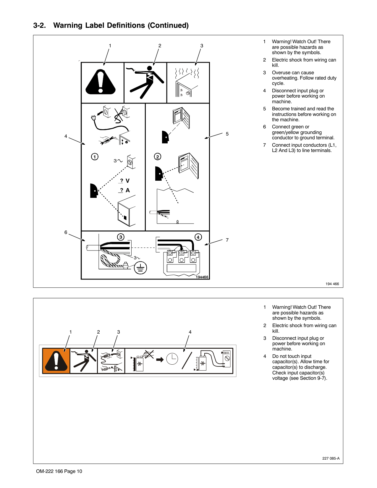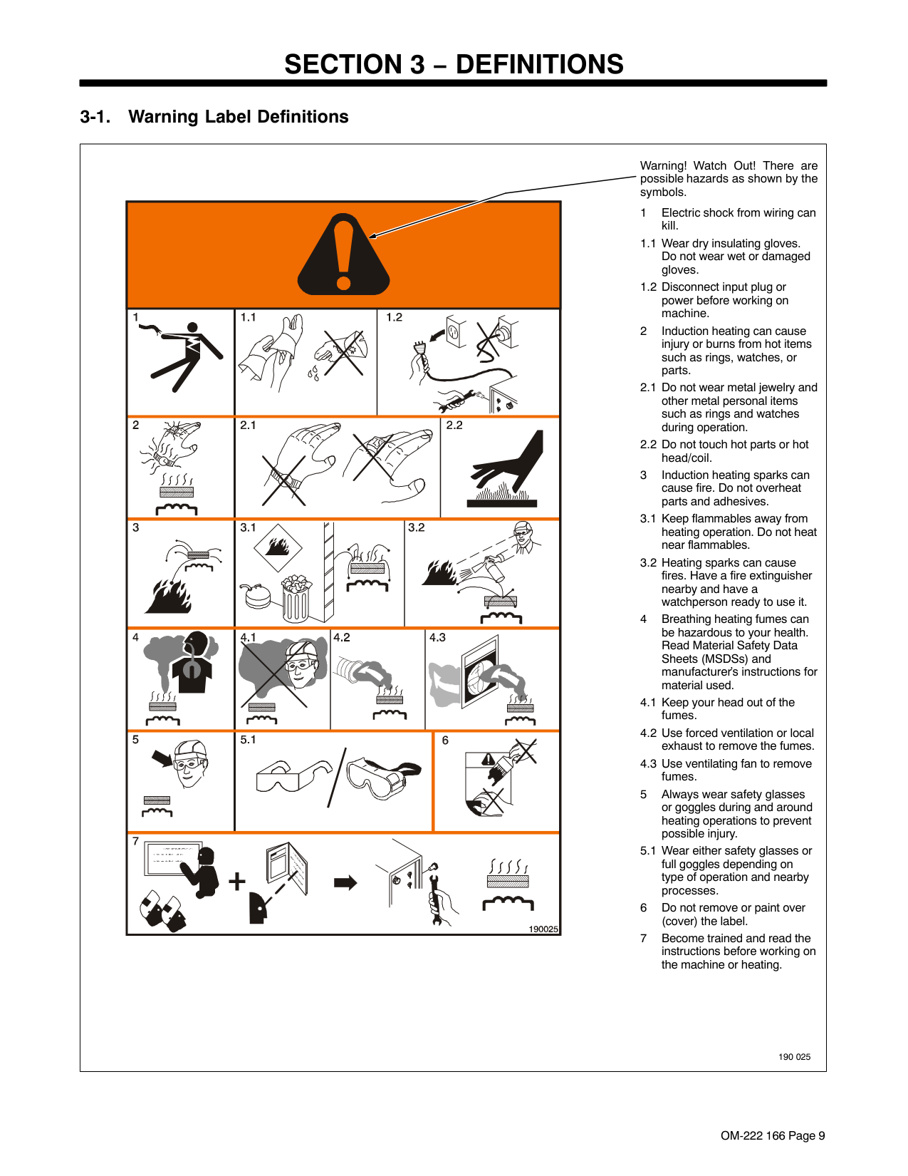 3-1. Warning Label Definitions Warning! Watch Out! There are possible hazards as shown by the symbols. 1 Electric shock from wiring can kill. 1.1 Wear dry insulating gloves. Do not wear wet or damaged gloves. 1.2 Disconnect input plug or power before working on machine. 2 Induction heating can cause injury or burns from hot items such as rings, watches, or parts. 2.1 Do not wear metal jewelry and other metal personal items such as rings and watches during operation. 2.2 Do not touch hot parts or hot head/coil. 3 Induction heating sparks can cause fire. Do not overheat parts and adhesives. 3.1 Keep flammables away from heating operation. Do not heat near flammables. 3.2 Heating sparks can cause fires. Have a fire extinguisher nearby and have a watchperson ready to use it. 4 Breathing heating fumes can be hazardous to your health. Read Material Safety Data Sheets (MSDSs) and manufacturer’s instructions for material used. 4.1 Keep your head out of the fumes. 4.2 Use forced ventilation or local exhaust to remove the fumes. 4.3 Use ventilating fan to remove fumes. 5 Always wear safety glasses or goggles during and around heating operations to prevent possible injury. 5.1 Wear either safety glasses or full goggles depending on type of operation and nearby processes. 6 Do not remove or paint over (cover) the label. 7 Become trained and read the instructions before working on the machine or heating. 190 025OM-222 166 Page 10 3-2. Warning Label Definitions (Continued) 1 Warning! Watch Out! There are possible hazards as shown by the symbols. 2 Electric shock from wiring can kill. 3 Overuse can cause overheating. Follow rated duty cycle. 4 Disconnect input plug or power before working on machine. 5 Become trained and read the instructions before working on the machine. 6 Connect green or green/yellow grounding conductor to ground terminal. 7 Connect input conductors (L1, L2 And L3) to line terminals. 194 466 1 2 4 5 3 6 7