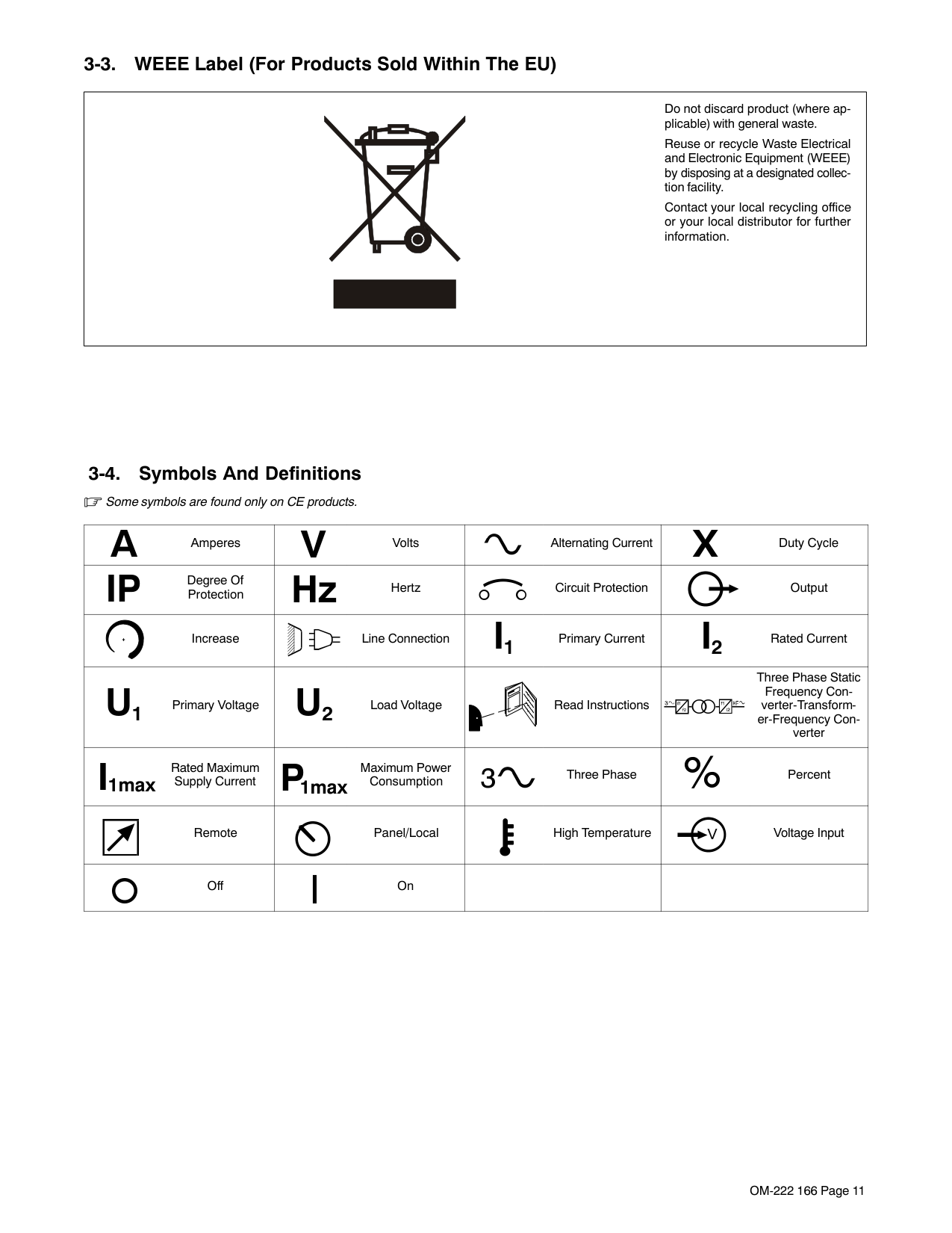 1 2 3 4 1 Warning! Watch Out! There are possible hazards as shown by the symbols. 2 Electric shock from wiring can kill. 3 Disconnect input plug or power before working on machine. 4 Do not touch input capacitor(s). Allow time for capacitor(s) to discharge. Check input capacitor(s) voltage (see Section 9-7).OM-222 166 Page 11 3-3. WEEE Label (For Products Sold Within The EU) Do not discard product (where ap- plicable) with general waste. Reuse or recycle Waste Electrical and Electronic Equipment (WEEE) by disposing at a designated collec- tion facility. Contact your local recycling office or your local distributor for further information. 3-4. Symbols And Definitions Some symbols are found only on CE products.