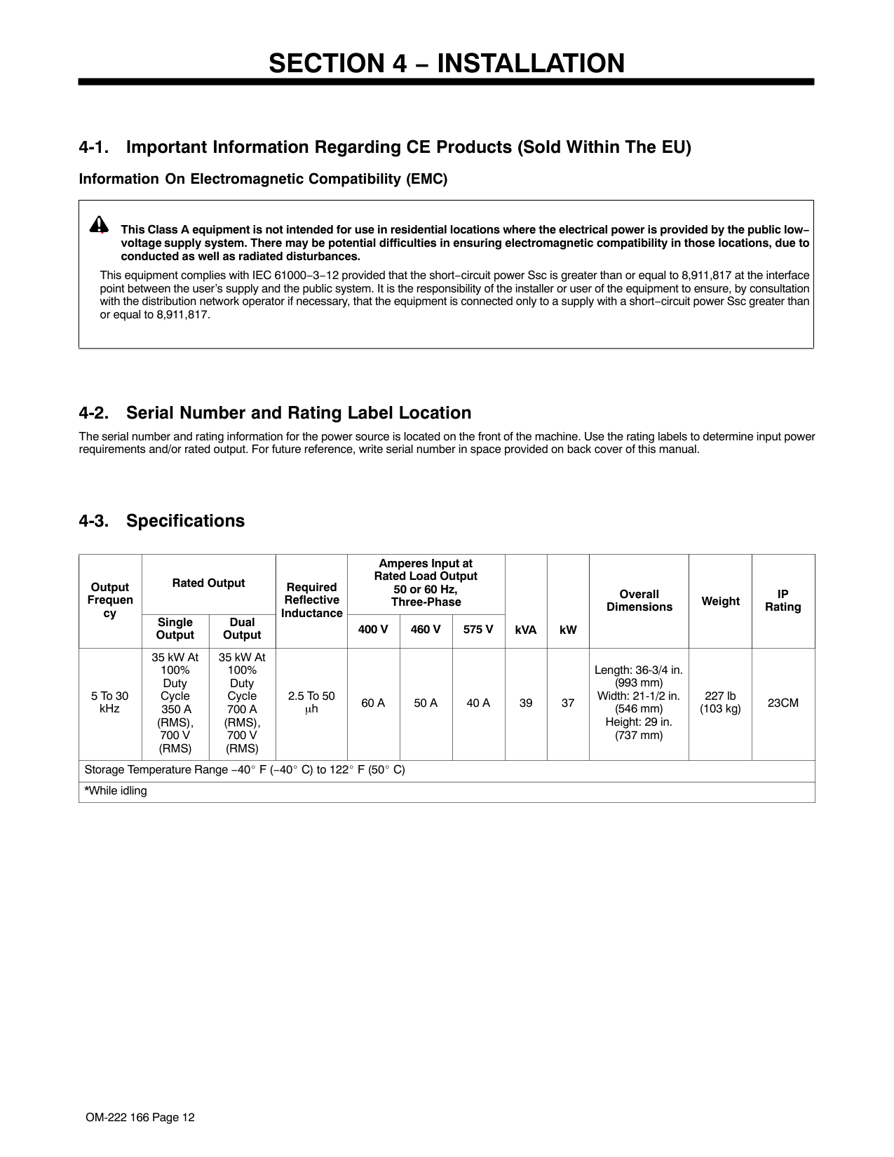 4-1. Important Information Regarding CE Products (Sold Within The EU) Information On Electromagnetic Compatibility (EMC) ! This Class A equipment is not intended for use in residential locations where the electrical power is provided by the public low− voltage supply system. There may be potential difficulties in ensuring electromagnetic compatibility in those locations, due to conducted as well as radiated disturbances. This equipment complies with IEC 61000−3−12 provided that the short−circuit power Ssc is greater than or equal to 8,911,817 at the interface point between the user’s supply and the public system. It is the responsibility of the installer or user of the equipment to ensure, by consultation with the distribution network operator if necessary, that the equipment is connected only to a supply with a short−circuit power Ssc greater than or equal to 8,911,817. 4-2. Serial Number and Rating Label Location The serial number and rating information for the power source is located on the front of the machine. Use the rating labels to determine input power requirements and/or rated output. For future reference, write serial number in space provided on back cover of this manual. 4-3. Specifications Output Frequen cy Rated Output Required Reflective Inductance Amperes Input at Rated Load Output 50 or 60 Hz, Three-Phase Overall Dimensions WeightIp
