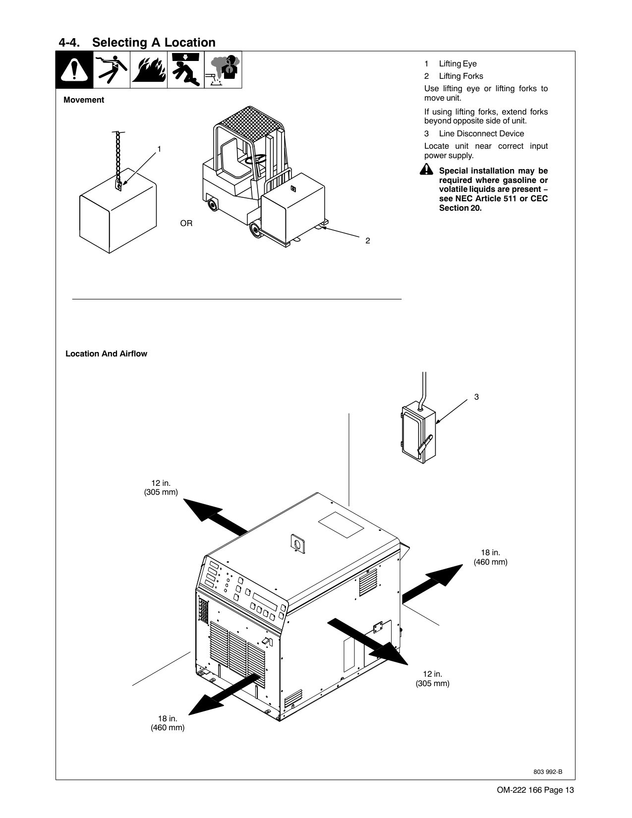 Storage Temperature Range −40 F (−40 C) to 122 F (50 C) *While idlingOM-222 166 Page 13 4-4. Selecting A Location 1 Lifting Eye 2 Lifting Forks Use lifting eye or lifting forks to move unit. If using lifting forks, extend forks beyond opposite side of unit. 3 Line Disconnect Device Locate unit near correct input power supply. ! Special installation may be required where gasoline or volatile liquids are present − see NEC Article 511 or CEC Section 20. 3 18 in. (460 mm) 18 in. (460 mm)