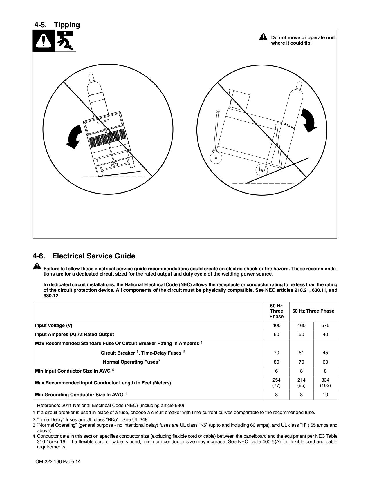 12 in. (305 mm) 12 in. (305 mm)OM-222 166 Page 14 4-5. Tipping ! Do not move or operate unit where it could tip. 4-6. Electrical Service Guide Failure to follow these electrical service guide recommendations could create an electric shock or fire hazard. These recommenda- tions are for a dedicated circuit sized for the rated output and duty cycle of the welding power source. In dedicated circuit installations, the National Electrical Code (NEC) allows the receptacle or conductor rating to be less than the rating of the circuit protection device. All components of the circuit must be physically compatible. See NEC articles 210.21, 630.11, and 630.12. 50 Hz Three Phase 60 Hz Three Phase Input Voltage (V) 400 460 575 Input Amperes (A) At Rated Output 60 50 40 Max Recommended Standard Fuse Or Circuit Breaker Rating In Amperes 1 Circuit Breaker 1, Time-Delay Fuses 2 70 61 45 Normal Operating Fuses3 80 70 60 Min Input Conductor Size In AWG 4 6 8 8 Max Recommended Input Conductor Length In Feet (Meters) 254 (77) 214 (65) 334 (102) Min Grounding Conductor Size In AWG 4 8 8 10 Reference: 2011 National Electrical Code (NEC) (including article 630) 1 If a circuit breaker is used in place of a fuse, choose a circuit breaker with time-current curves comparable to the recommended fuse. 2 “Time-Delay” fuses are UL class “RK5” . See UL 248. 3 “Normal Operating” (general purpose - no intentional delay) fuses are UL class “K5” (up to and including 60 amps), and UL class “H” ( 65 amps and above). 4 Conductor data in this section specifies conductor size (excluding flexible cord or cable) between the panelboard and the equipment per NEC Table 310.15(B)(16). If a flexible cord or cable is used, minimum conductor size may increase. See NEC Table 400.5(A) for flexible cord and cable requirements.