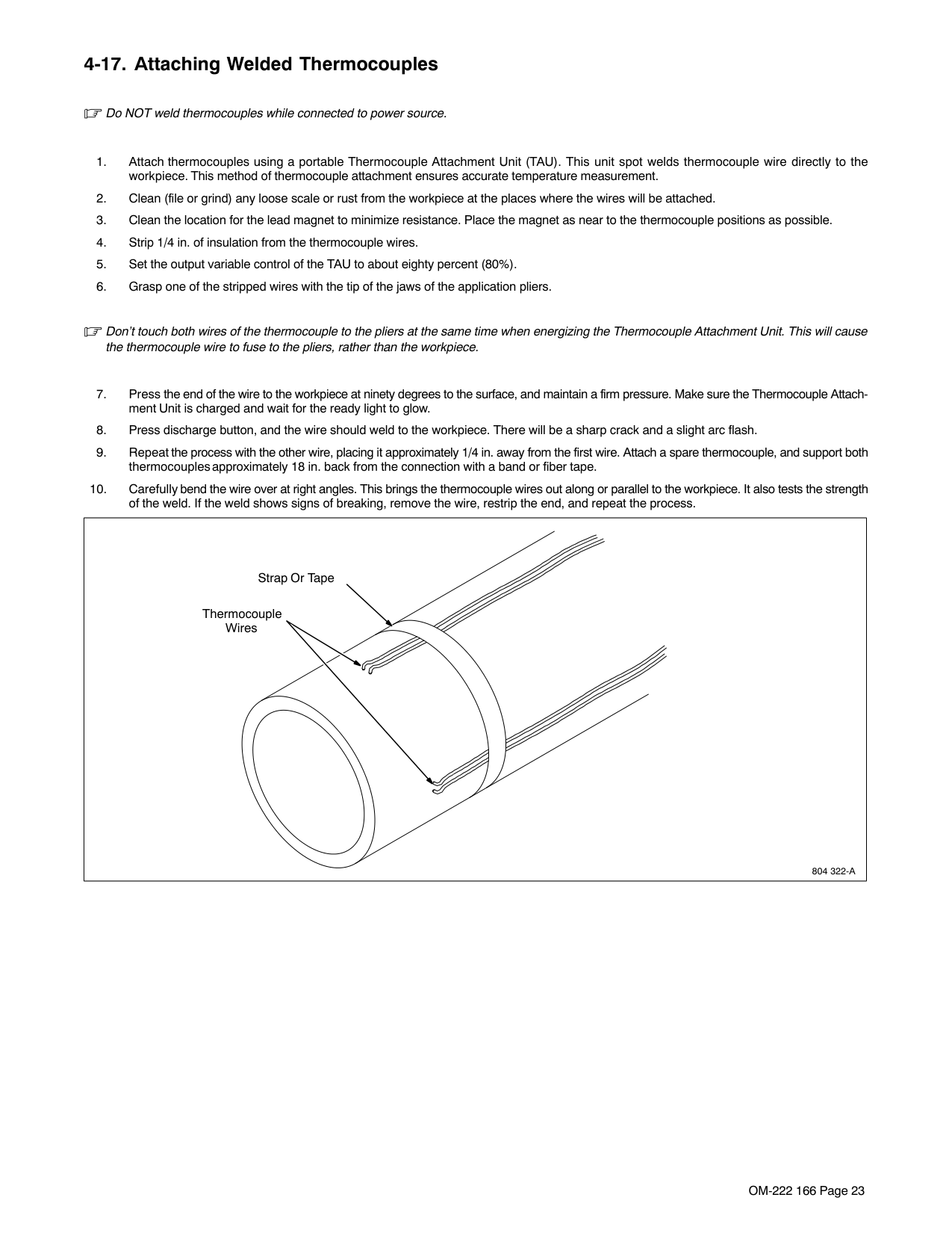 Thermocouples must be attached using a portable Thermocouple Attachment Unit (TAU) that spot welds the thermocouple wire directly to the workpiece. Clean the attachment locations to remove scale and rust, strip 1/4 inch of insulation from the wires, set the TAU to 80% output, and press the wires to the workpiece at 90 degrees while maintaining firm pressure. The control thermocouple should be placed in the plane of the weld at the center of the heat zone. (Pages 23-24)