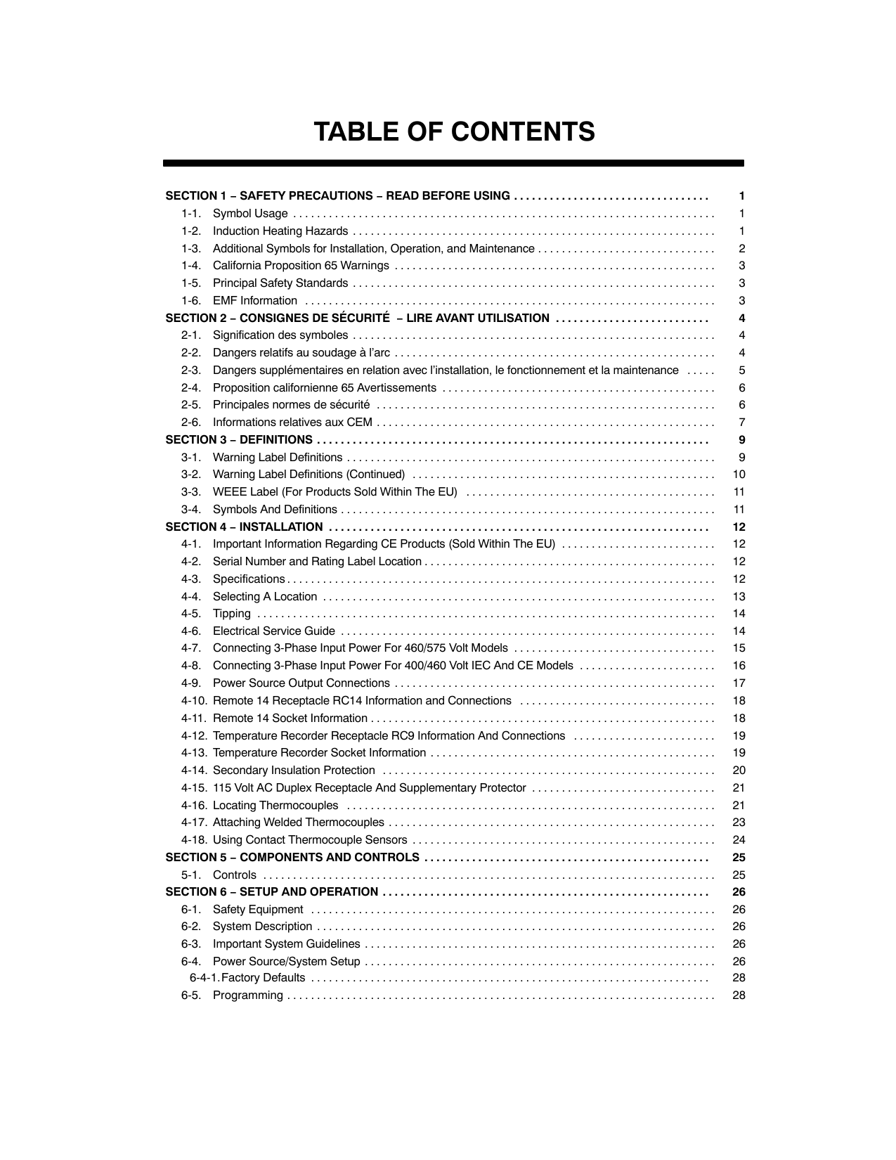 1 . . . . . . . . . . . . . . . . . . . . . . . . . . . . . . . . . 1-1. Symbol Usage 1 . . . . . . . . . . . . . . . . . . . . . . . . . . . . . . . . . . . . . . . . . . . . . . . . . . . . . . . . . . . . . . . . . . . . . . . 1-2. Induction Heating Hazards 1 . . . . . . . . . . . . . . . . . . . . . . . . . . . . . . . . . . . . . . . . . . . . . . . . . . . . . . . . . . . . . 1-3. Additional Symbols for Installation, Operation, and Maintenance 2 . . . . . . . . . . . . . . . . . . . . . . . . . . . . . . 1-4. California Proposition 65 Warnings 3 . . . . . . . . . . . . . . . . . . . . . . . . . . . . . . . . . . . . . . . . . . . . . . . . . . . . . . 1-5. Principal Safety Standards 3 . . . . . . . . . . . . . . . . . . . . . . . . . . . . . . . . . . . . . . . . . . . . . . . . . . . . . . . . . . . . . 1-6. EMF Information 3 . . . . . . . . . . . . . . . . . . . . . . . . . . . . . . . . . . . . . . . . . . . . . . . . . . . . . . . . . . . . . . . . . . . . .Section 2 − Consignes De Sécurité − Lire Avant Utilisation