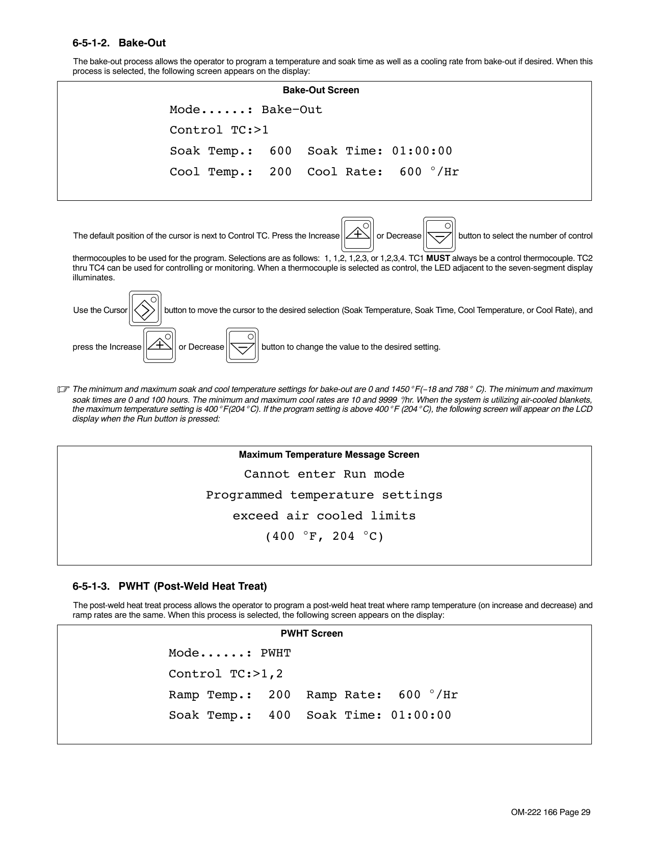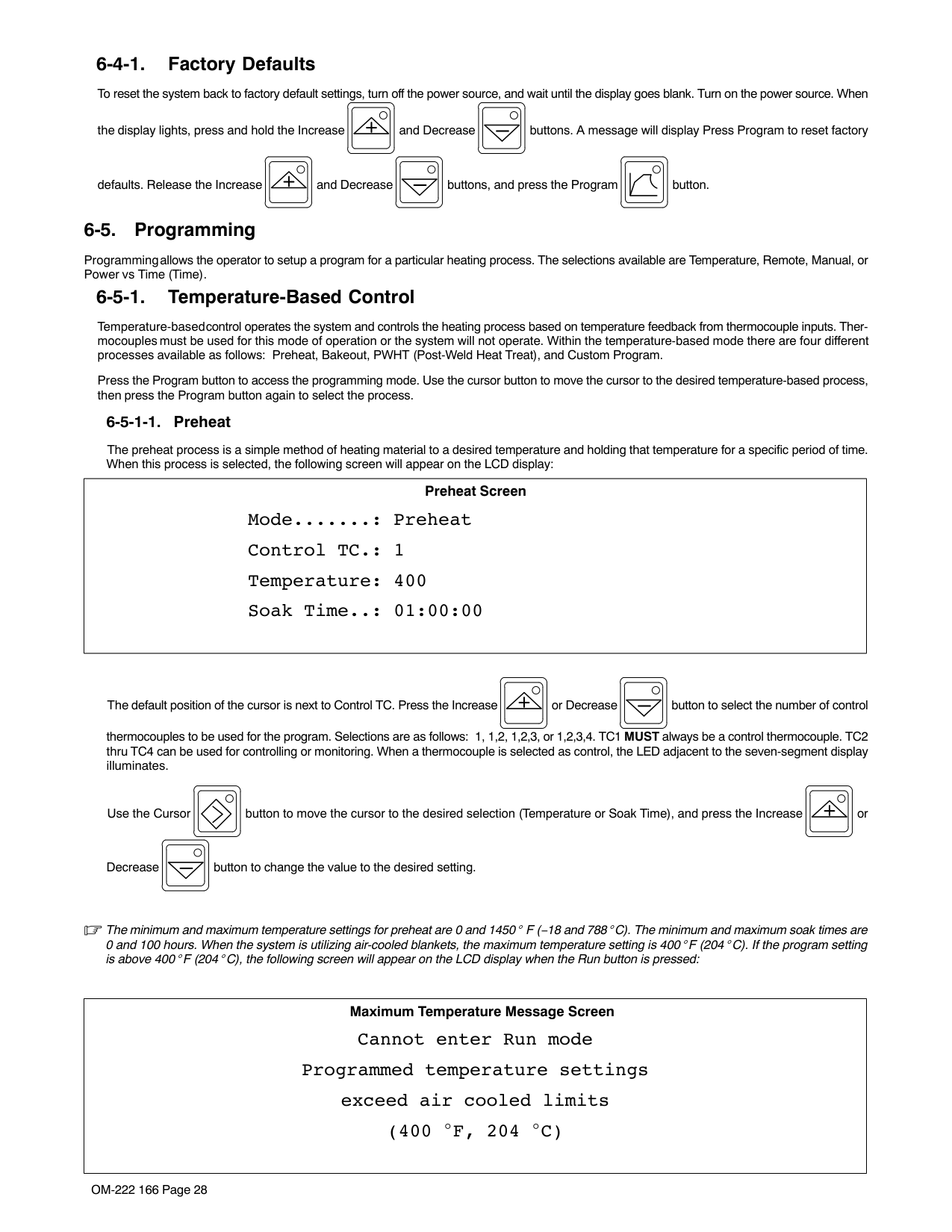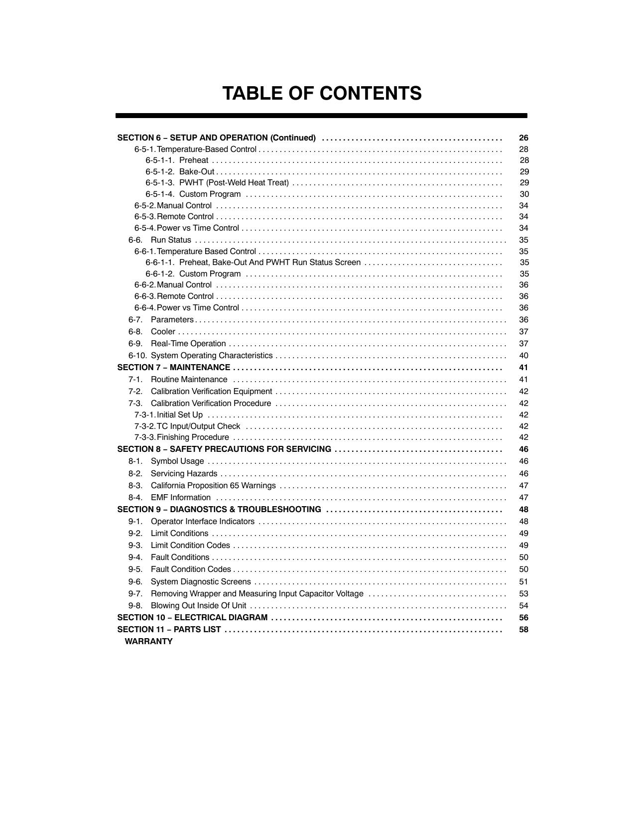 SECTION 6 − SETUP AND OPERATION (Continued) 26 . . . . . . . . . . . . . . . . . . . . . . . . . . . . . . . . . . . . . . . . . . . 6-5-1.Temperature-Based Control 28 . . . . . . . . . . . . . . . . . . . . . . . . . . . . . . . . . . . . . . . . . . . . . . . . . . . . . . . . . . 6-5-1-1. Preheat 28 . . . . . . . . . . . . . . . . . . . . . . . . . . . . . . . . . . . . . . . . . . . . . . . . . . . . . . . . . . . . . . . . . . . . . 6-5-1-2. Bake-Out 29 . . . . . . . . . . . . . . . . . . . . . . . . . . . . . . . . . . . . . . . . . . . . . . . . . . . . . . . . . . . . . . . . . . . . 6-5-1-3. PWHT (Post-Weld Heat Treat) 29 . . . . . . . . . . . . . . . . . . . . . . . . . . . . . . . . . . . . . . . . . . . . . . . . . . 6-5-1-4. Custom Program 30 . . . . . . . . . . . . . . . . . . . . . . . . . . . . . . . . . . . . . . . . . . . . . . . . . . . . . . . . . . . . . 6-5-2.Manual Control 34 . . . . . . . . . . . . . . . . . . . . . . . . . . . . . . . . . . . . . . . . . . . . . . . . . . . . . . . . . . . . . . . . . . . . 6-5-3.Remote Control 34 . . . . . . . . . . . . . . . . . . . . . . . . . . . . . . . . . . . . . . . . . . . . . . . . . . . . . . . . . . . . . . . . . . . . 6-5-4.Power vs Time Control 34 . . . . . . . . . . . . . . . . . . . . . . . . . . . . . . . . . . . . . . . . . . . . . . . . . . . . . . . . . . . . . . 6-6. Run Status 35 . . . . . . . . . . . . . . . . . . . . . . . . . . . . . . . . . . . . . . . . . . . . . . . . . . . . . . . . . . . . . . . . . . . . . . . . . . 6-6-1.Temperature Based Control 35 . . . . . . . . . . . . . . . . . . . . . . . . . . . . . . . . . . . . . . . . . . . . . . . . . . . . . . . . . . 6-6-1-1. Preheat, Bake-Out And PWHT Run Status Screen 35 . . . . . . . . . . . . . . . . . . . . . . . . . . . . . . . . . 6-6-1-2. Custom Program 35 . . . . . . . . . . . . . . . . . . . . . . . . . . . . . . . . . . . . . . . . . . . . . . . . . . . . . . . . . . . . . 6-6-2.Manual Control 36 . . . . . . . . . . . . . . . . . . . . . . . . . . . . . . . . . . . . . . . . . . . . . . . . . . . . . . . . . . . . . . . . . . . . 6-6-3.Remote Control 36 . . . . . . . . . . . . . . . . . . . . . . . . . . . . . . . . . . . . . . . . . . . . . . . . . . . . . . . . . . . . . . . . . . . . 6-6-4.Power vs Time Control 36 . . . . . . . . . . . . . . . . . . . . . . . . . . . . . . . . . . . . . . . . . . . . . . . . . . . . . . . . . . . . . . 6-7. Parameters 36 . . . . . . . . . . . . . . . . . . . . . . . . . . . . . . . . . . . . . . . . . . . . . . . . . . . . . . . . . . . . . . . . . . . . . . . . . . 6-8. Cooler 37 . . . . . . . . . . . . . . . . . . . . . . . . . . . . . . . . . . . . . . . . . . . . . . . . . . . . . . . . . . . . . . . . . . . . . . . . . . . . . . 6-9. Real-Time Operation 37 . . . . . . . . . . . . . . . . . . . . . . . . . . . . . . . . . . . . . . . . . . . . . . . . . . . . . . . . . . . . . . . . . . 6-10. System Operating Characteristics 40 . . . . . . . . . . . . . . . . . . . . . . . . . . . . . . . . . . . . . . . . . . . . . . . . . . . . . . .Section 7 − Maintenance