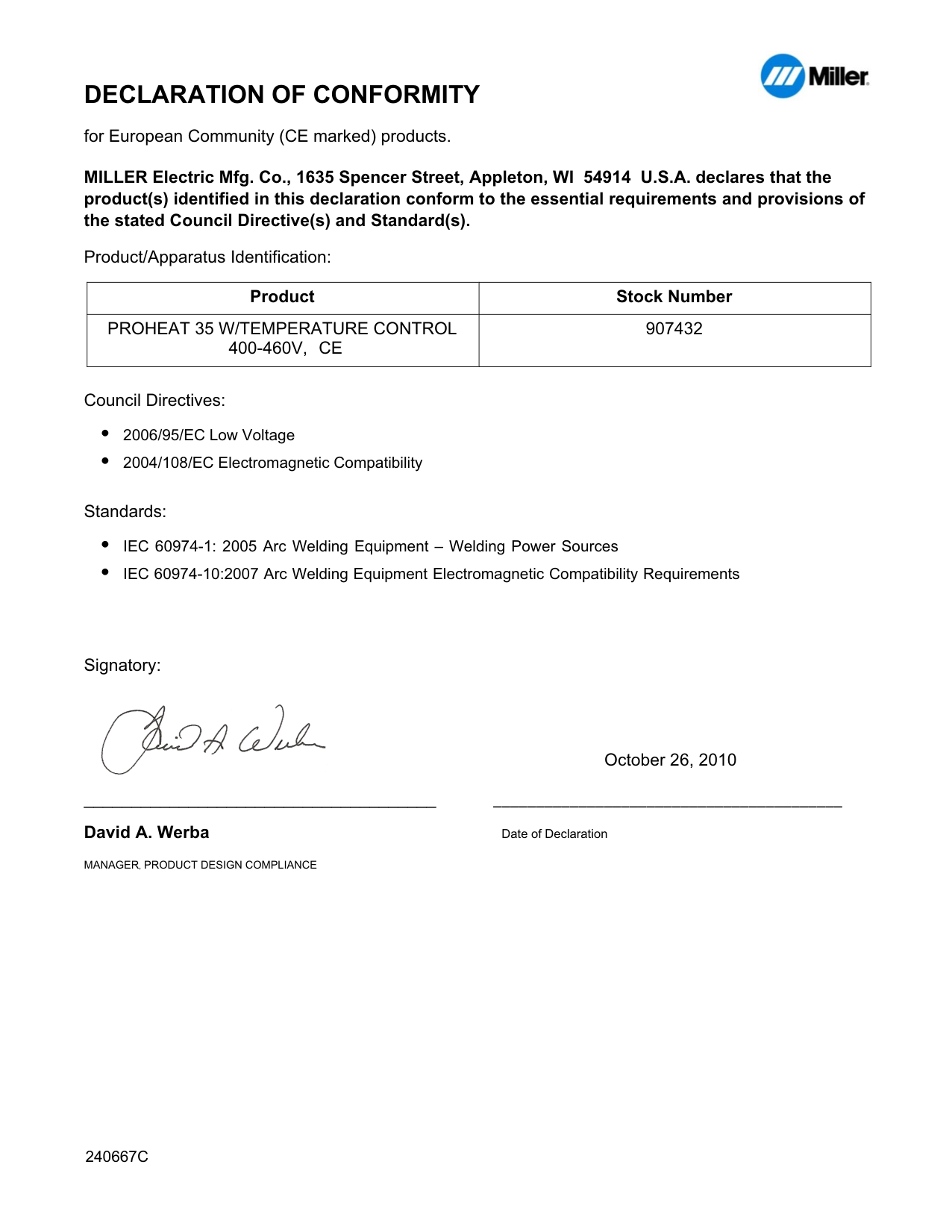 for European Community (CE marked) products. MILLER Electric Mfg. Co., 1635 Spencer Street, Appleton, WI 54914 U.S.A. declares that the product(s) identified in this declaration conform to the essential requirements and provisions of the stated Council Directive(s) and Standard(s). Product/Apparatus Identification: Product Stock NumberProheat 35 W/Temperature Control
