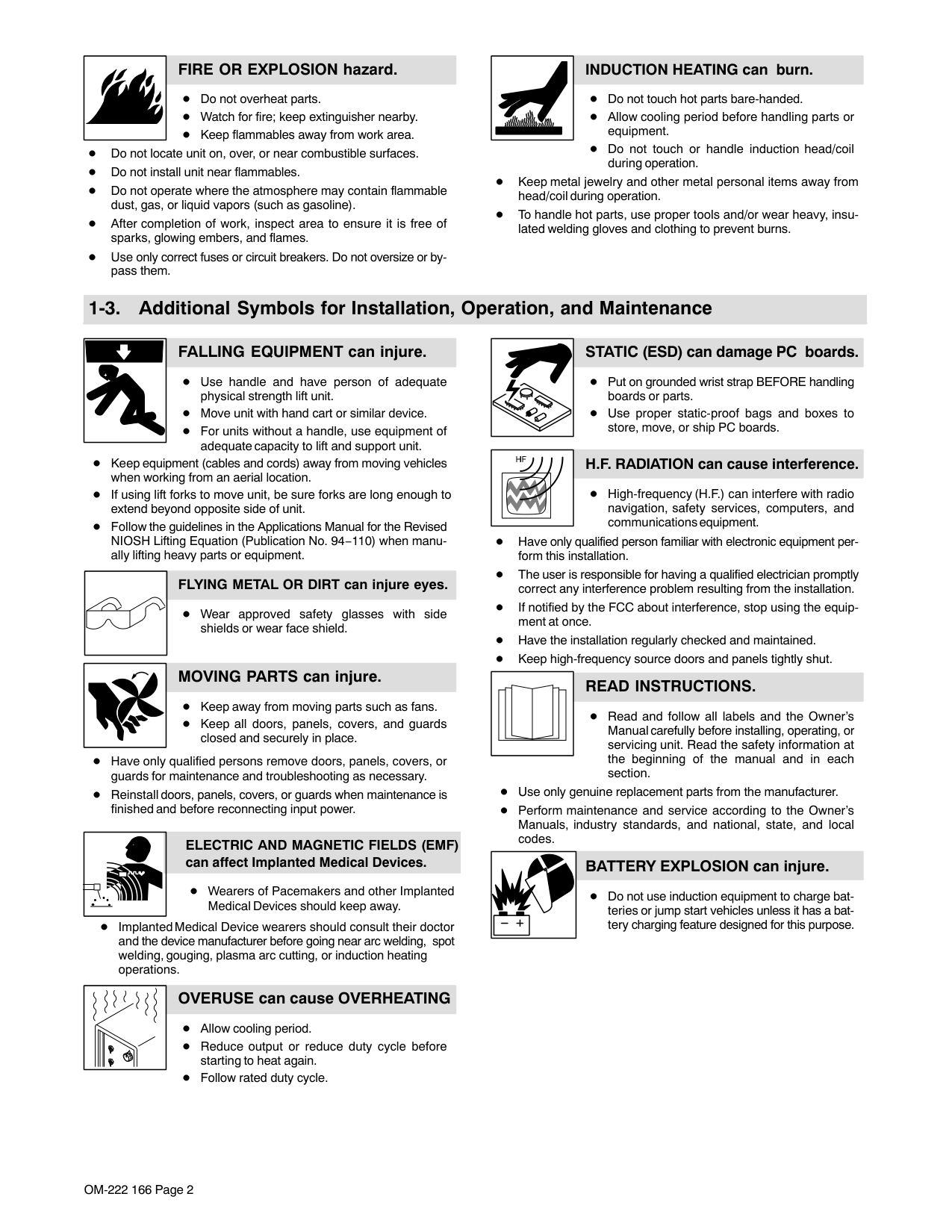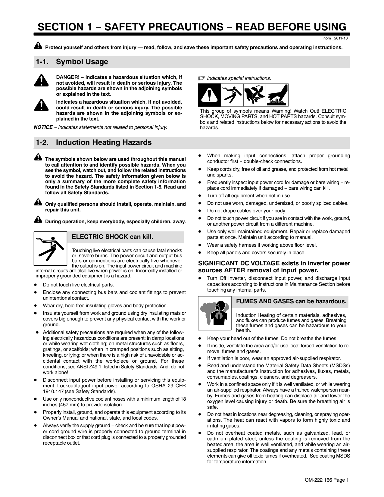 ihom _2011-10 Protect yourself and others from injury — read, follow, and save these important safety precautions and operating instructions. 1-1. Symbol Usage DANGER! − Indicates a hazardous situation which, if not avoided, will result in death or serious injury. The possible hazards are shown in the adjoining symbols or explained in the text. Indicates a hazardous situation which, if not avoided, could result in death or serious injury. The possible hazards are shown in the adjoining symbols or ex- plained in the text. NOTICE − Indicates statements not related to personal injury. Indicates special instructions. This group of symbols means Warning! Watch Out! ELECTRIC SHOCK, MOVING PARTS, and HOT PARTS hazards. Consult sym- bols and related instructions below for necessary actions to avoid the hazards. 1-2. Induction Heating Hazards The symbols shown below are used throughout this manual to call attention to and identify possible hazards. When you see the symbol, watch out, and follow the related instructions to avoid the hazard. The safety information given below is only a summary of the more complete safety information found in the Safety Standards listed in Section 1-5. Read and follow all Safety Standards. Only qualified persons should install, operate, maintain, and repair this unit. During operation, keep everybody, especially children, away. ELECTRIC SHOCK can kill. Touching live electrical parts can cause fatal shocks or severe burns. The power circuit and output bus bars or connections are electrically live whenever the output is on. The input power circuit and machine internal circuits are also live when power is on. Incorrectly installed or improperly grounded equipment is a hazard. Do not touch live electrical parts. Enclose any connecting bus bars and coolant fittings to prevent unintentional contact. Wear dry, hole-free insulating gloves and body protection. Insulate yourself from work and ground using dry insulating mats or covers big enough to prevent any physical contact with the work or ground. Additional safety precautions are required when any of the follow- ing electrically hazardous conditions are present: in damp locations or while wearing wet clothing; on metal structures such as floors, gratings, or scaffolds; when in cramped positions such as sitting, kneeling, or lying; or when there is a high risk of unavoidable or ac- cidental contact with the workpiece or ground. For these conditions, see ANSI Z49.1 listed in Safety Standards. And, do not work alone! Disconnect input power before installing or servicing this equip- ment. Lockout/tagout input power according to OSHA 29 CFR 1910.147 (see Safety Standards). Use only nonconductive coolant hoses with a minimum length of 18 inches (457 mm) to provide isolation. Properly install, ground, and operate this equipment according to its Owner’s Manual and national, state, and local codes. Always verify the supply ground − check and be sure that input pow- er cord ground wire is properly connected to ground terminal in disconnect box or that cord plug is connected to a properly grounded receptacle outlet. When making input connections, attach proper grounding conductor first − double-check connections. Keep cords dry, free of oil and grease, and protected from hot metal and sparks. Frequently inspect input power cord for damage or bare wiring − re- place cord immediately if damaged − bare wiring can kill. Turn off all equipment when not in use. Do not use worn, damaged, undersized, or poorly spliced cables. Do not drape cables over your body. Do not touch power circuit if you are in contact with the work, ground, or another power circuit from a different machine. Use only well-maintained equipment. Repair or replace damaged parts at once. Maintain unit according to manual. Wear a safety harness if working above floor level. Keep all panels and covers securely in place. SIGNIFICANT DC VOLTAGE exists in inverter power sources AFTER removal of input power. Turn Off inverter, disconnect input power, and discharge input capacitors according to instructions in Maintenance Section before touching any internal parts. Induction Heating of certain materials, adhesives, and fluxes can produce fumes and gases. Breathing these fumes and gases can be hazardous to your health. FUMES AND GASES can be hazardous. Keep your head out of the fumes. Do not breathe the fumes. If inside, ventilate the area and/or use local forced ventilation to re- move fumes and gases. If ventilation is poor, wear an approved air-supplied respirator. Read and understand the Material Safety Data Sheets (MSDSs) and the manufacturer’s instruction for adhesives, fluxes, metals, consumables, coatings, cleaners, and degreasers. Work in a confined space only if it is well ventilated, or while wearing an air-supplied respirator. Always have a trained watchperson near- by. Fumes and gases from heating can displace air and lower the oxygen level causing injury or death. Be sure the breathing air is safe. Do not heat in locations near degreasing, cleaning, or spraying oper- ations. The heat can react with vapors to form highly toxic and irritating gases. Do not overheat coated metals, such as galvanized, lead, or cadmium plated steel, unless the coating is removed from the heated area, the area is well ventilated, and while wearing an air- supplied respirator. The coatings and any metals containing these elements can give off toxic fumes if overheated. See coating MSDS for temperature information.OM-222 166 Page 2 FIRE OR EXPLOSION hazard. Do not overheat parts. Watch for fire; keep extinguisher nearby. Keep flammables away from work area. Do not locate unit on, over, or near combustible surfaces. Do not install unit near flammables. Do not operate where the atmosphere may contain flammable dust, gas, or liquid vapors (such as gasoline). After completion of work, inspect area to ensure it is free of sparks, glowing embers, and flames. Use only correct f