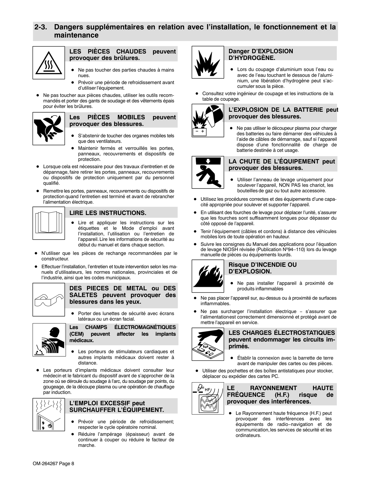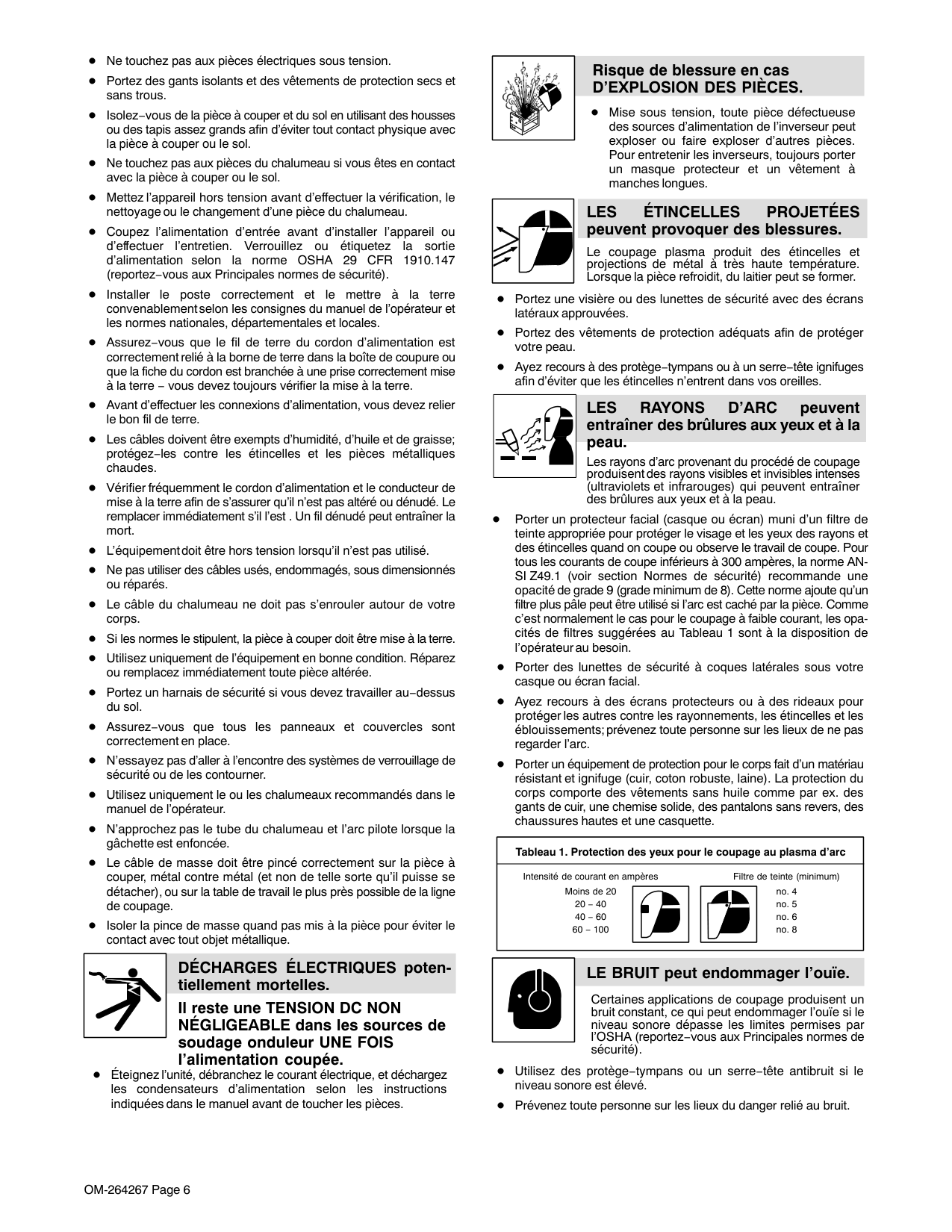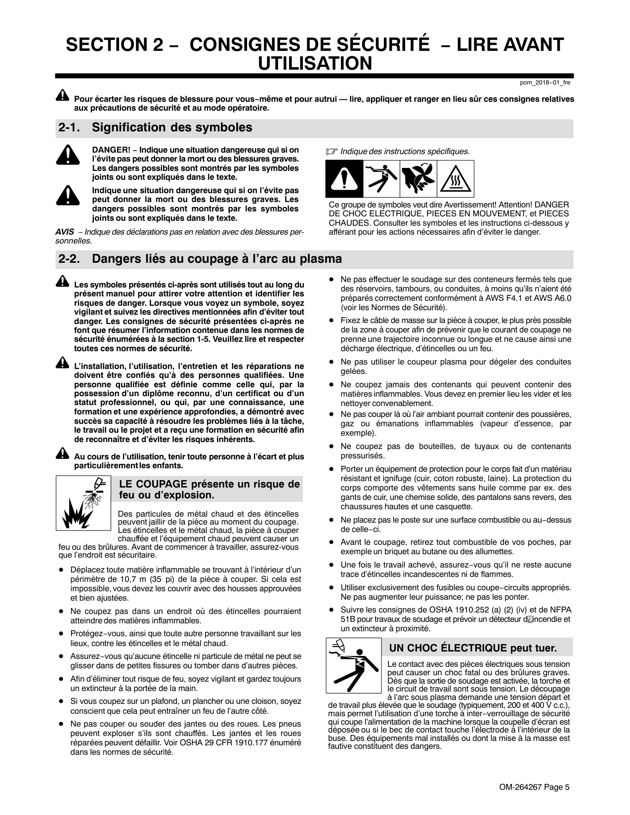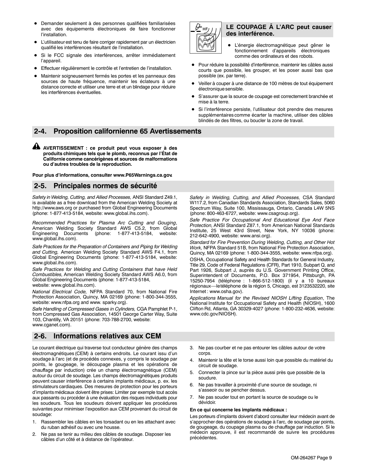 risque de provoquer des interférences. Le Rayonnement haute fréquence (H.F.) peut provoquer des interférences avec les équipements de radio−navigation et de communication, les services de sécurité et les ordinateurs.OM-264267 Page 9 Demander seulement à des personnes qualifiées familiarisées avec des équipements électroniques de faire fonctionner l’installation. L’utilisateur est tenu de faire corriger rapidement par un électricien qualifié les interférences résultant de l’installation. Si le FCC signale des interférences, arrêter immédiatement l’appareil. Effectuer régulièrement le contrôle et l’entretien de l’installation. Maintenir soigneusement fermés les portes et les panneaux des sources de haute fréquence, maintenir les éclateurs à une distance correcte et utiliser une terre et et un blindage pour réduire les interférences éventuelles. LE COUPAGE Ã L’ARC peut causer des interférence. L’énergie électromagnétique peut gêner le fonctionnement d’appareils électroniques comme des ordinateurs et des robots. Pour réduire la possibilité d’interférence, maintenir les câbles aussi courts que possible, les grouper, et les poser aussi bas que possible (ex. par terre). Veiller à couper à une distance de 100 mètres de tout équipement électronique sensible. S’assurer que la source de coupage est correctement branchée et mise à la terre. Si l’interférence persiste, l’utilisateur doit prendre des mesures supplémentaires comme écarter la machine, utiliser des câbles blindés de des filtres, ou boucler la zone de travail. 2-4. Proposition californienne 65 Avertissements AVERTISSEMENT : ce produit peut vous exposer à des produits chimiques tels que le plomb, reconnus par l’État de Californie comme cancérigènes et sources de malformations ou d’autres troubles de la reproduction. Pour plus d’informations, consulter www.P65Warnings.ca.gov. 2-5. Principales normes de sécurité Safety in Welding, Cutting, and Allied Processes, ANSI Standard Z49.1, is available as a free download from the American Welding Society at http://www.aws.org or purchased from Global Engineering Documents (phone: 1-877-413-5184, website: www.global.ihs.com). Recommended Practices for Plasma Arc Cutting and Gouging, American Welding Society Standard AWS C5.2, from Global Engineering Documents (phone: 1-877-413-5184, website: www.global.ihs.com). Safe Practices for the Preparation of Containers and Piping for Welding and Cutting, American Welding Society Standard AWS F4.1, from Global Engineering Documents (phone: 1-877-413-5184, website: www.global.ihs.com). Safe Practices for Welding and Cutting Containers that have Held Combustibles, American Welding Society Standard AWS A6.0, from Global Engineering Documents (phone: 1-877-413-5184, website: www.global.ihs.com). National Electrical Code, NFPA Standard 70, from National Fire Protection Association, Quincy, MA 02169 (phone: 1-800-344-3555, website: www.nfpa.org and www. sparky.org). Safe Handling of Compressed Gases in Cylinders, CGA Pamphlet P-1, from Compressed Gas Association, 14501 George Carter Way, Suite 103, Chantilly, VA 20151 (phone: 703-788-2700, website: www.cganet.com). Safety in Welding, Cutting, and Allied Processes, CSA Standard W117.2, from Canadian Standards Association, Standards Sales, 5060 Spectrum Way, Suite 100, Mississauga, Ontario, Canada L4W 5NS (phone: 800-463-6727, website: www.csagroup.org). Safe Practice For Occupational And Educational Eye And Face Protection, ANSI Standard Z87.1, from American National Standards Institute, 25 West 43rd Street, New York, NY 10036 (phone: 212-642-4900, website: www.ansi.org). Standard for Fire Prevention During Welding, Cutting, and Other Hot Work, NFPA Standard 51B, from National Fire Protection Association, Quincy, MA 02169 (phone: 1-800-344-3555, website: www.nfpa.org). OSHA, Occupational Safety and Health Standards for General Industry, Title 29, Code of Federal Regulations (CFR), Part 1910, Subpart Q, and Part 1926, Subpart J, auprès du U.S. Government Printing Office, Superintendent of Documents, P.O. Box 371954, Pittsburgh, PA 15250-7954 (téléphone : 1-866-512-1800) (il y a 10 bureaux régionaux––le téléphone de la région 5, Chicago, est 3123532220, site Internet : www.osha.gov). Applications Manual for the Revised NIOSH Lifting Equation, The National Institute for Occupational Safety and Health (NIOSH), 1600 Clifton Rd, Atlanta, GA 30329-4027 (phone: 1-800-232-4636, website: www.cdc.gov/NIOSH). 2-6. Informations relatives aux CEM Le courant électrique qui traverse tout conducteur génère des champs électromagnétiques (CEM) à certains endroits. Le courant issu d’un soudage à l’arc (et de procédés connexes, y compris le soudage par points, le gougeage, le découpage plasma et les opérations de chauffage par induction) crée un champ électromagnétique (CEM) autour du circuit de soudage. Les champs électromagnétiques produits peuvent causer interférence à certains implants médicaux, p. ex. les stimulateurs cardiaques. Des mesures de protection pour les porteurs d’implants médicaux doivent être prises: Limiter par exemple tout accès aux passants ou procéder à une évaluation des risques individuels pour les soudeurs. Tous les soudeurs doivent appliquer les procédures suivantes pour minimiser l’exposition aux CEM provenant du circuit de soudage: