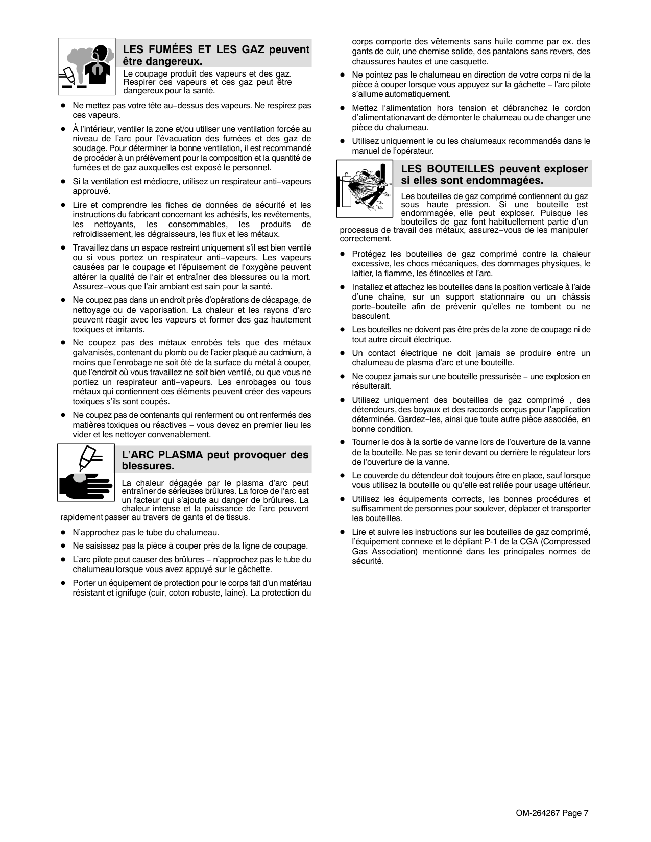 peuvent entraîner des brûlures aux yeux et à la peau. Porter un protecteur facial (casque ou écran) muni d’un filtre de teinte appropriée pour protéger le visage et les yeux des rayons et des étincelles quand on coupe ou observe le travail de coupe. Pour tous les courants de coupe inférieurs à 300 ampères, la norme AN- SI Z49.1 (voir section Normes de sécurité) recommande une opacité de grade 9 (grade minimum de 8). Cette norme ajoute qu’un filtre plus pâle peut être utilisé si l’arc est caché par la pièce. Comme c’est normalement le cas pour le coupage à faible courant, les opa- cités de filtres suggérées au Tableau 1 sont à la disposition de l’opérateur au besoin. Porter des lunettes de sécurité à coques latérales sous votre casque ou écran facial. Ayez recours à des écrans protecteurs ou à des rideaux pour protéger les autres contre les rayonnements, les étincelles et les éblouissements; prévenez toute personne sur les lieux de ne pas regarder l’arc. Porter un équipement de protection pour le corps fait d’un matériau résistant et ignifuge (cuir, coton robuste, laine). La protection du corps comporte des vêtements sans huile comme par ex. des gants de cuir, une chemise solide, des pantalons sans revers, des chaussures hautes et une casquette. Tableau 1. Protection des yeux pour le coupage au plasma d’arc Intensité de courant en ampères Filtre de teinte (minimum) Moins de 20 no. 4 20 − 40 no. 5 40 − 60 no. 6 60 − 100 no. 8 Certaines applications de coupage produisent un bruit constant, ce qui peut endommager l’ouïe si le niveau sonore dépasse les limites permises par l’OSHA (reportez−vous aux Principales normes de sécurité). LE BRUIT peut endommager l’ouïe. Utilisez des protège−tympans ou un serre−tête antibruit si le niveau sonore est élevé. Prévenez toute personne sur les lieux du danger relié au bruit.OM-264267 Page 7 Le coupage produit des vapeurs et des gaz. Respirer ces vapeurs et ces gaz peut être dangereux pour la santé. LES FUMÉES ET LES GAZ peuvent être dangereux. Ne mettez pas votre tête au−dessus des vapeurs. Ne respirez pas ces vapeurs. À l’intérieur, ventiler la zone et/ou utiliser une ventilation forcée au niveau de l’arc pour l’évacuation des fumées et des gaz de soudage. Pour déterminer la bonne ventilation, il est recommandé de procéder à un prélèvement pour la composition et la quantité de fumées et de gaz auxquelles est exposé le personnel. Si la ventilation est médiocre, utilisez un respirateur anti−vapeurs approuvé. Lire et comprendre les fiches de données de sécurité et les instructions du fabricant concernant les adhésifs, les revêtements, les nettoyants, les consommables, les produits de refroidissement, les dégraisseurs, les flux et les métaux. Travaillez dans un espace restreint uniquement s’il est bien ventilé ou si vous portez un respirateur anti−vapeurs. Les vapeurs causées par le coupage et l’épuisement de l’oxygène peuvent altérer la qualité de l’air et entraîner des blessures ou la mort. Assurez−vous que l’air ambiant est sain pour la santé. Ne coupez pas dans un endroit près d’opérations de décapage, de nettoyage ou de vaporisation. La chaleur et les rayons d’arc peuvent réagir avec les vapeurs et former des gaz hautement toxiques et irritants. Ne coupez pas des métaux enrobés tels que des métaux galvanisés, contenant du plomb ou de l’acier plaqué au cadmium, à moins que l’enrobage ne soit ôté de la surface du métal à couper, que l’endroit où vous travaillez ne soit bien ventilé, ou que vous ne portiez un respirateur anti−vapeurs. Les enrobages ou tous métaux qui contiennent ces éléments peuvent créer des vapeurs toxiques s’ils sont coupés. Ne coupez pas de contenants qui renferment ou ont renfermés des matières toxiques ou réactives − vous devez en premier lieu les vider et les nettoyer convenablement. L’ARC PLASMA peut provoquer des blessures. La chaleur dégagée par le plasma d’arc peut entraîner de sérieuses brûlures. La force de l’arc est un facteur qui s’ajoute au danger de brûlures. La chaleur intense et la puissance de l’arc peuvent rapidement passer au travers de gants et de tissus. N’approchez pas le tube du chalumeau. Ne saisissez pas la pièce à couper près de la ligne de coupage. L’arc pilote peut causer des brûlures − n’approchez pas le tube du chalumeau lorsque vous avez appuyé sur le gâchette. Porter un équipement de protection pour le corps fait d’un matériau résistant et ignifuge (cuir, coton robuste, laine). La protection du corps comporte des vêtements sans huile comme par ex. des gants de cuir, une chemise solide, des pantalons sans revers, des chaussures hautes et une casquette. Ne pointez pas le chalumeau en direction de votre corps ni de la pièce à couper lorsque vous appuyez sur la gâchette − l’arc pilote s’allume automatiquement. Mettez l’alimentation hors tension et débranchez le cordon d’alimentation avant de démonter le chalumeau ou de changer une pièce du chalumeau. Utilisez uniquement le ou les chalumeaux recommandés dans le manuel de l’opérateur. Les bouteilles de gaz comprimé contiennent du gaz sous haute pression. Si une bouteille est endommagée, elle peut exploser. Puisque les bouteilles de gaz font habituellement partie d’un processus de travail des métaux, assurez−vous de les manipuler correctement. LES BOUTEILLES peuvent exploser si elles sont endommagées. Protégez les bouteilles de gaz comprimé contre la chaleur excessive, les chocs mécaniques, des dommages physiques, le laitier, la flamme, les étincelles et l’arc. Installez et attachez les bouteilles dans la position verticale à l’aide d’une chaîne, sur un support stationnaire ou un châssis porte−bouteille afin de prévenir qu’elles ne tombent ou ne basculent. Les bouteilles ne doivent pas être près d